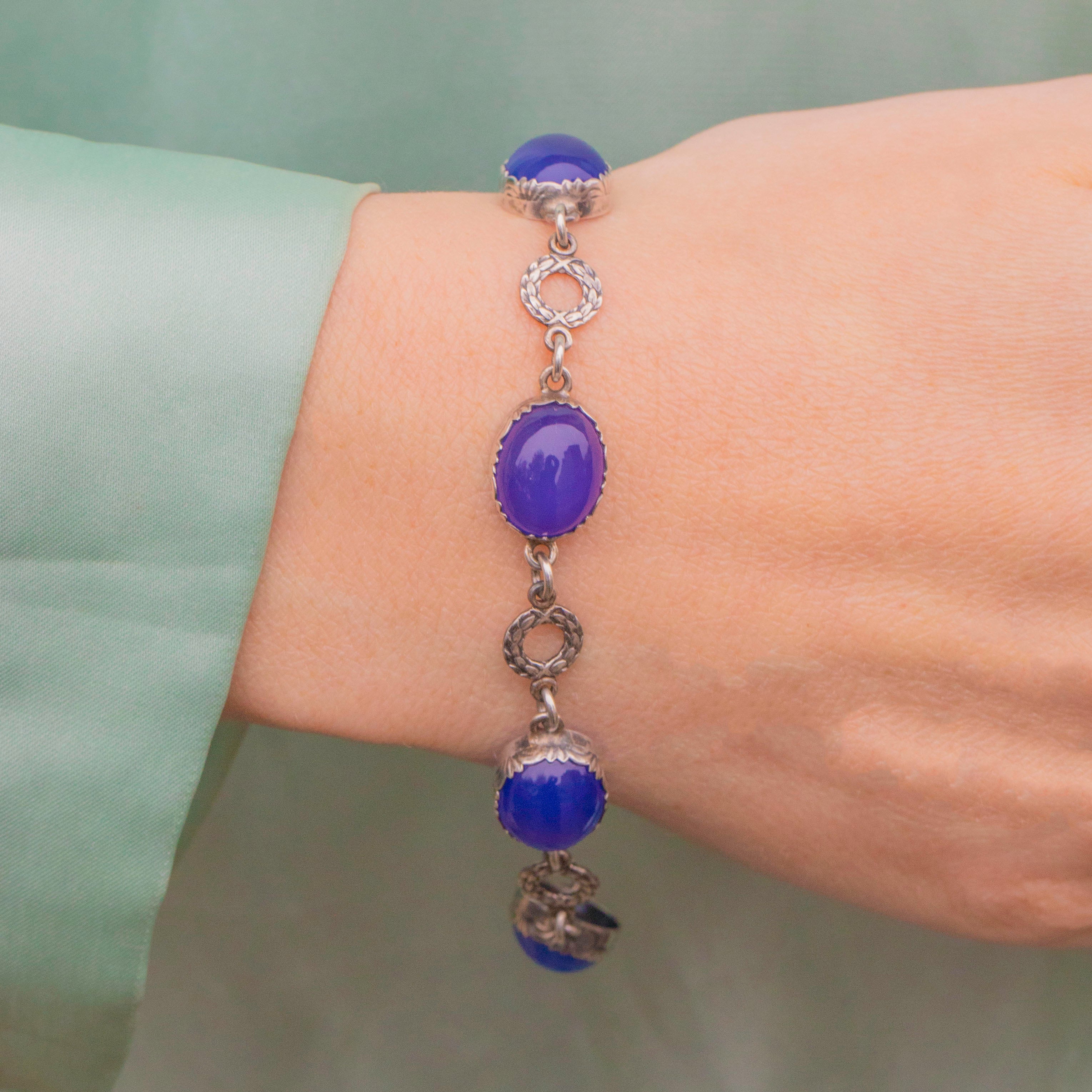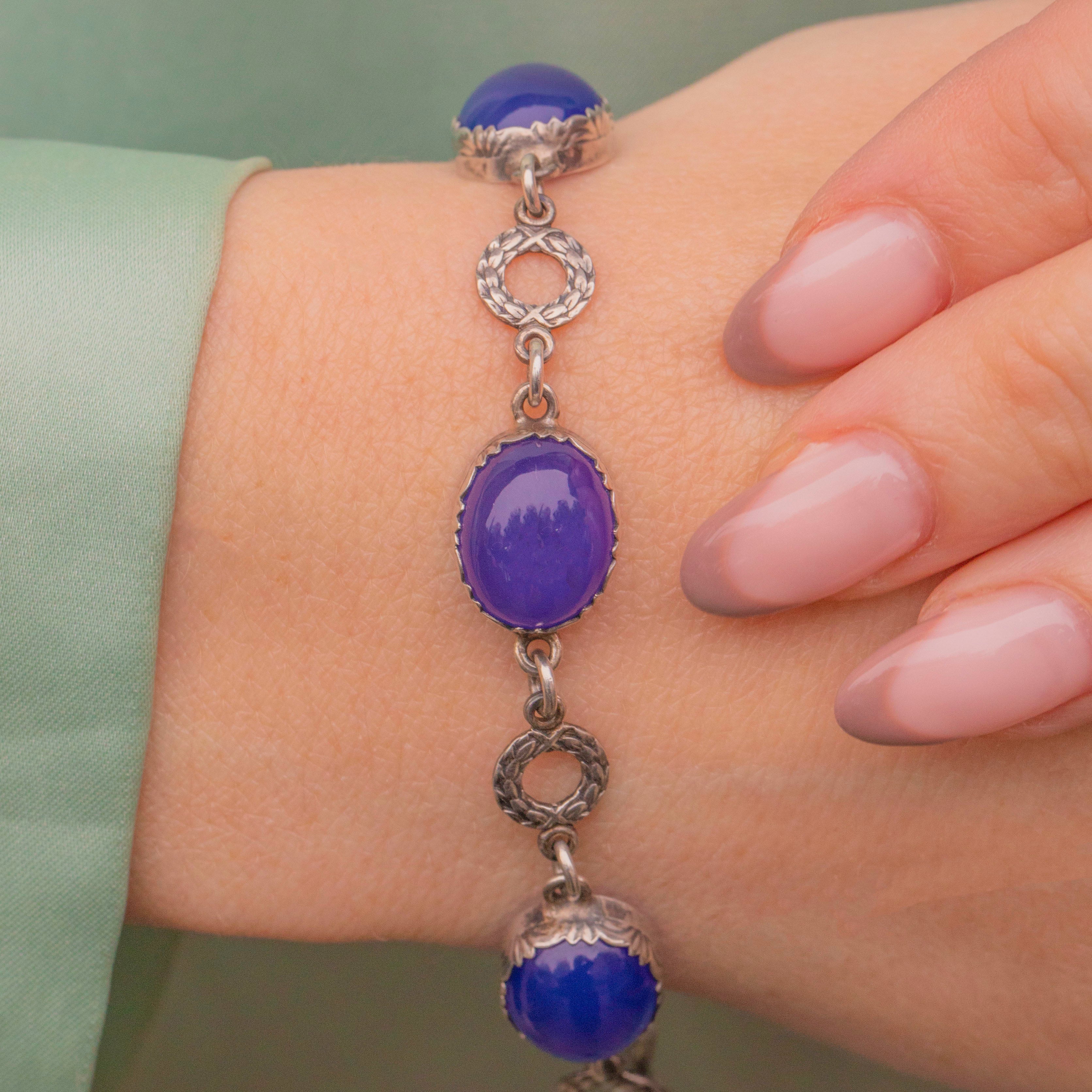 Foliate wreaths crafted from Sterling Silver bind this Arts and Crafts bracelet together to form her 7.5 inch length. Created during one of the most prevalent eras for developing organic and artistic designs, this Silver Chalcedony bracelet is bursting with intricate detail.