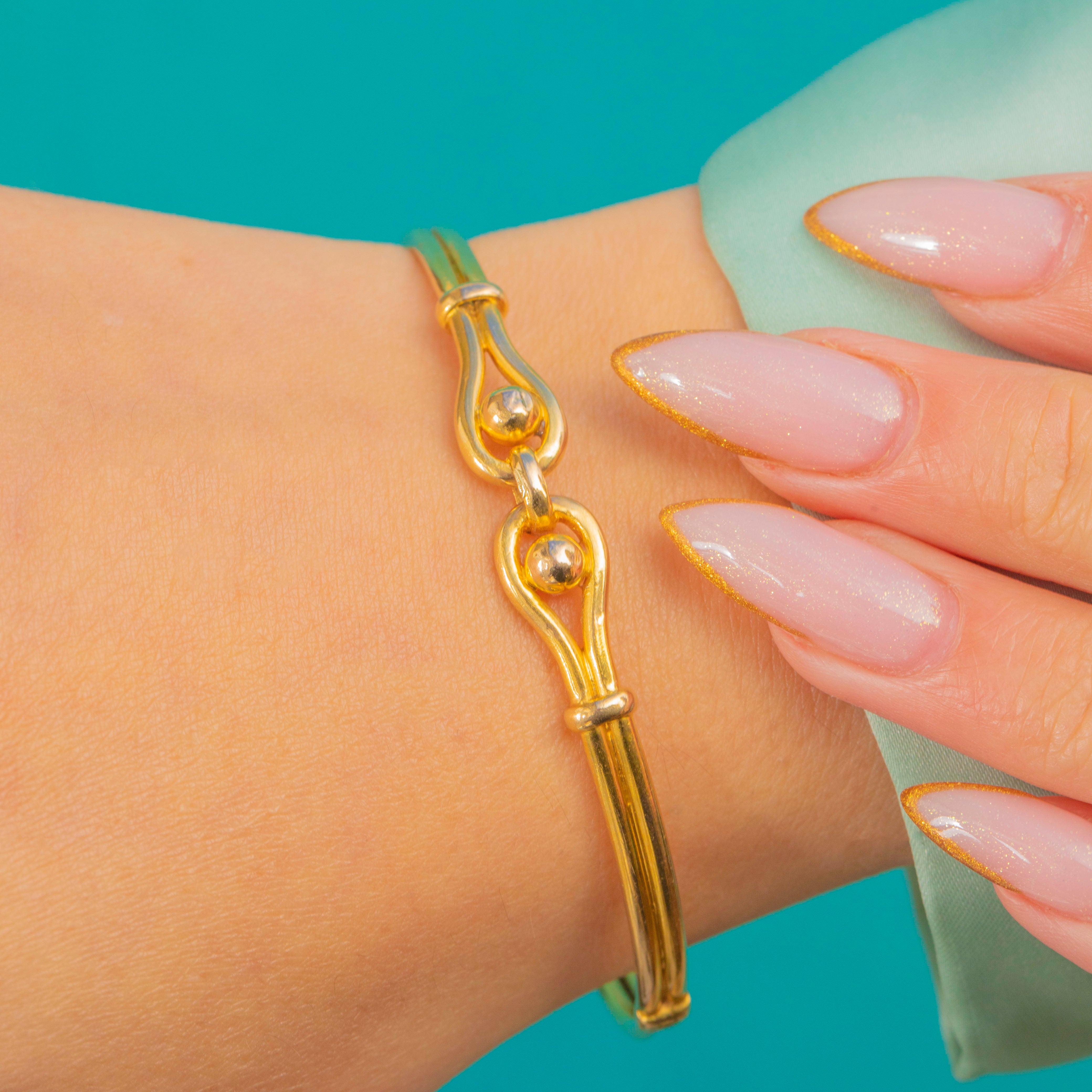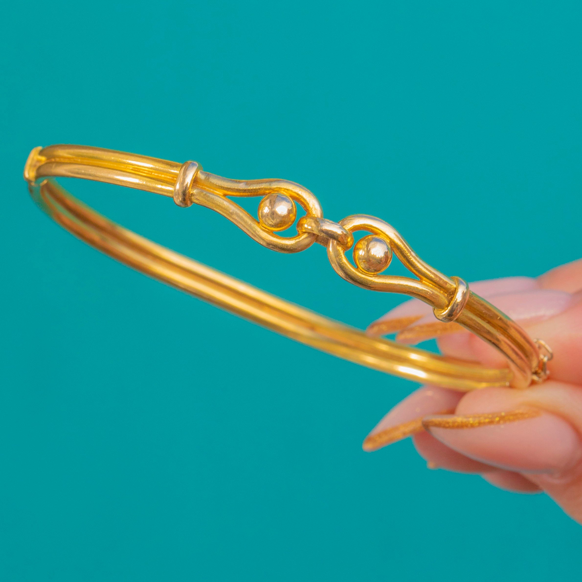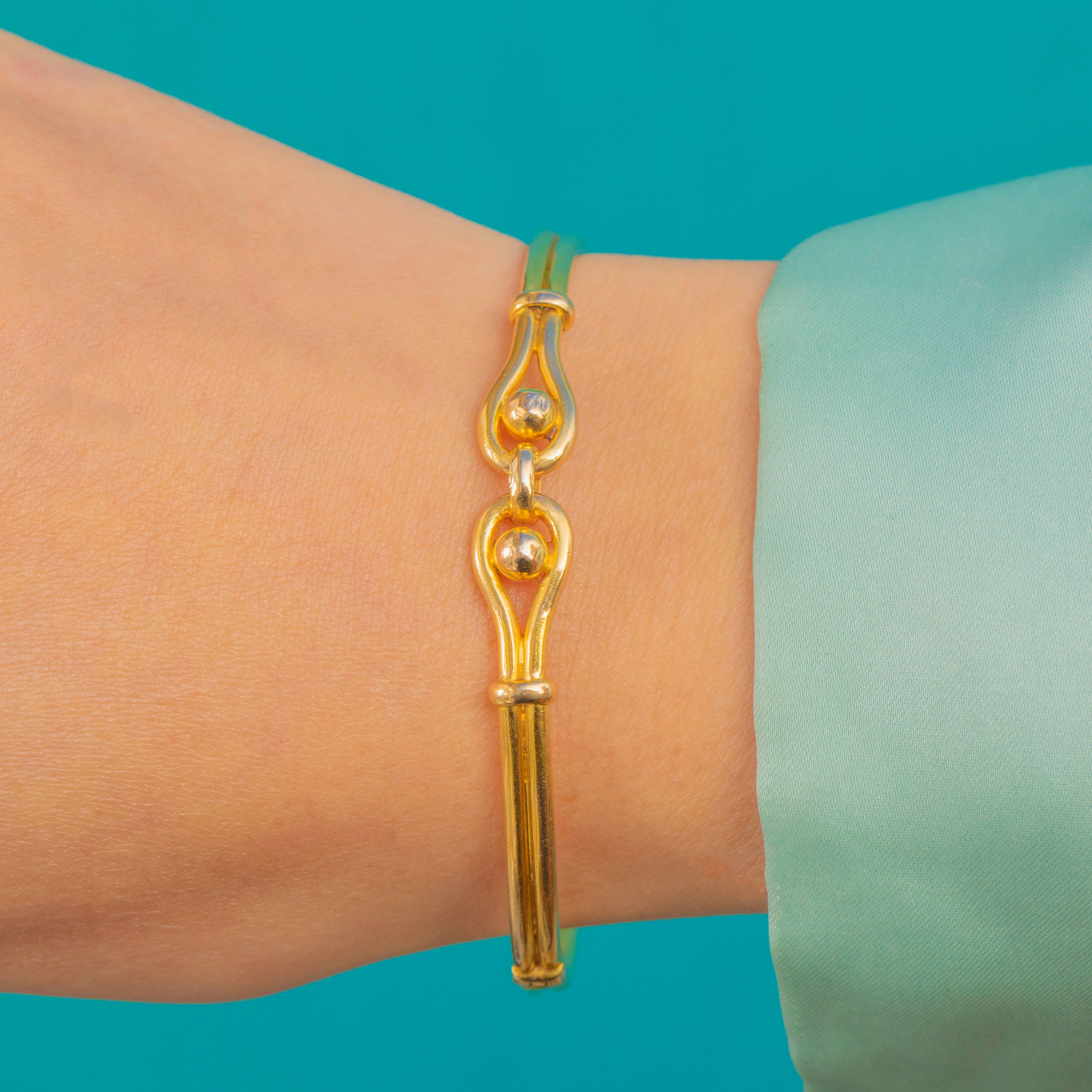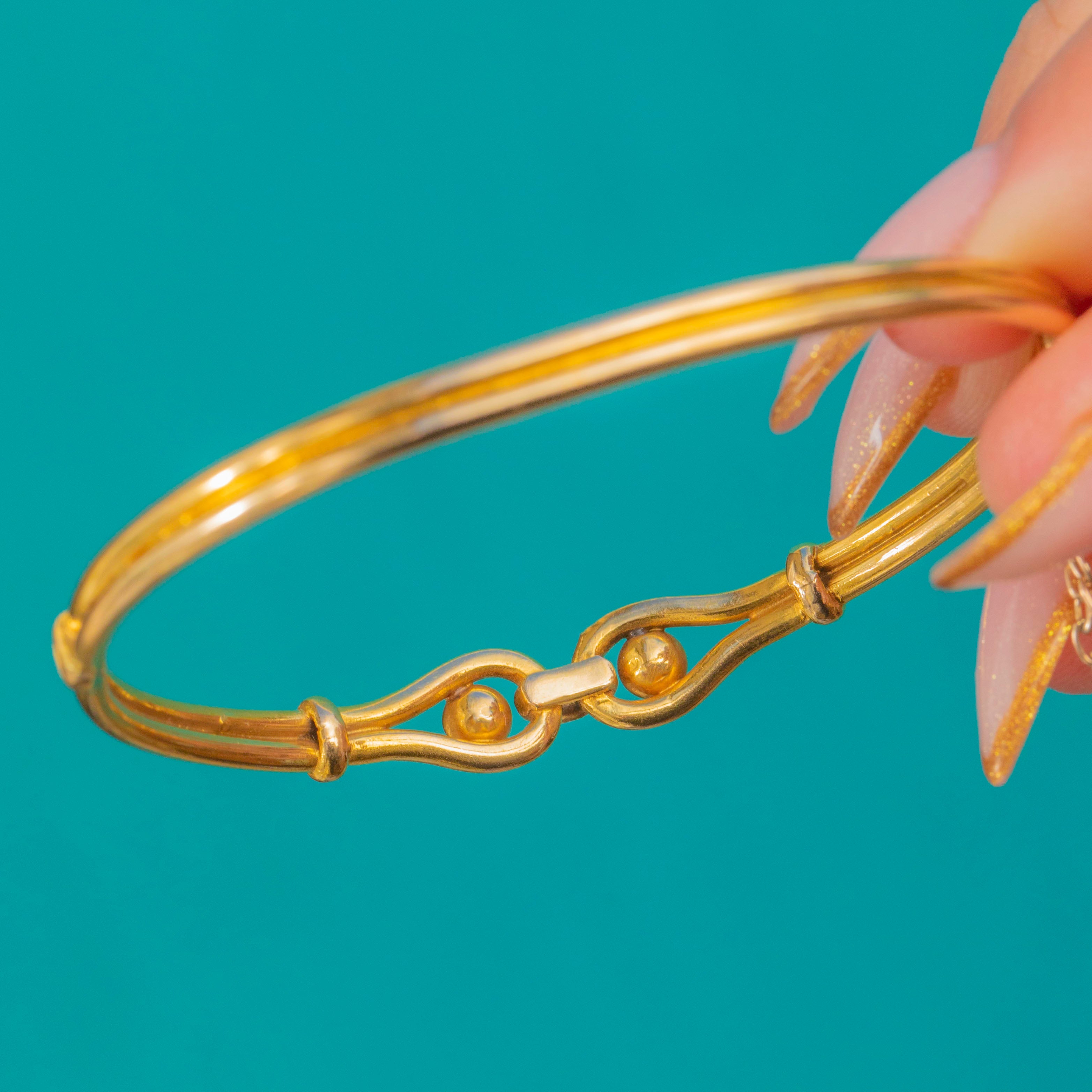 A beautiful Victorian high-carat Gold knot bangle in the most glorious buttery yellow tone, crafted circa 1890–1900. The front is formed into an elegant entwined knot symbolising unity, love and protection—classic Victorian sentiment in a wonderfully sculptural form.
