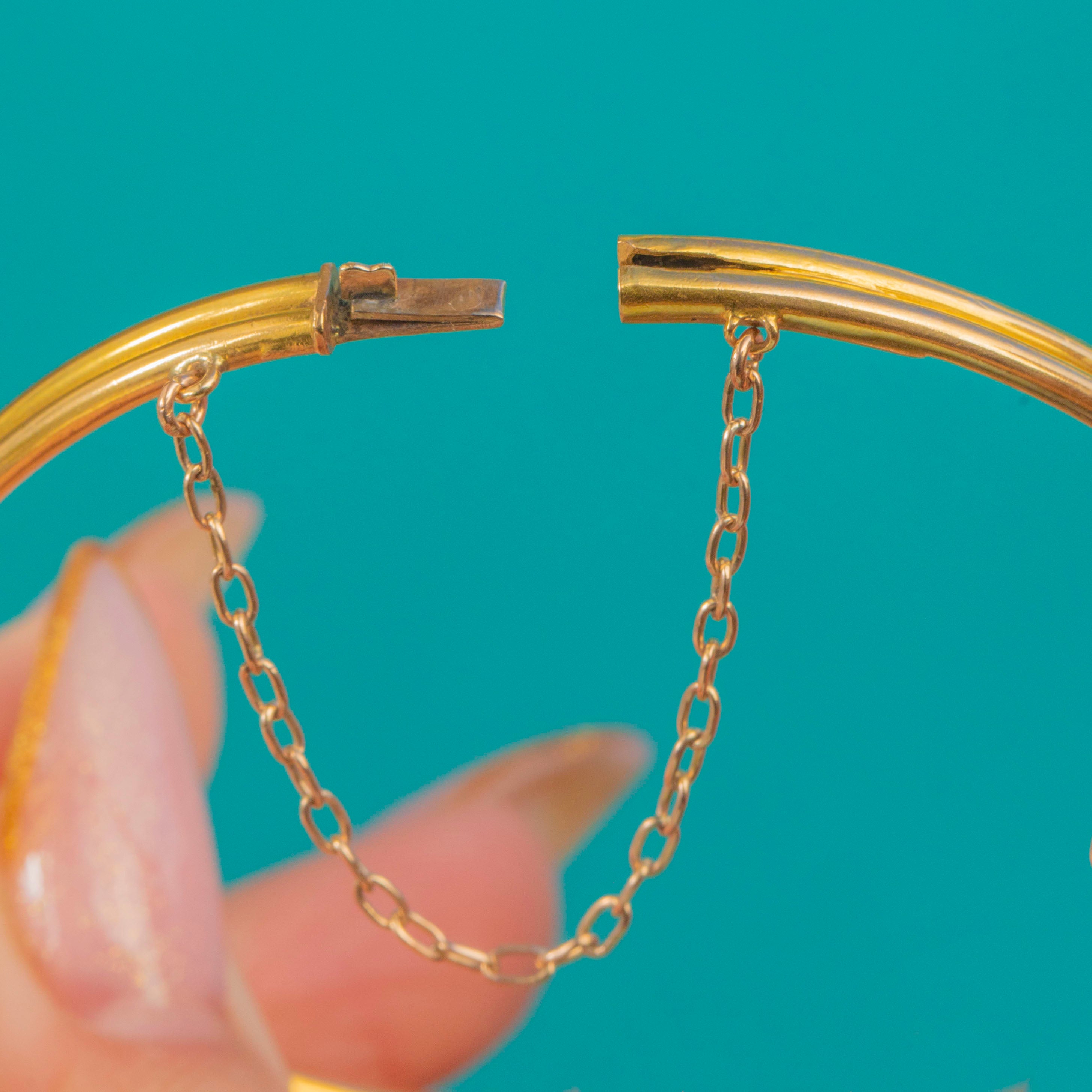 Made in rich 15ct Gold with its original 9ct Gold safety chain, this bangle has a luxurious weight and a bright, glowing finish. It opens and closes securely with a firm snap, offering both beauty and practicality in one timeless antique jewel.