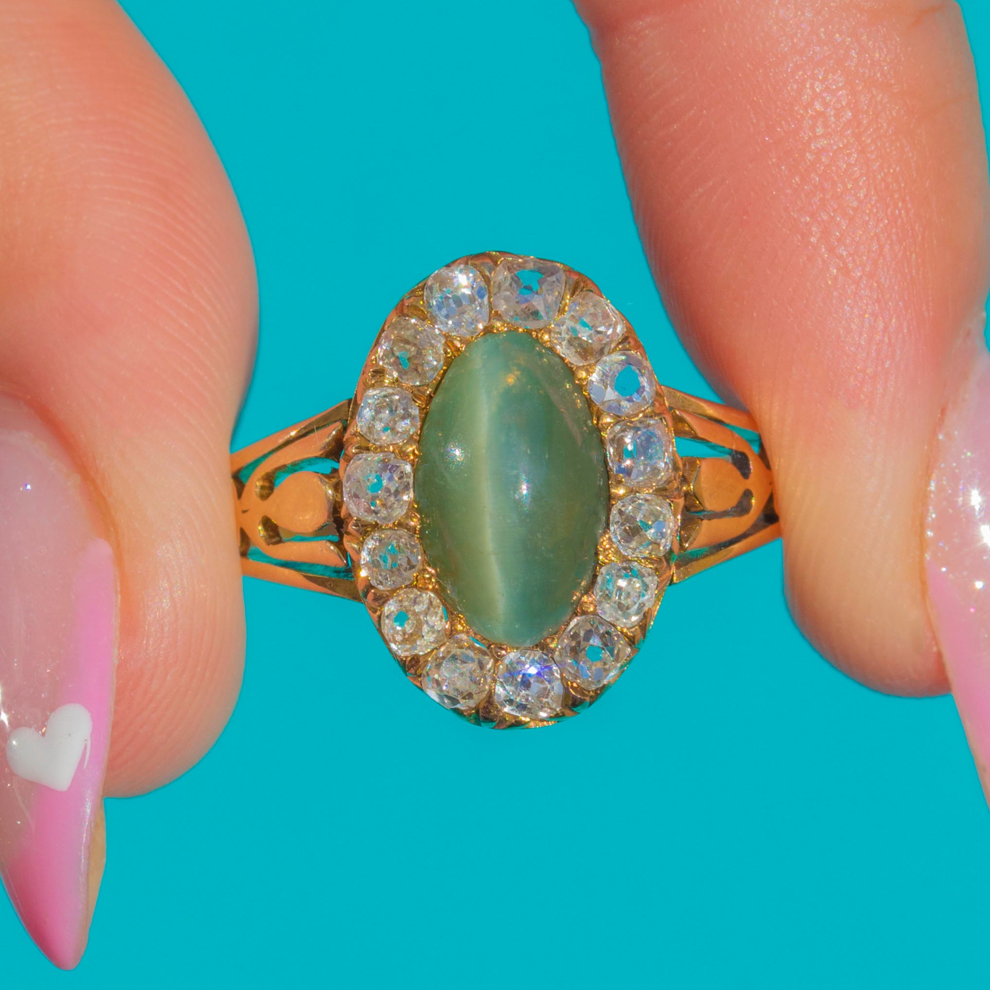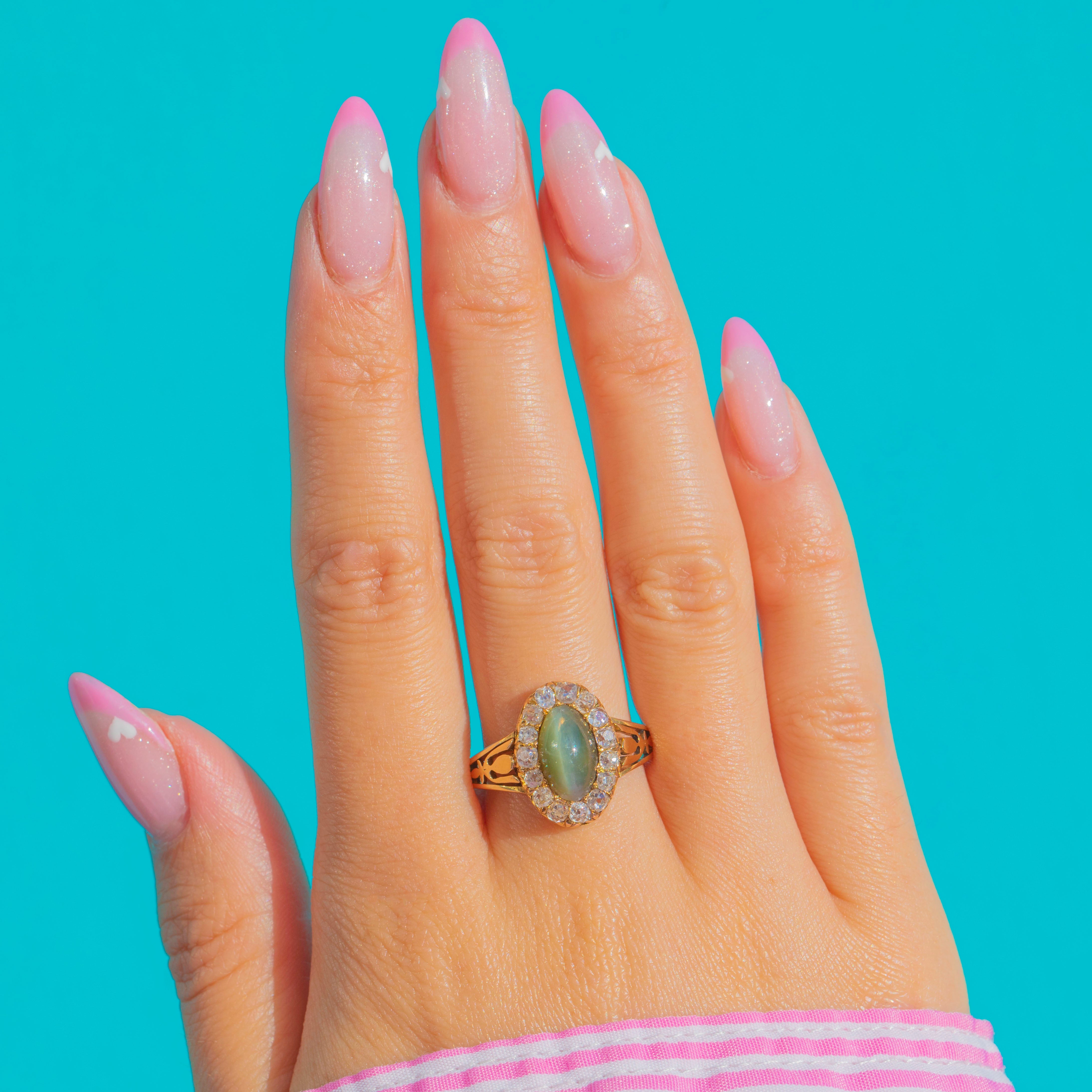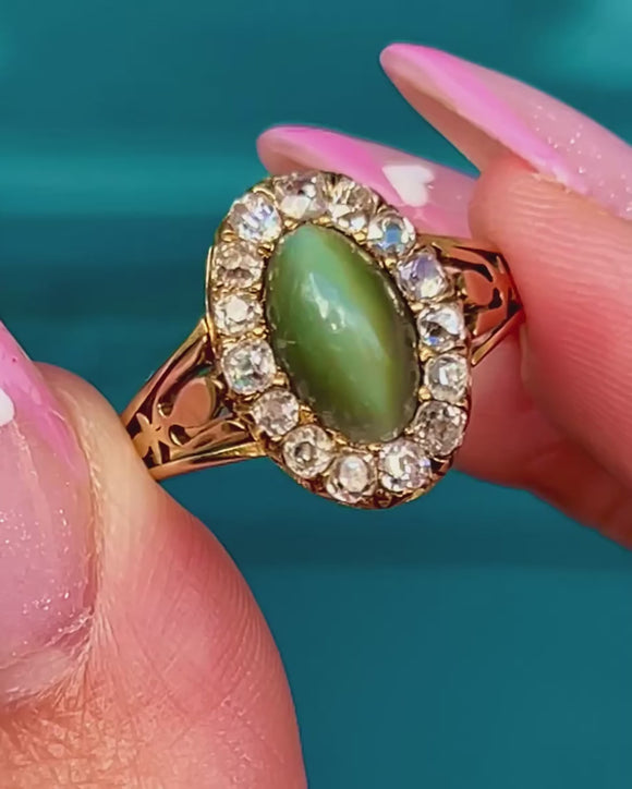 Victorian Cat's Eye Chrysoberyl Diamond Halo Ring in 18ct Gold