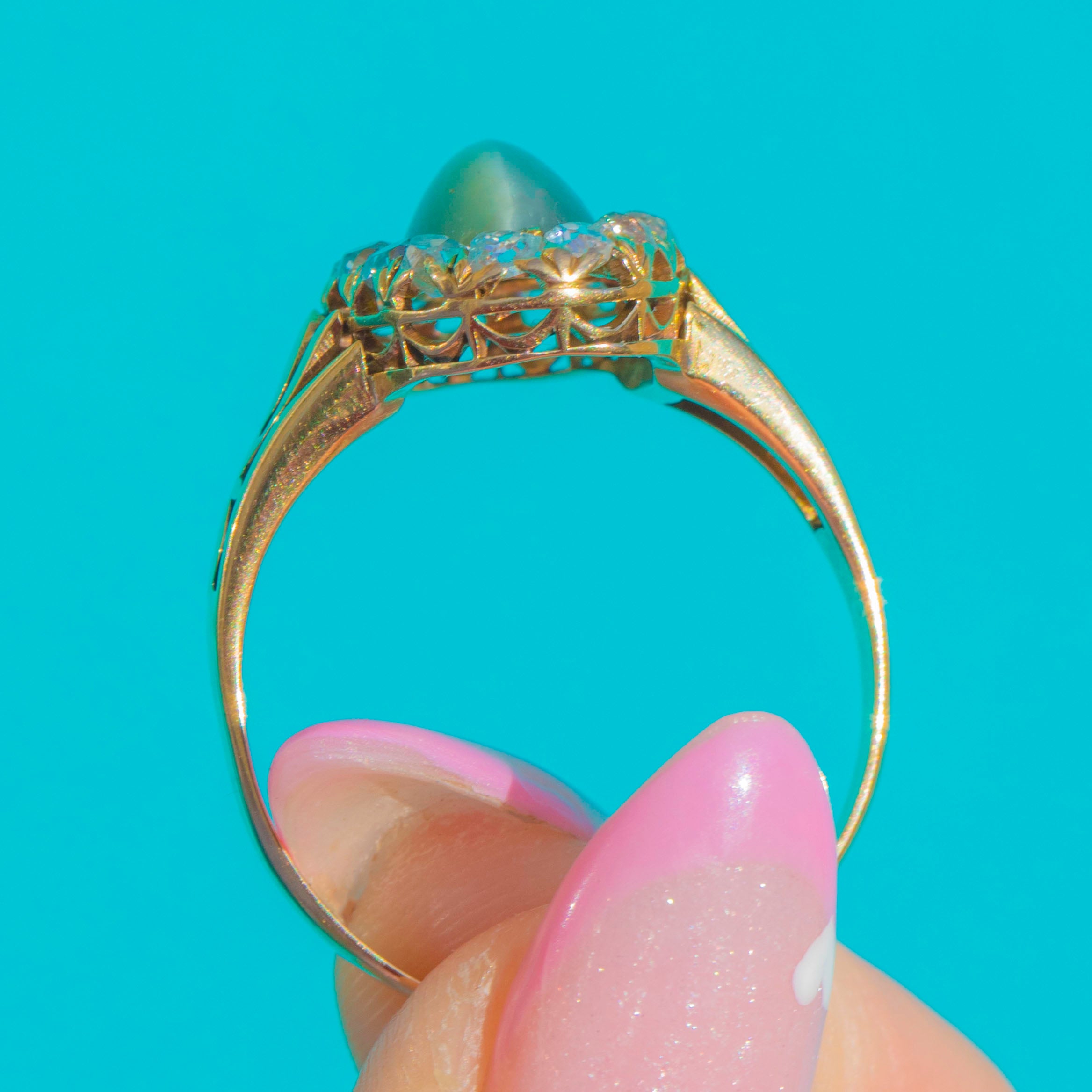MATERIALS: Tests as 18ct Gold, Cat’s Eye Chrysoberyl, Old Mine Cut Diamonds (0.45ct).