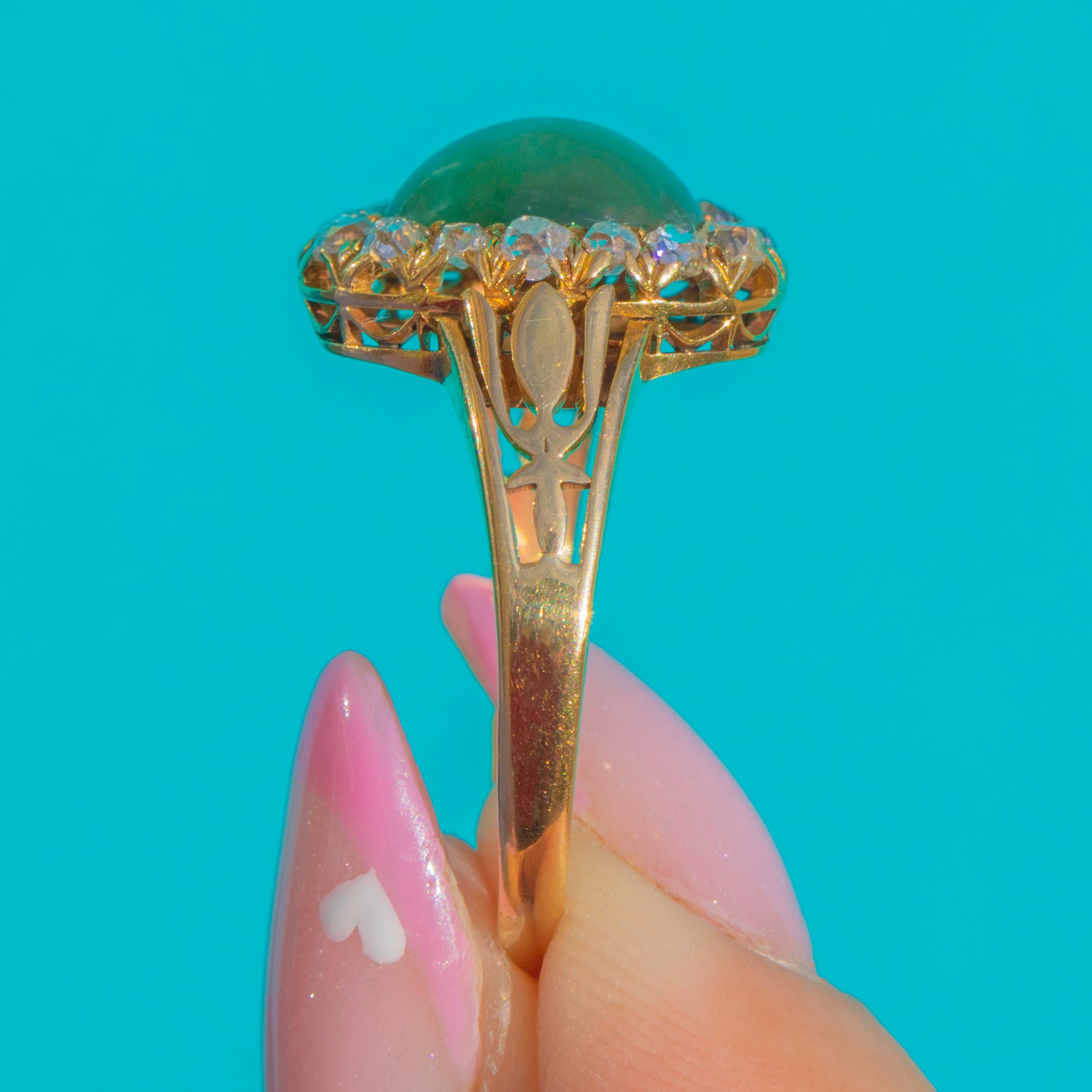 This exceptional Victorian ring centres on a mesmerising Cat’s Eye Chrysoberyl, its silken band of light surrounded by a sparkling halo of Old Mine Cut Diamonds. Crafted in rich 18ct Gold, the design captures the refined elegance and opulence of the late 19th century, blending natural beauty with artisanal skill.