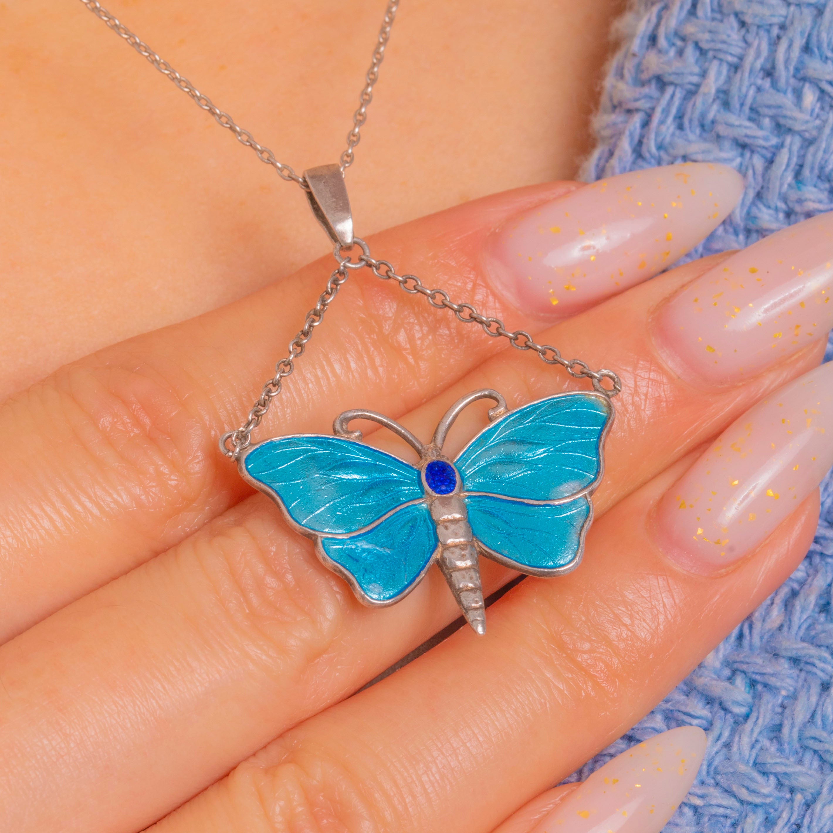 A charming Charles Horner butterfly pendant from the Art Deco era, crafted in Sterling Silver with radiant blue translucent Enamel. The wings shimmer over engine-turned guilloché, graduating from sky to turquoise for a fresh, luminous glow. A small, deep blue Enamel accent sits at the thorax, while fine Silver antennaes and a smooth complete the refined silhouette.
