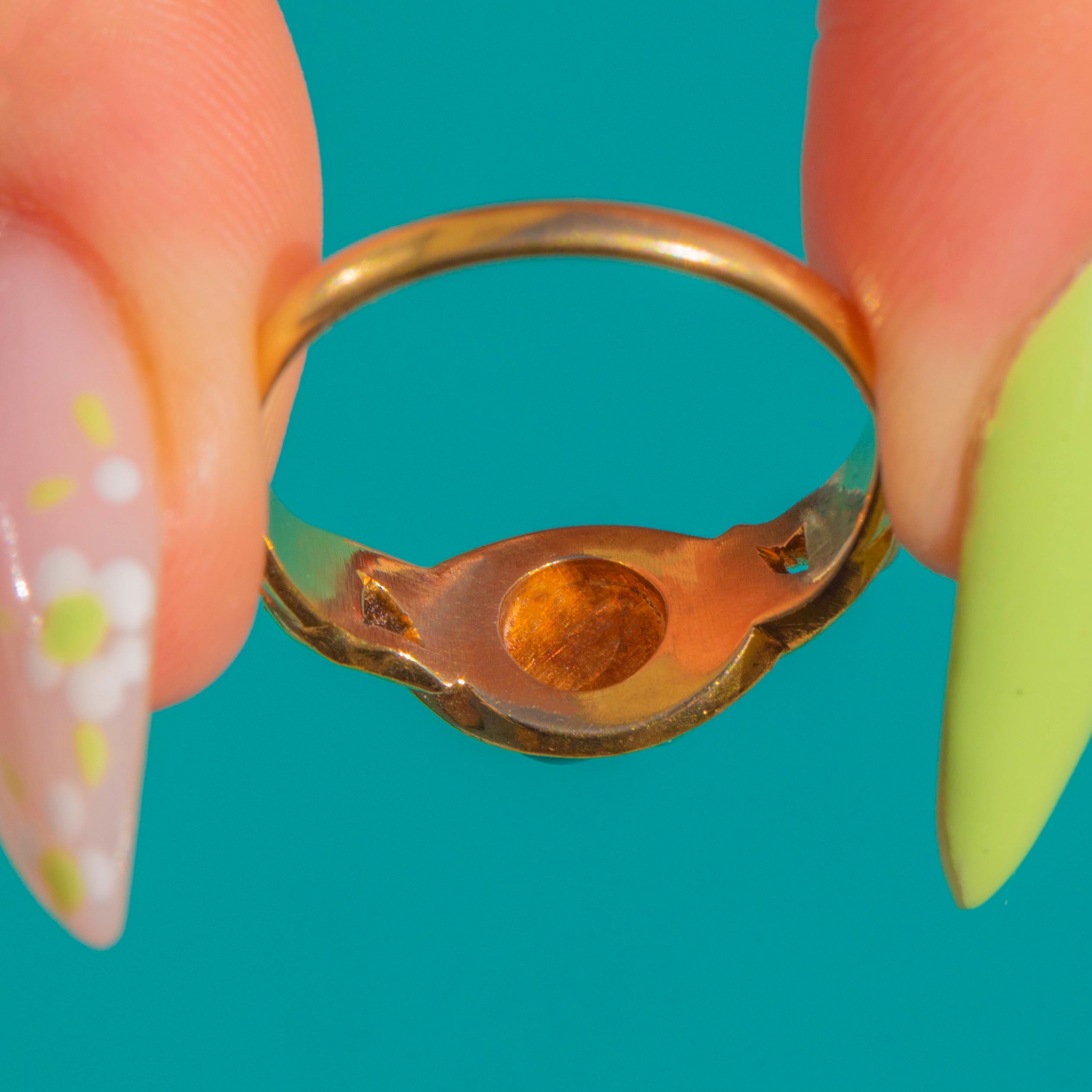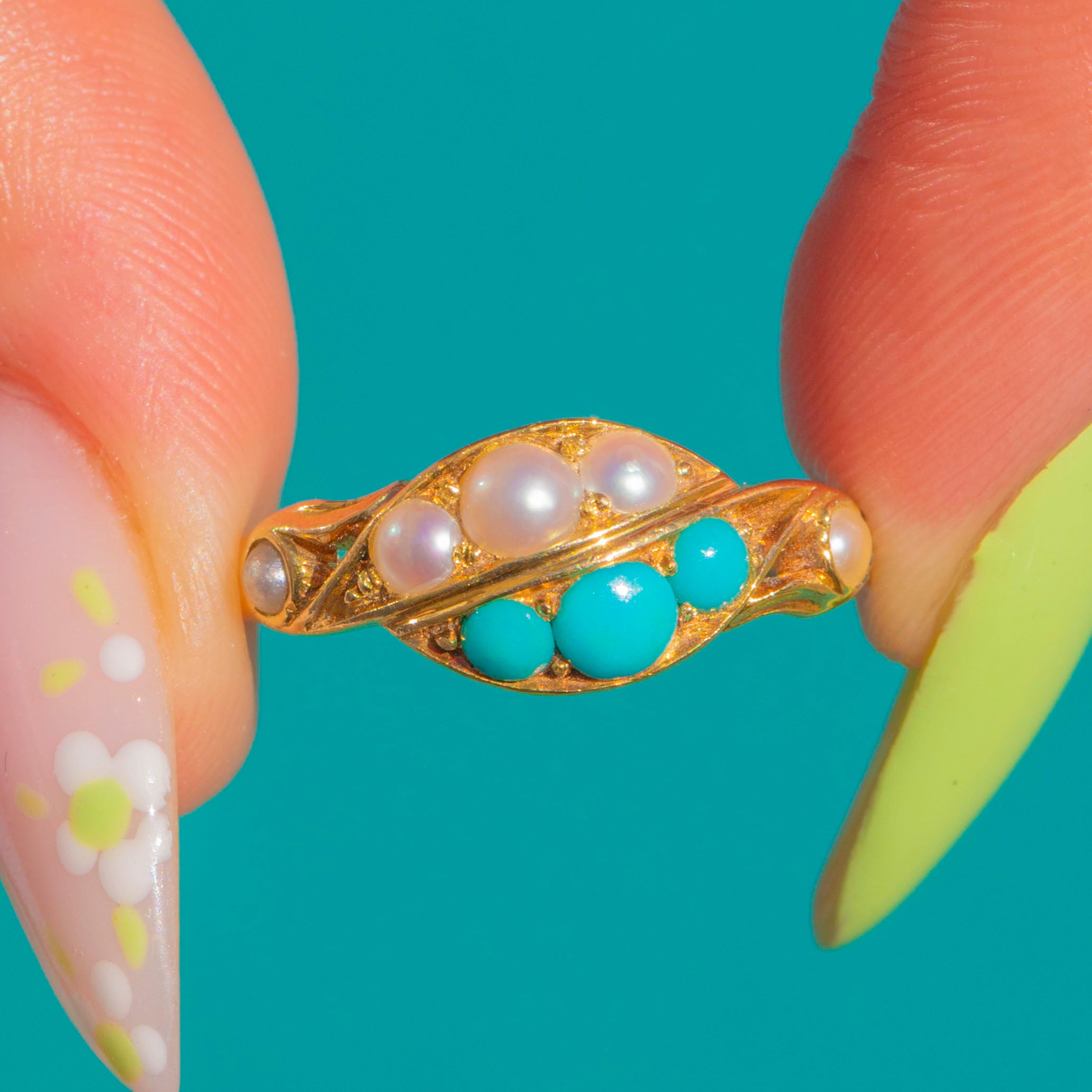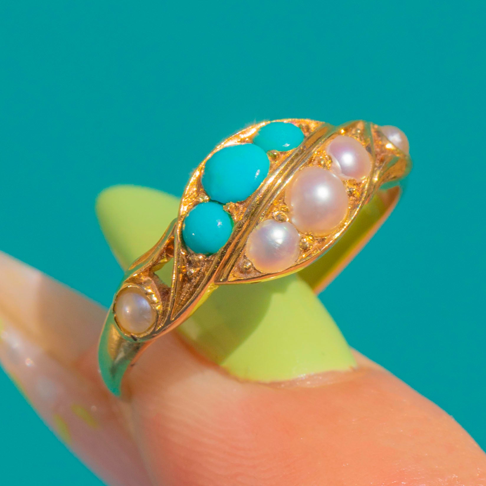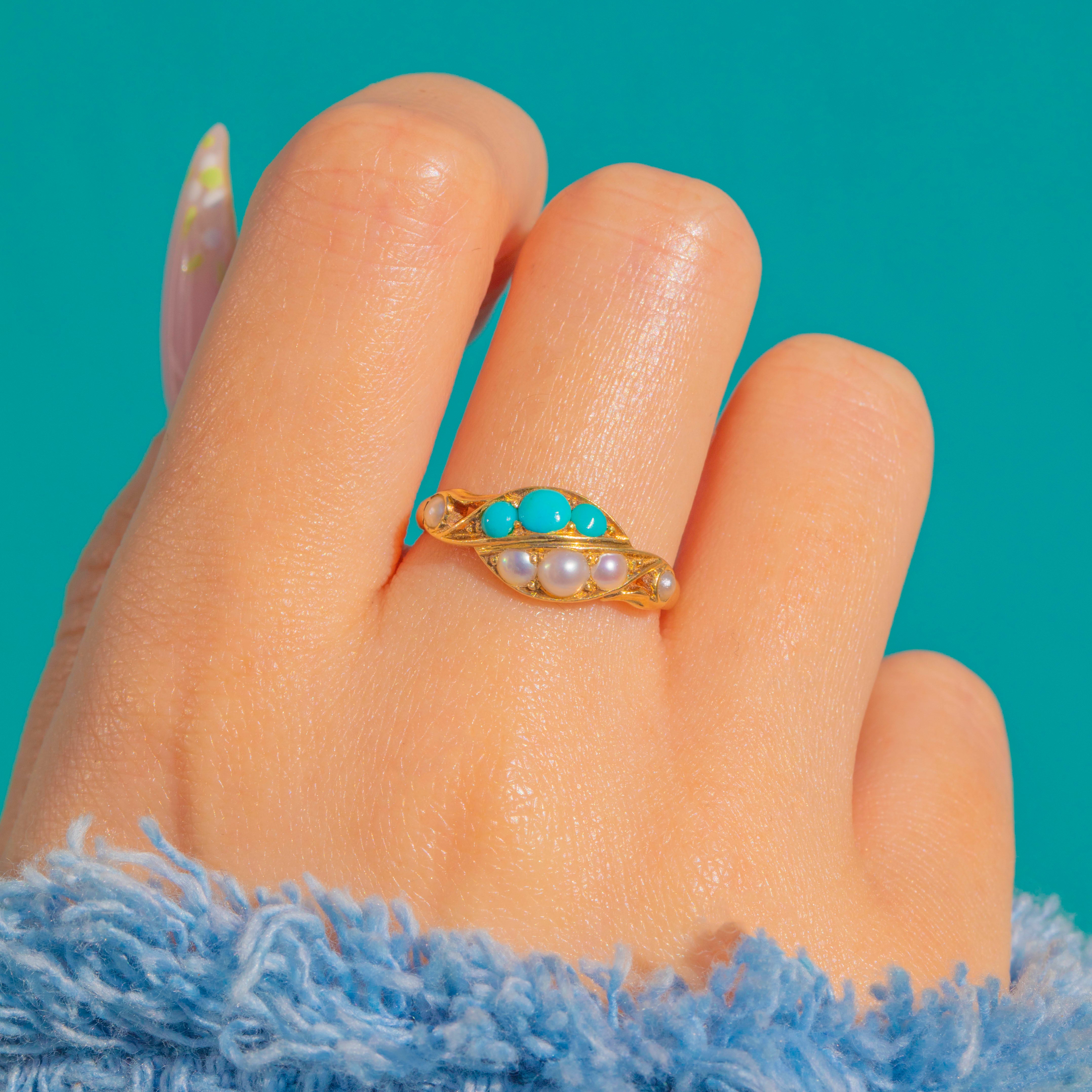 EXCELLENT: Stones are bright and secure with lovely lustre to the Pearls; under magnification, one Turquoise shows a minute abrasion that does not detract from wear. The 18ct Gold settings and slim shank show light, age-appropriate surface wear only, with crisp pierced and foliate detail. No obvious signs of resizing or restoration; a trace of old residue is visible inside one closed-back cup, noted for completeness.