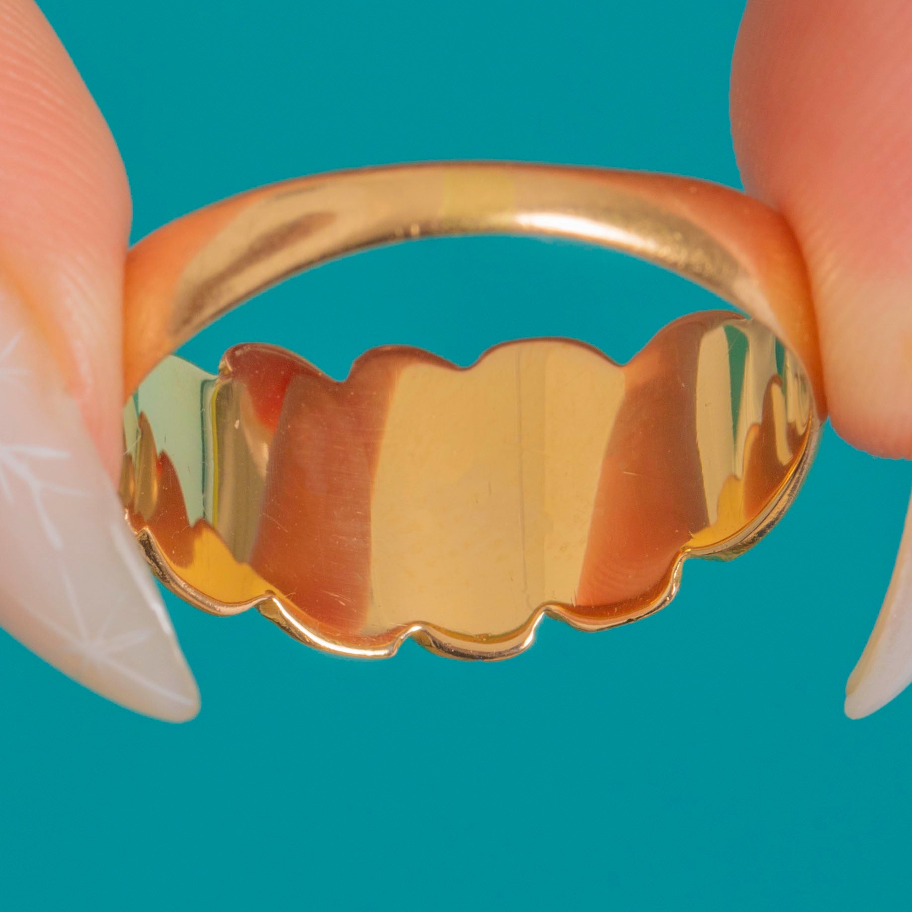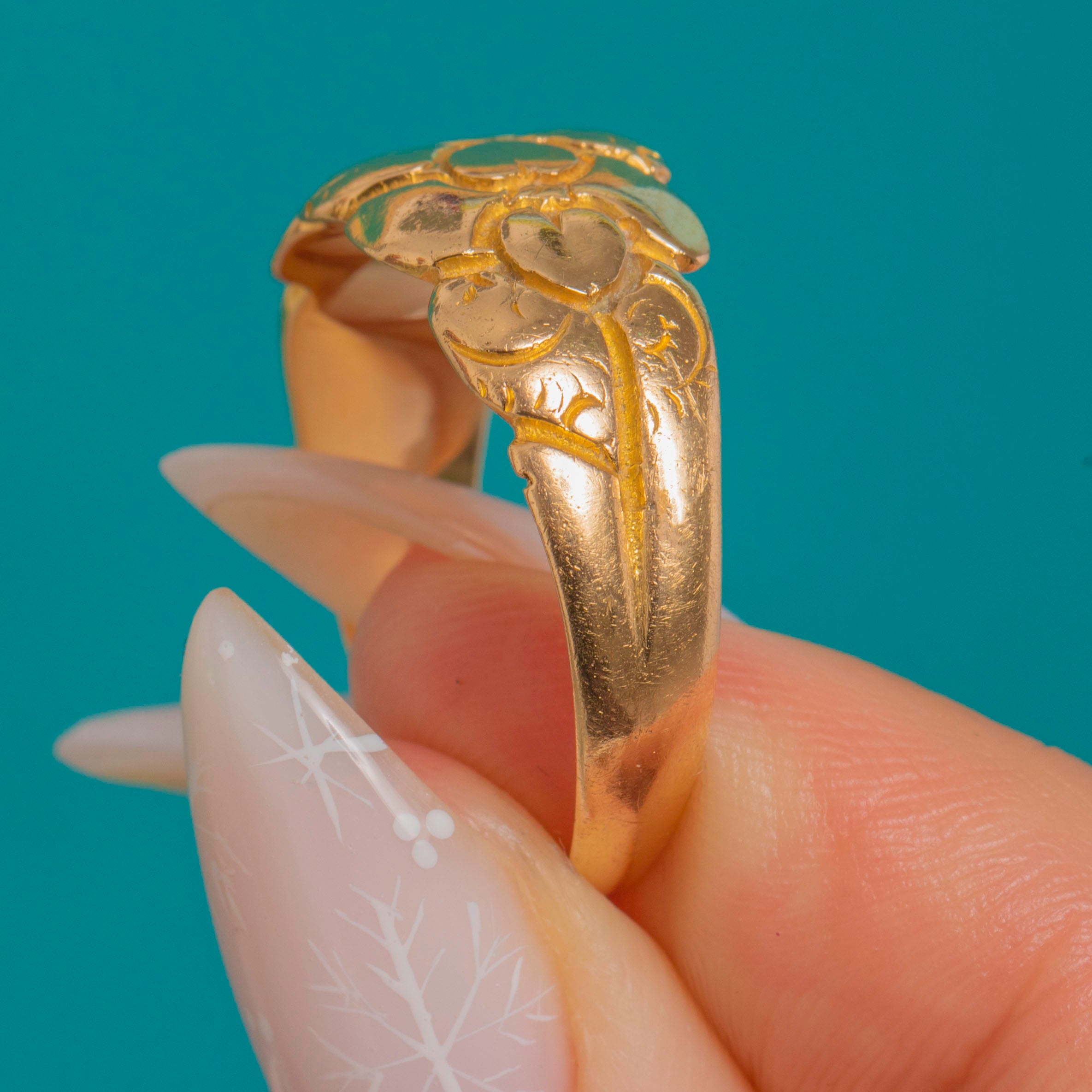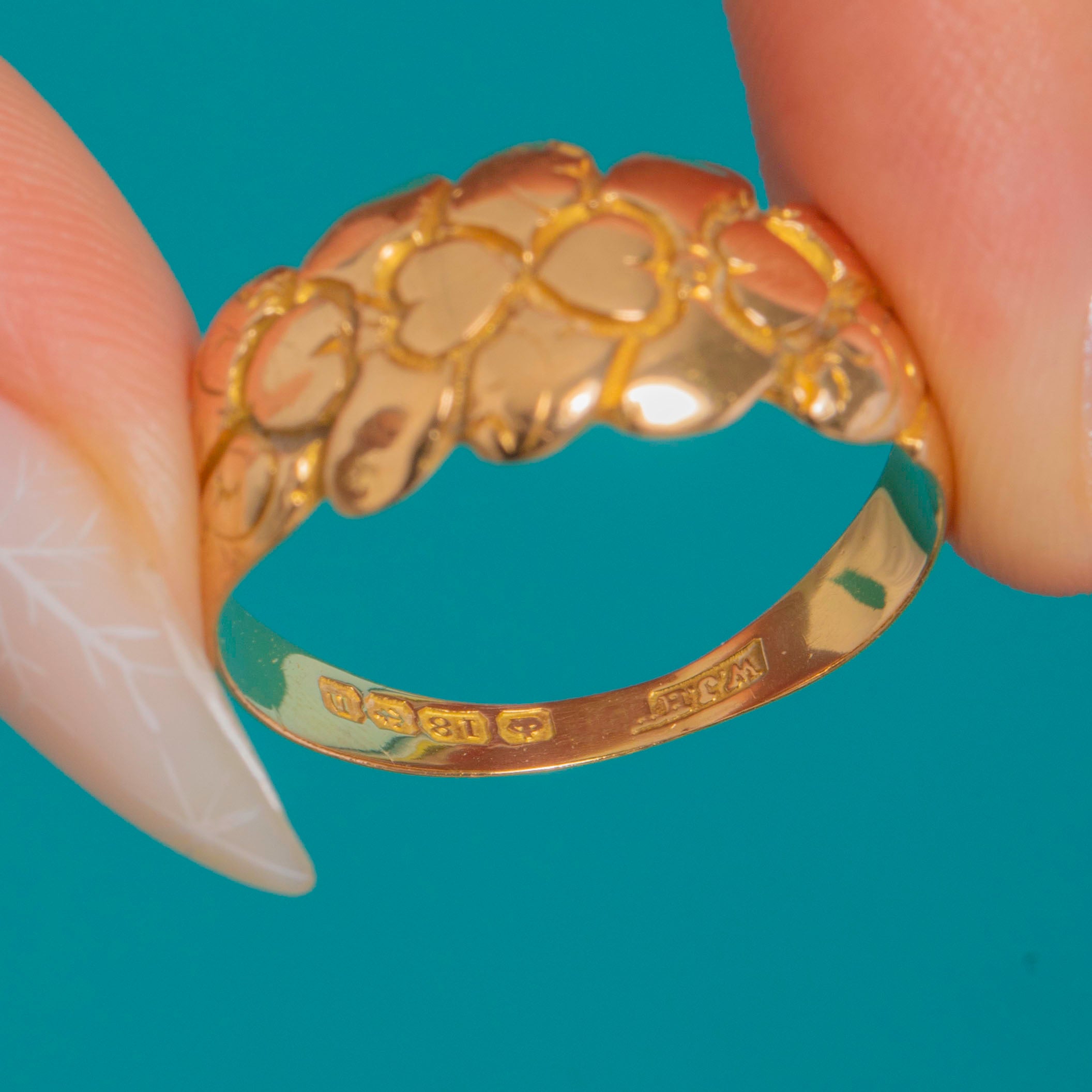 Fully hallmarked and dated to 1912, it’s a wonderful example of early 20th-century sentimentality rendered with substance and style. The tapering shank ensures a comfortable fit while the solid 18ct Gold lends a luxurious glow and reassuring heft—timeless, tactile, and eminently wearable.