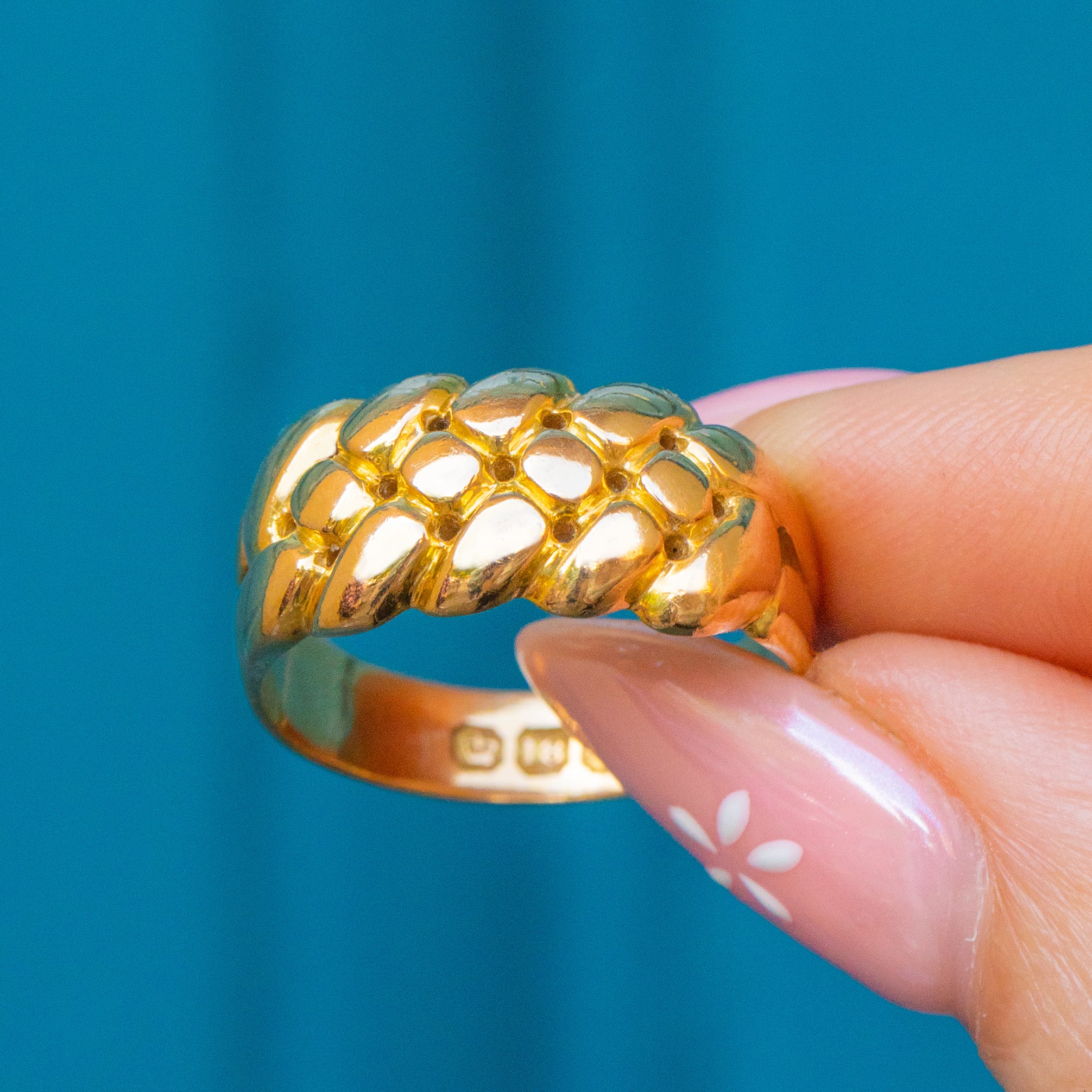 Wow, just look at this incredible chunky antique 18ct Gold keeper ring! Crafted entirely from richly saturated 18ct Gold forming her intricate knotted rows with pierced detailing, she's an eye-catching piece and perfect for daily wear.