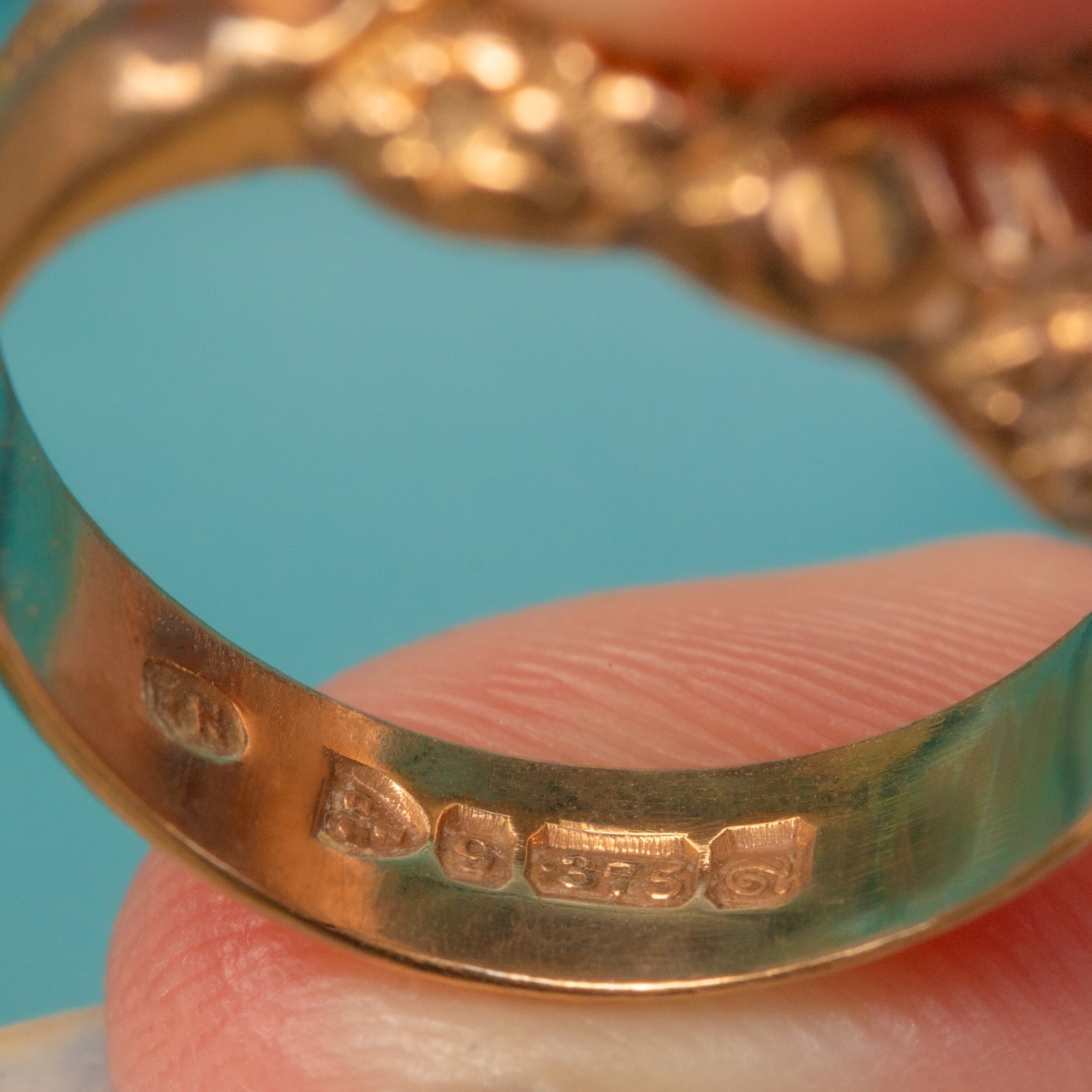 This chunky 9ct Gold ring is from the early 20th century, with a full set of hallmarks, including the rare Chester assay, dating to the year 1914.