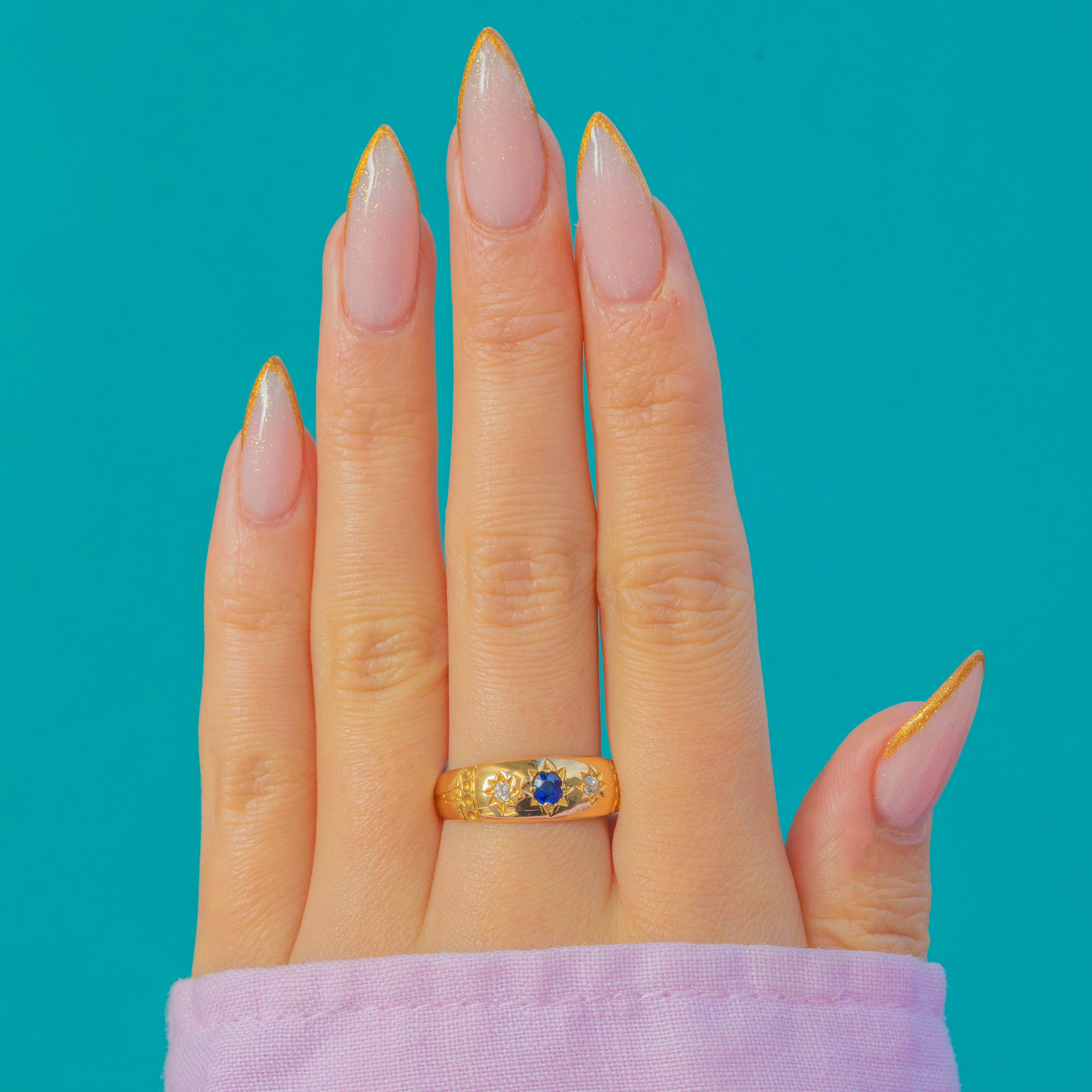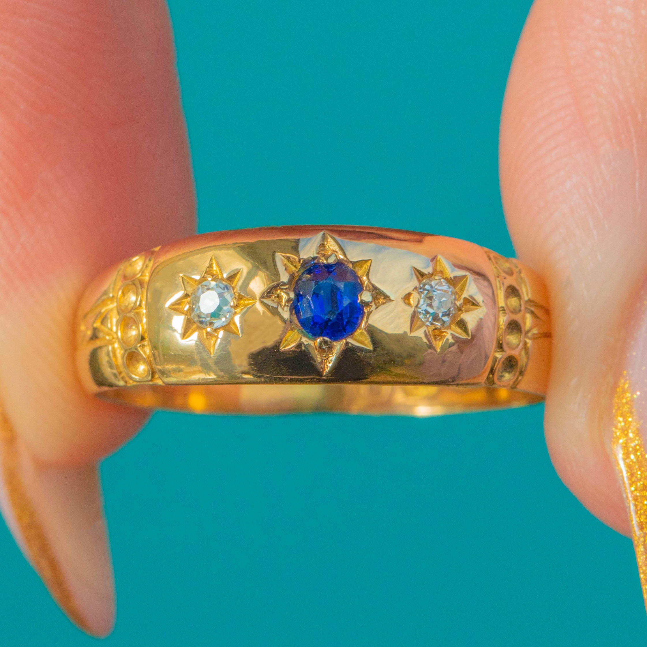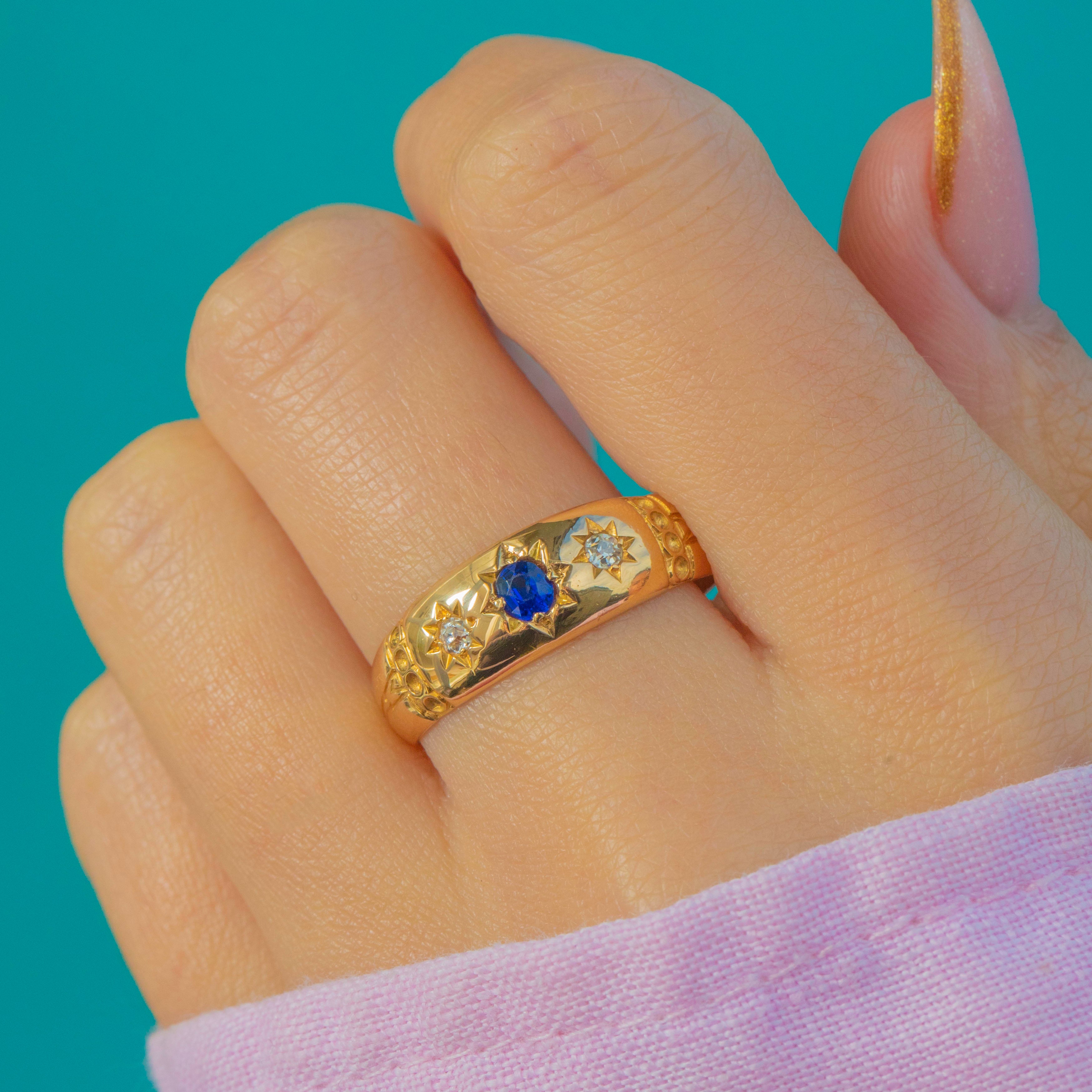 A bold and beautifully preserved late Victorian star-set ring crafted in bright 18ct Yellow Gold, fully hallmarked for Birmingham, 1899. The chunky band is set with a vivid royal blue natural Sapphire at the centre, flanked by two sparkling old mine cut Diamonds in crisp engraved starbursts—a classic and highly sought-after Victorian design.