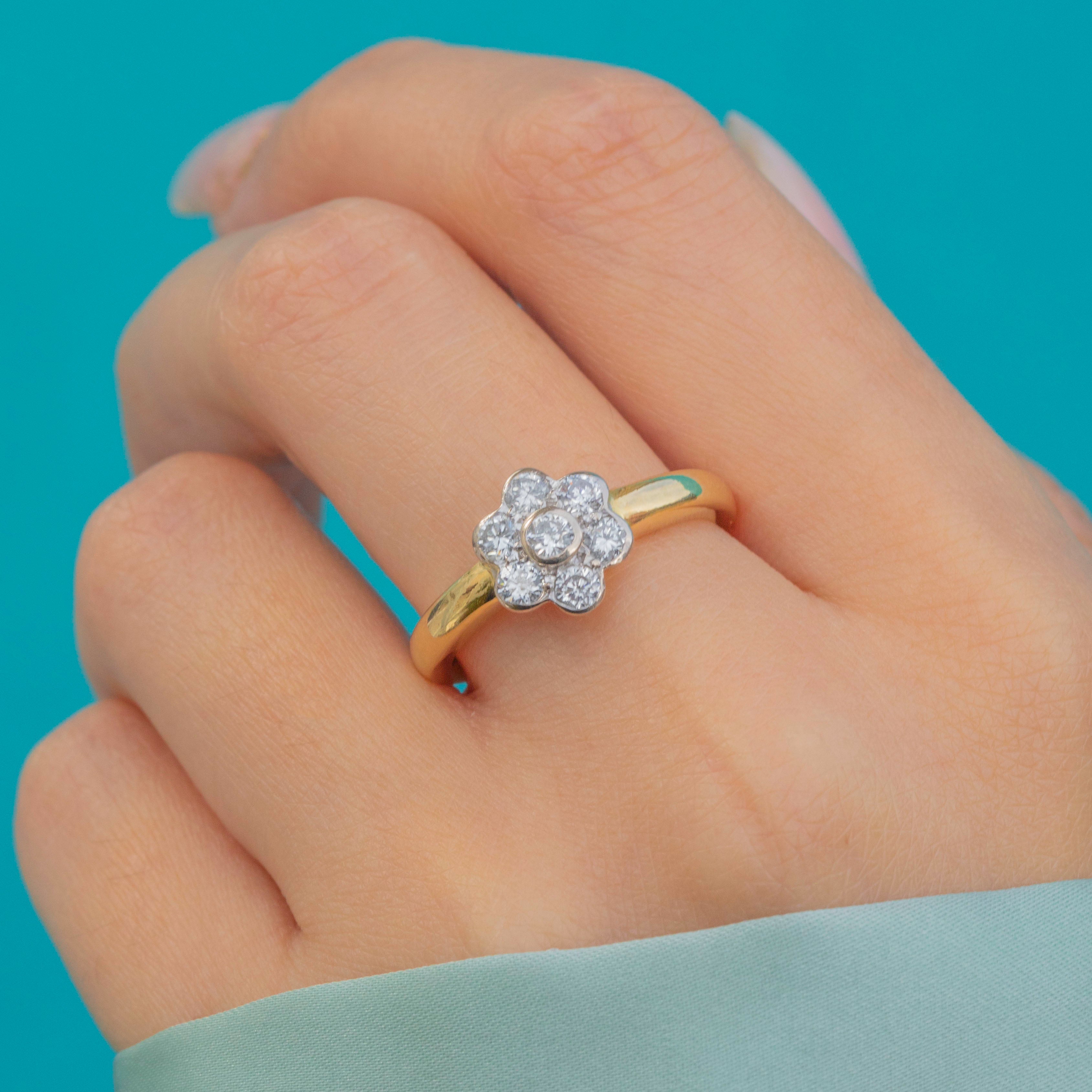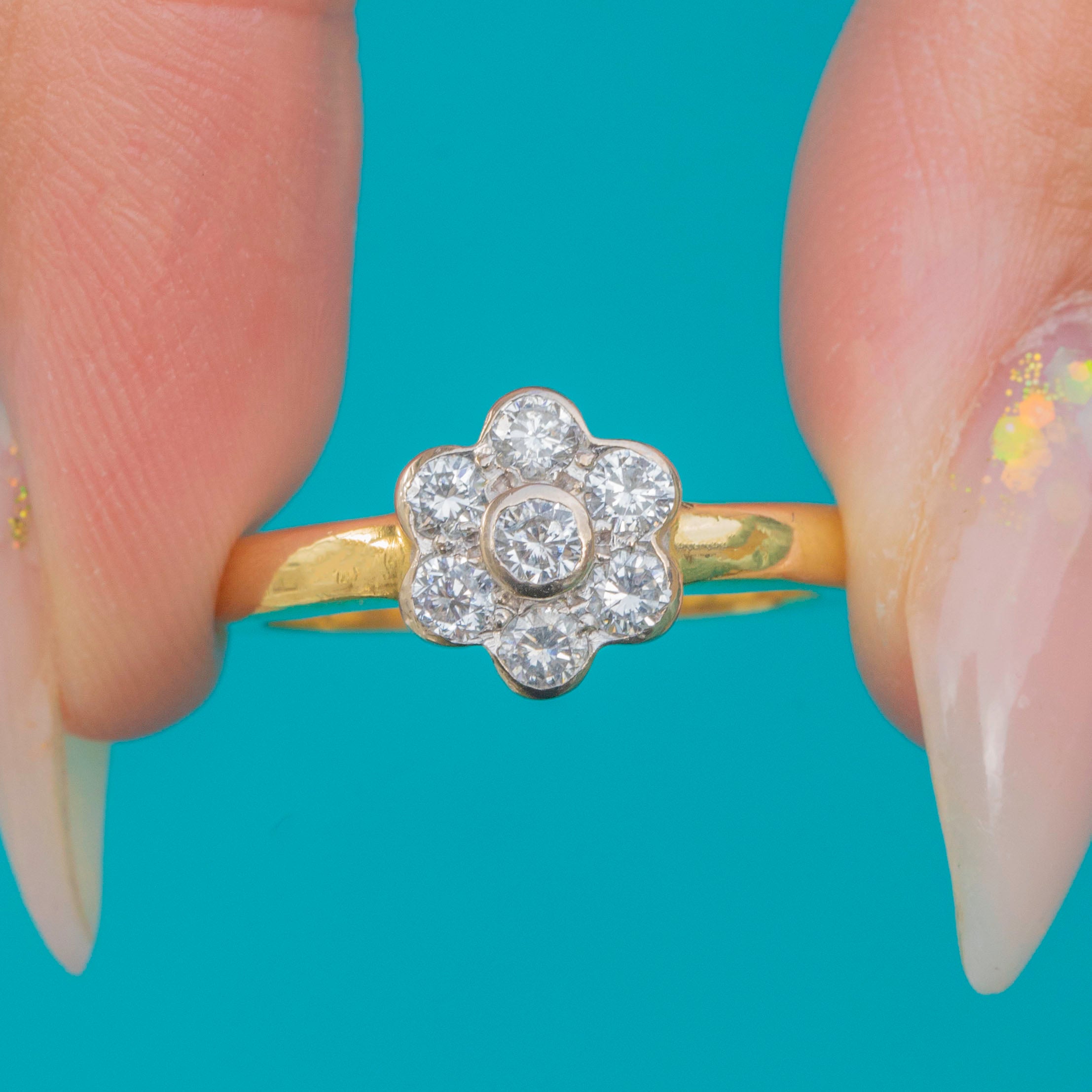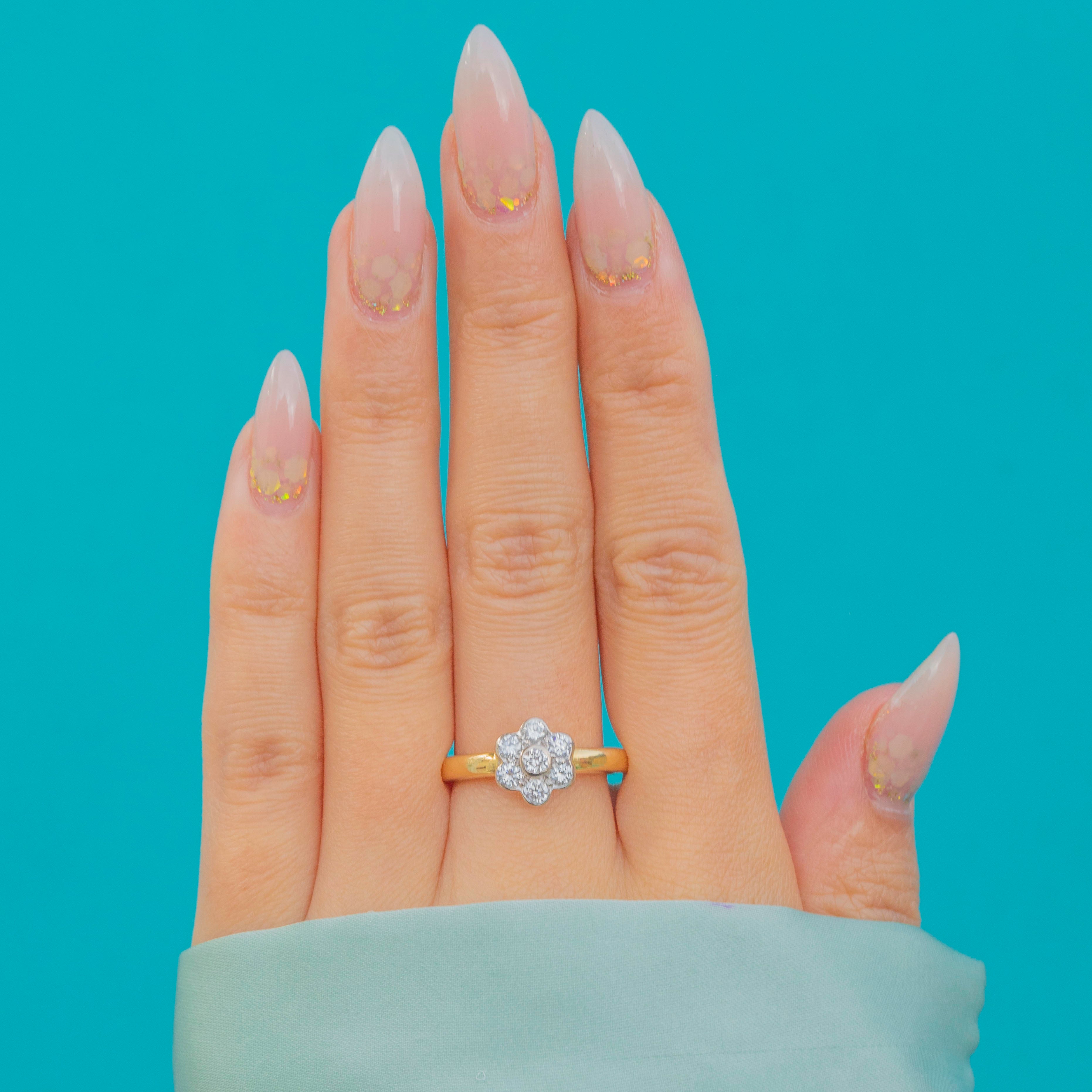 This elegant Vintage flower cluster ring is crafted in rich 18ct Gold and set with 0.50cts of bright, lively Diamonds. The sparkling stones form a neat floral arrangement, giving the ring a timeless and feminine appeal.