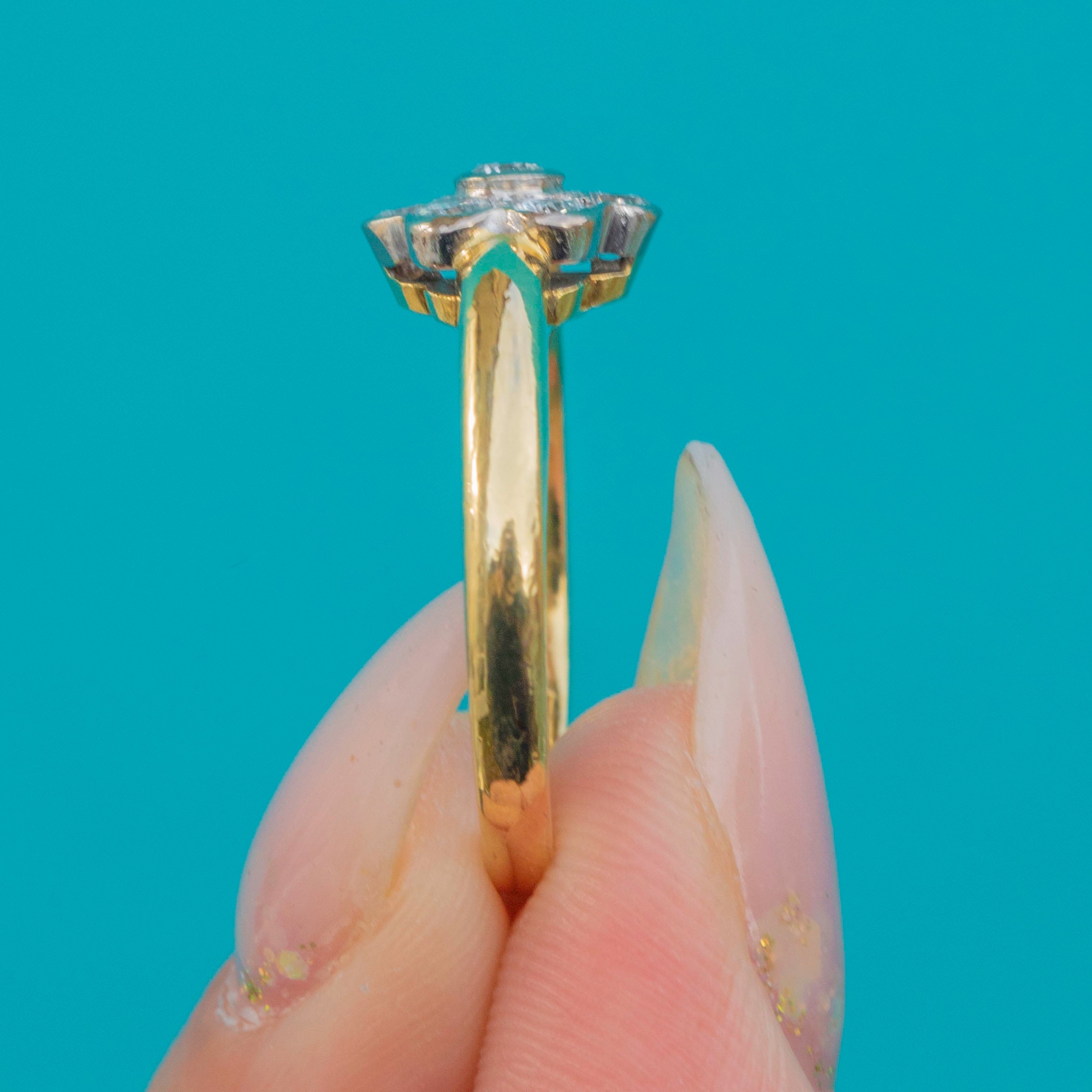 Excellent: The Diamonds are bright and well-matched, all secure in their settings. The cluster head is crisp and in great shape, and the 18ct Gold band shows only light signs of wear, retaining good thickness and durability.