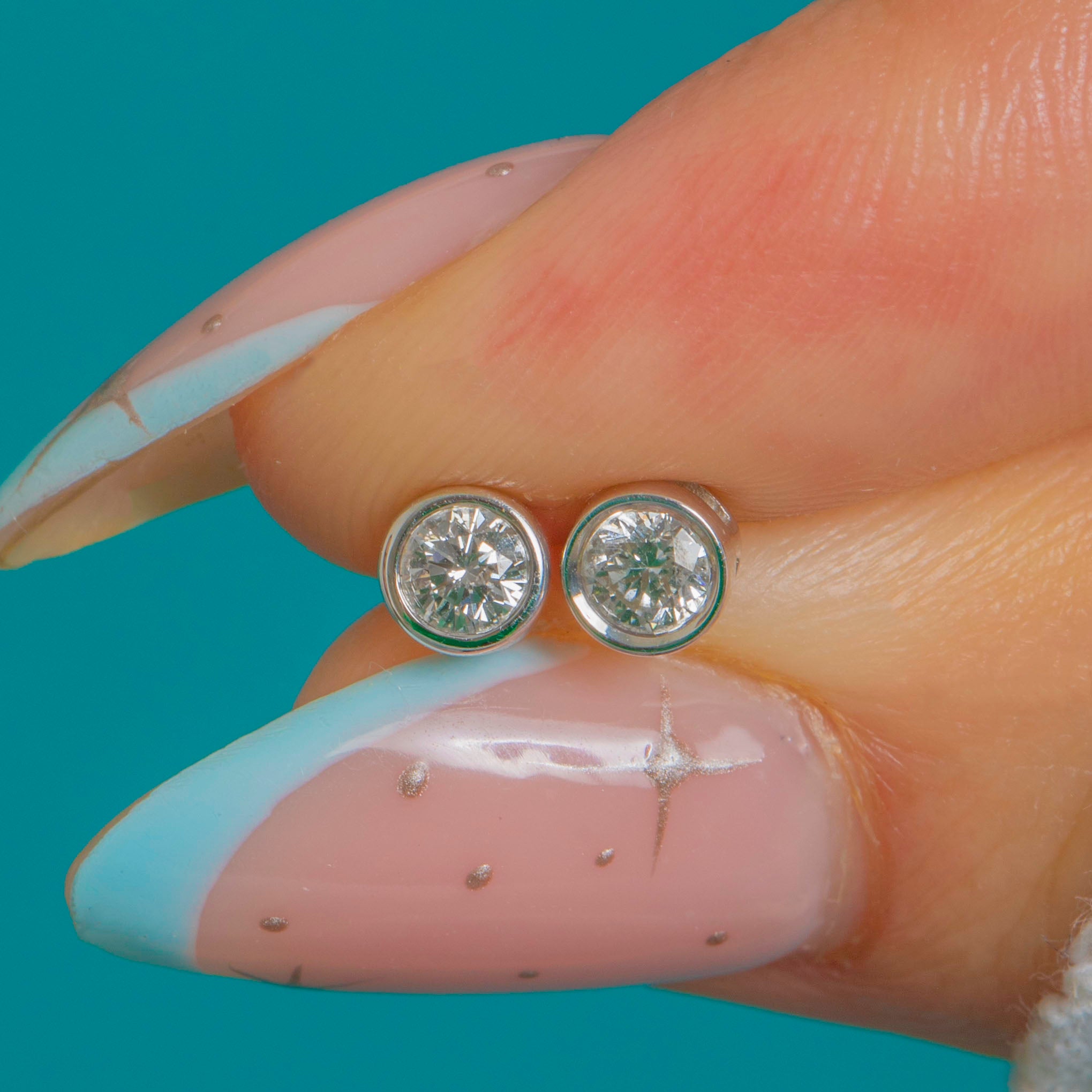 EXCELLENT: Diamonds are bright and eye-clean with no visible chips or abrasions. The rub-over settings are crisp and highly polished with only the lightest hairline surface wear. Posts and butterfly backs are in very good order with no visible repairs or distortions.