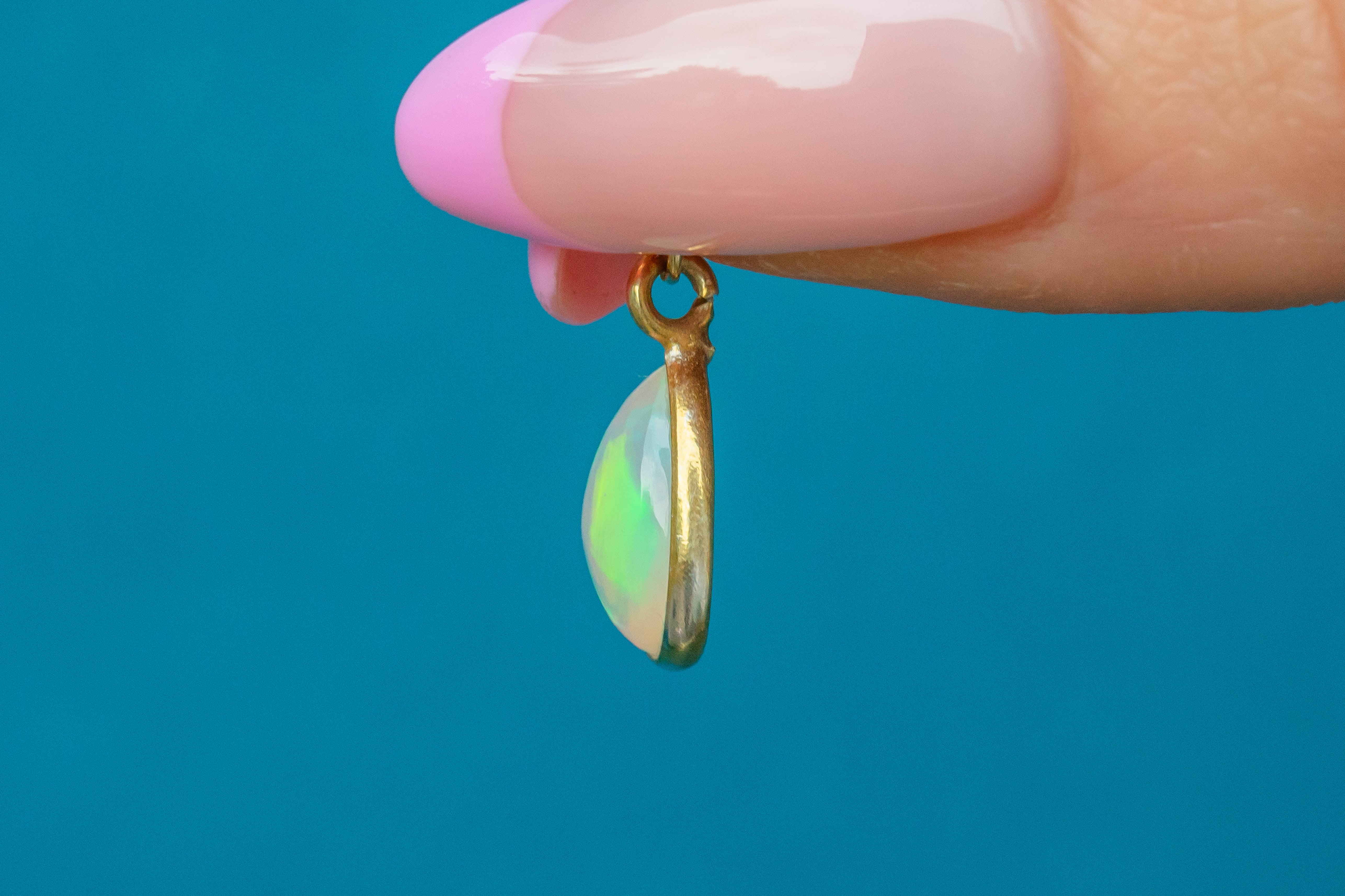 EXCELLENT. We are pleased to present this crystal Opal pear shape charm is in excellent condition! Her Opal is secure within the bezel setting, smooth to the touch, and possesses a myriad of vivid colours. Complete with a jump-ring, this Gold Opal Charm can be suspended from a Gold chain with the utmost confidence!
