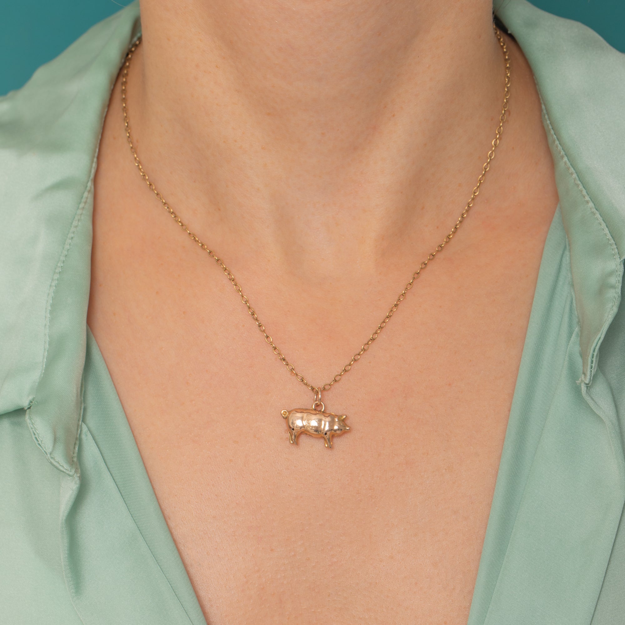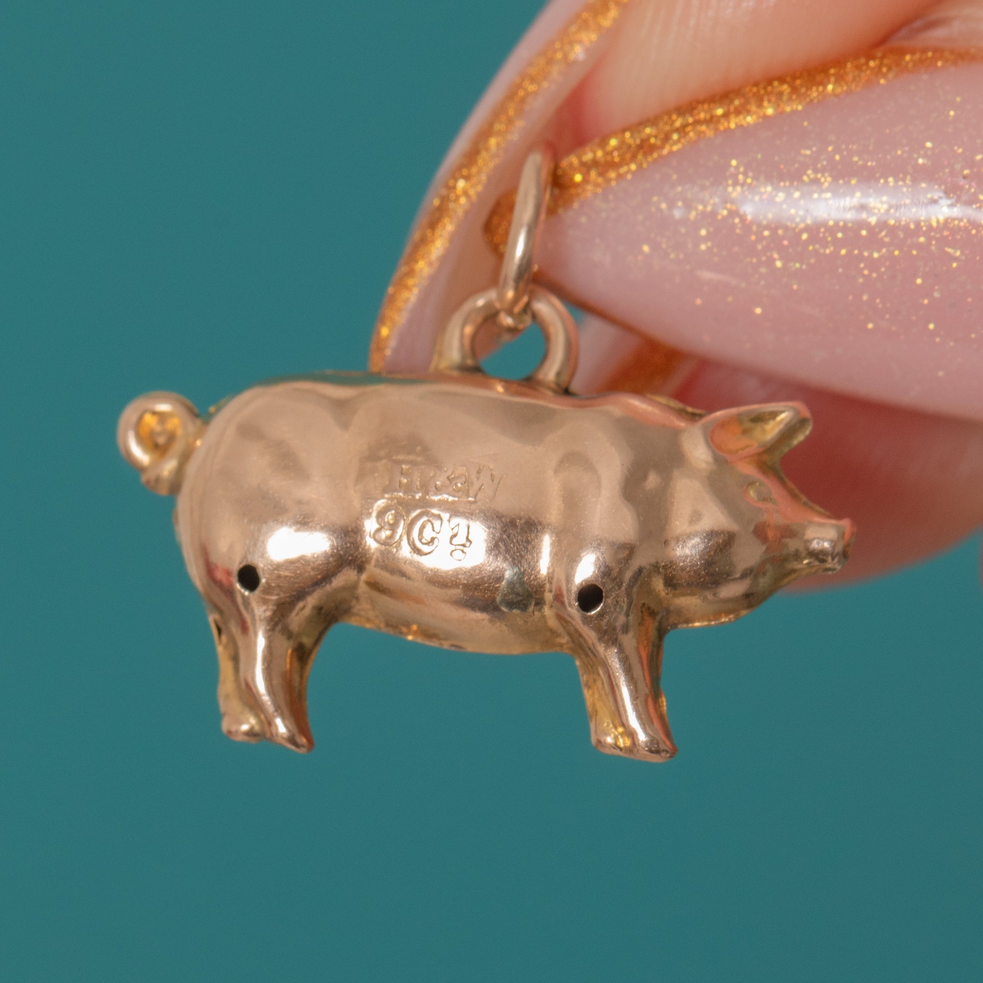 EXCELLENT: Smooth, bright Gold surfaces with a small mark visible on the Gold of the pig, consistent with gentle vintage wear. Detailing remains crisp and the jump ring is secure. A well-preserved, charming piece.