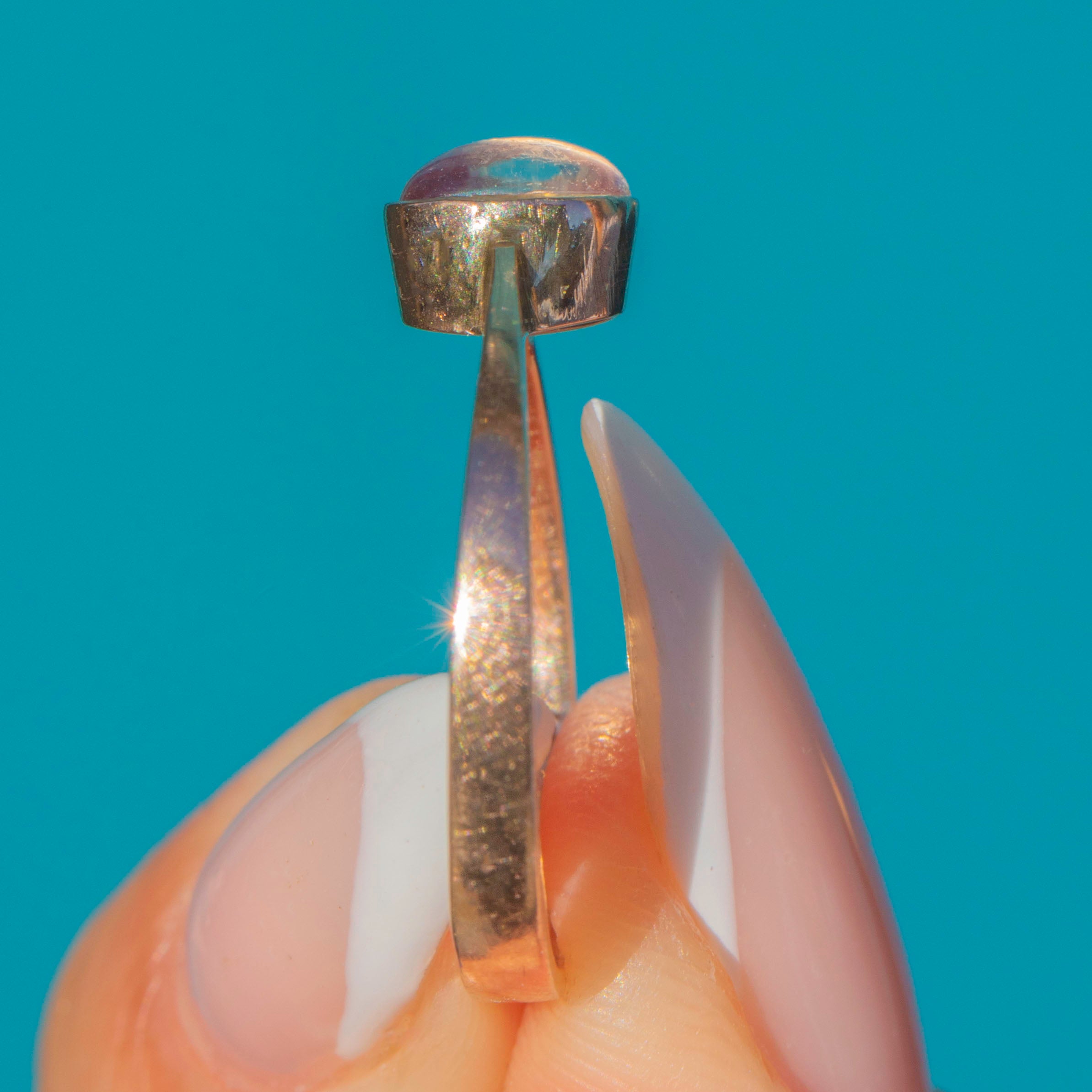 EXCELLENT. Only the lightest surface wear. The Moonstone is secure with gentle adularescence; the Gold band remains bright and crisp.