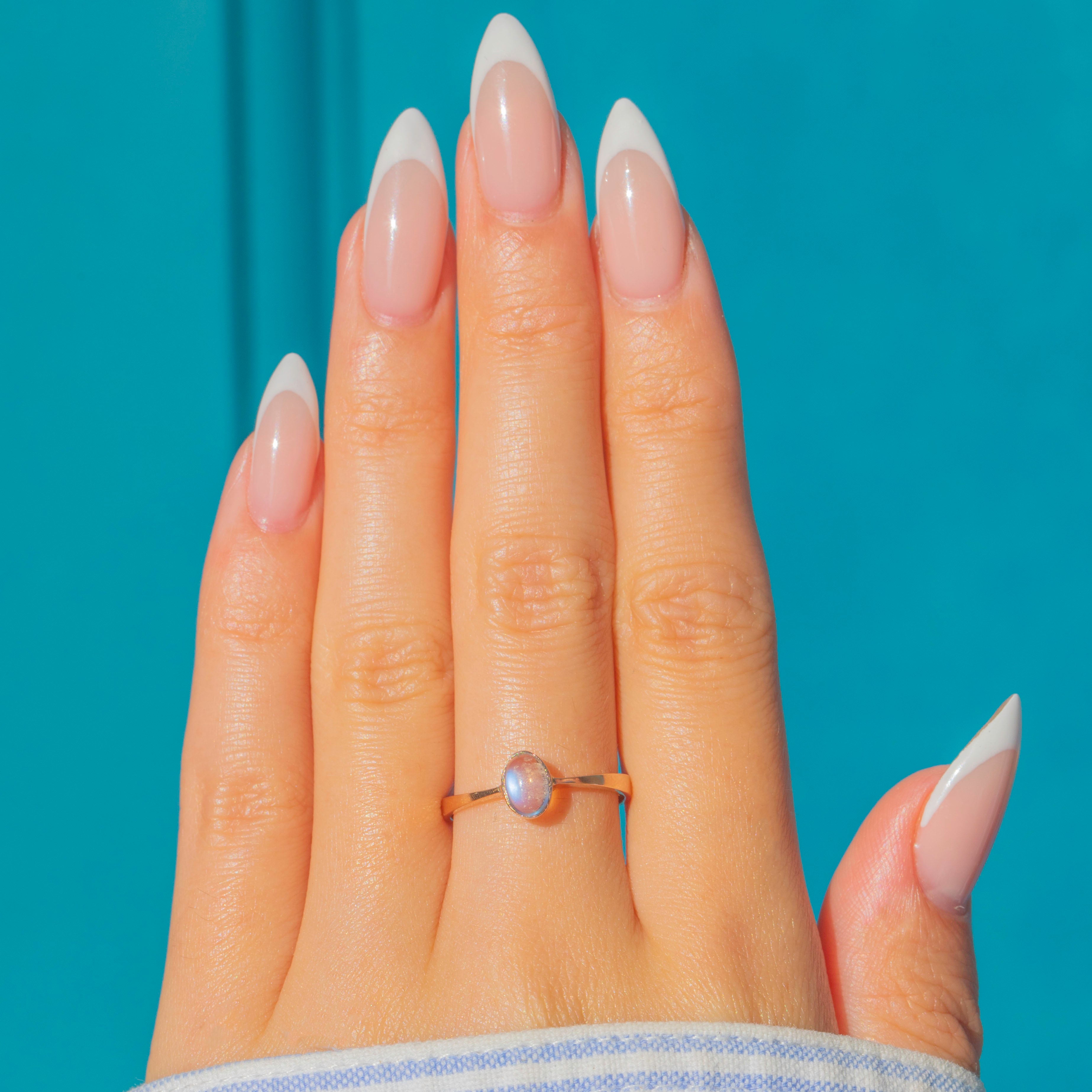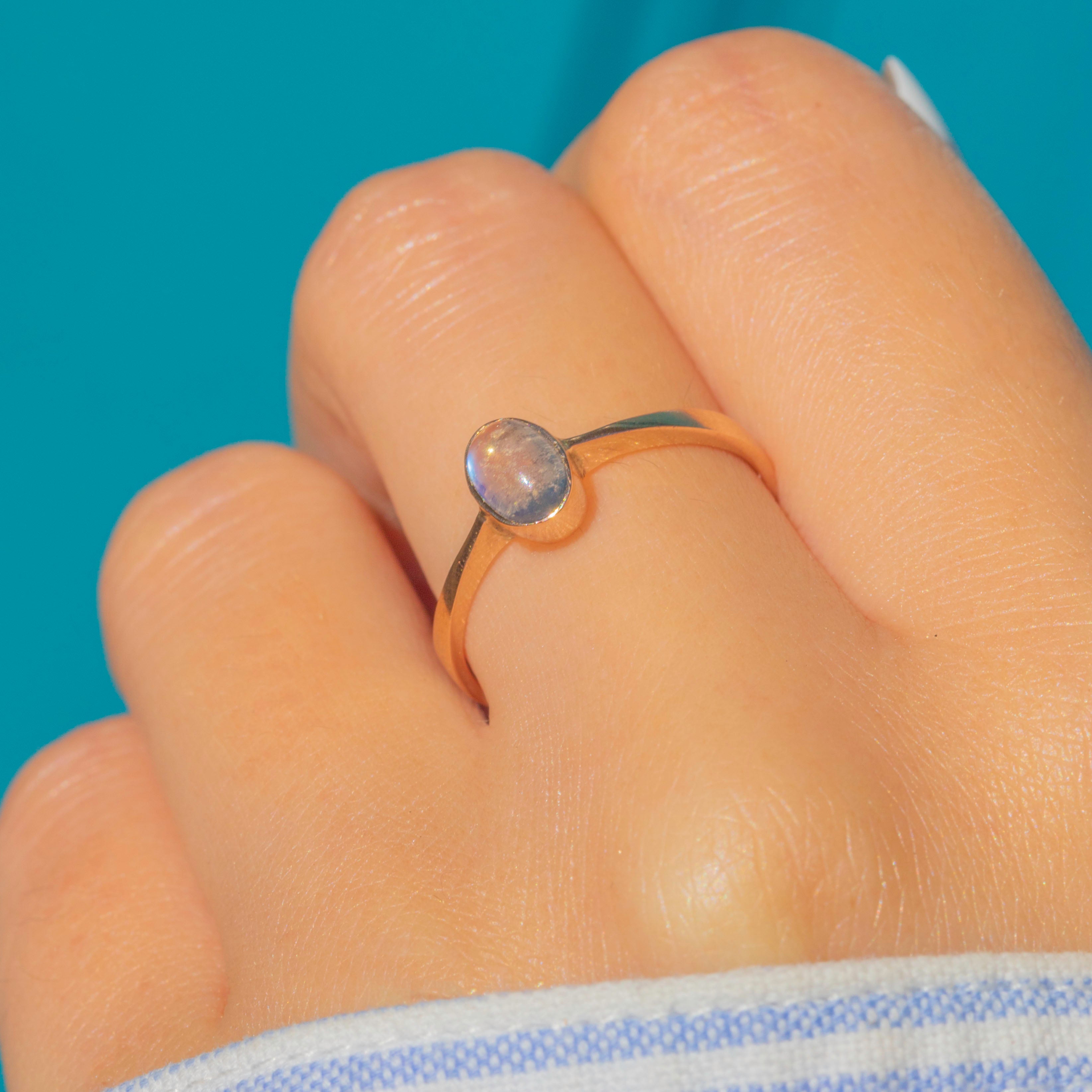 This dainty 9ct Gold ring features a glowing oval Moonstone cabochon, bezel-set to highlight its soft adularescence.