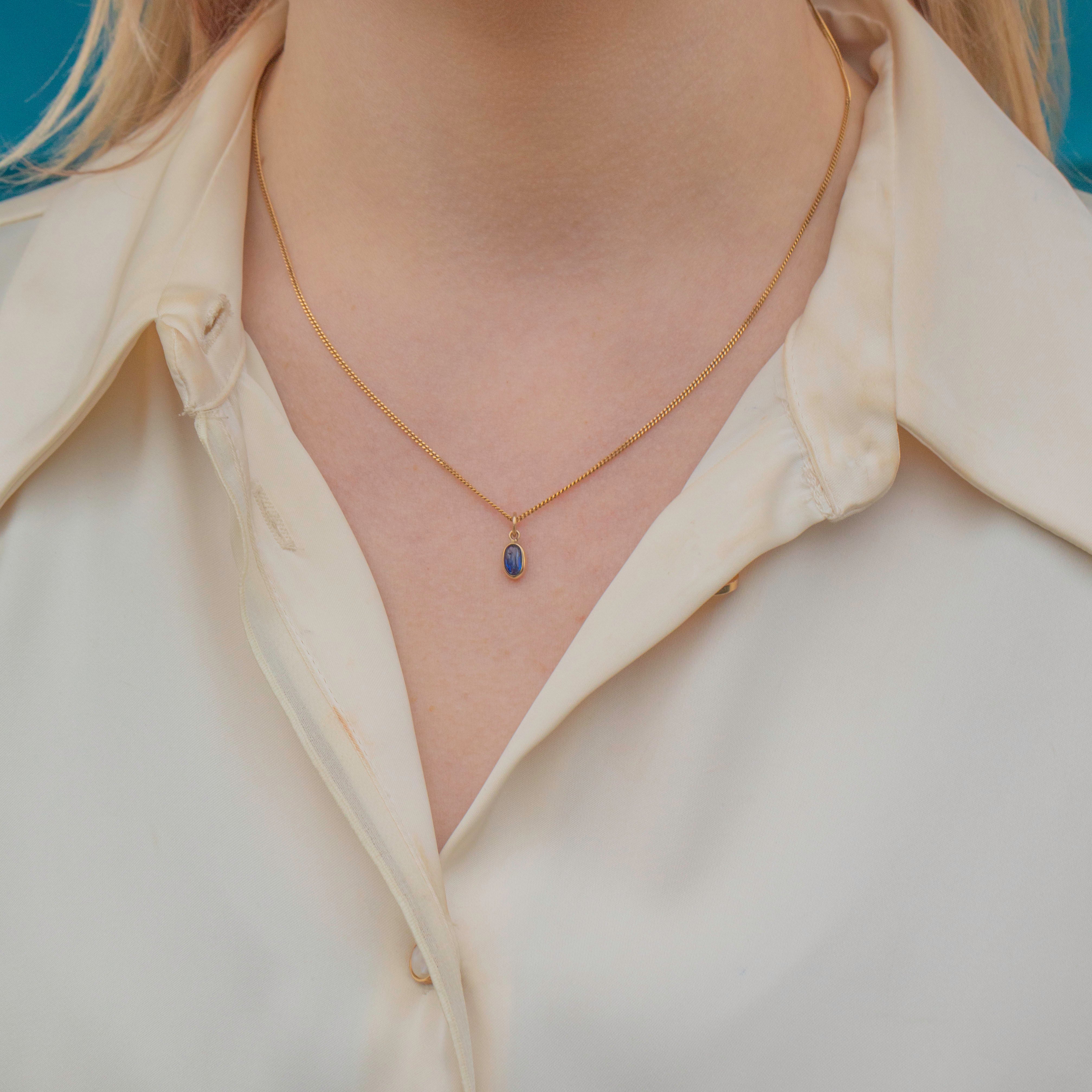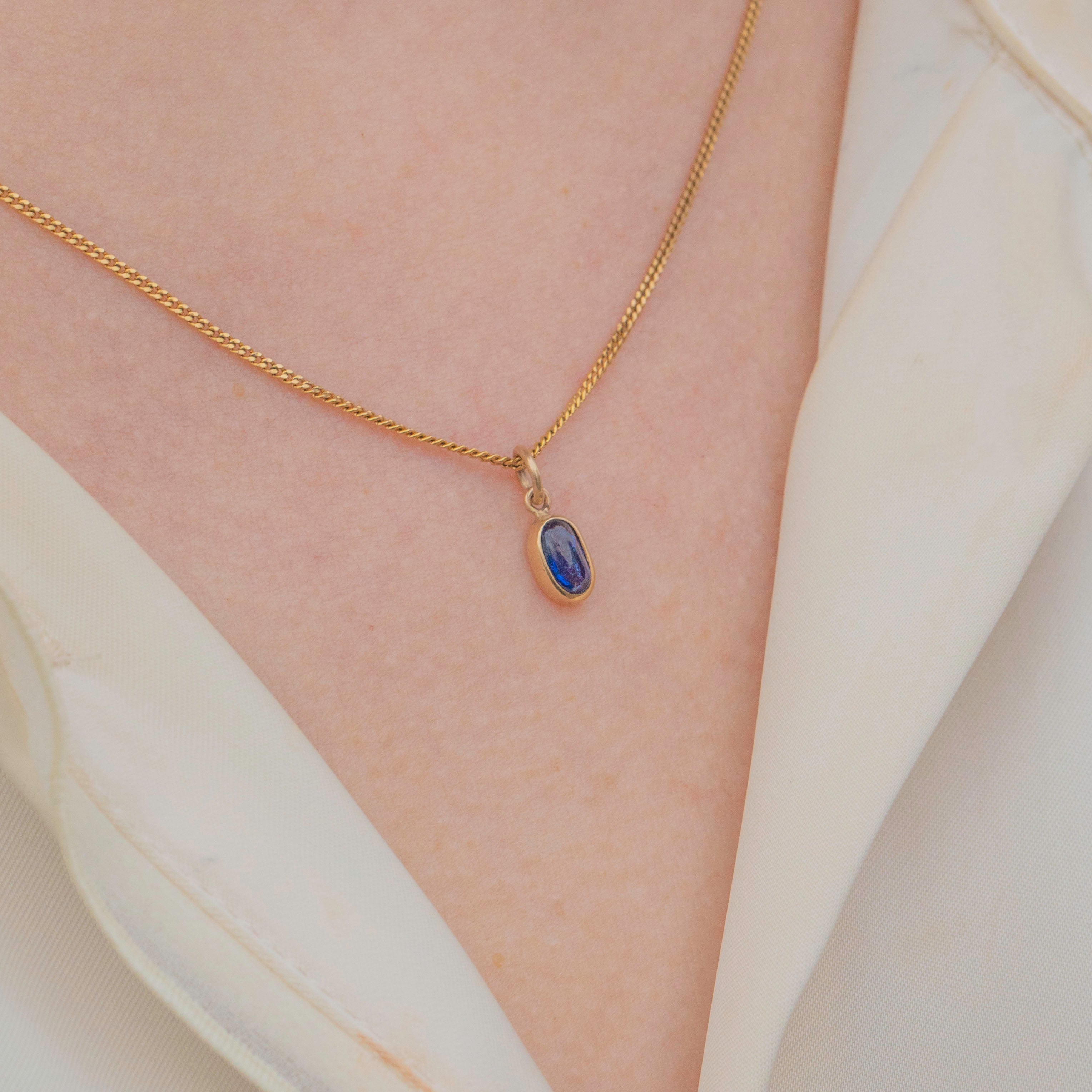Crafted from buttery 9ct Gold, this Edwardian charm features a royal blue 0.25ct Sapphire cabochon, radiating gorgeous deep cerulean hues as she catches the light. Suspended from a fine Gold chain, she would make a wonderful versatile addition to your neck stack.