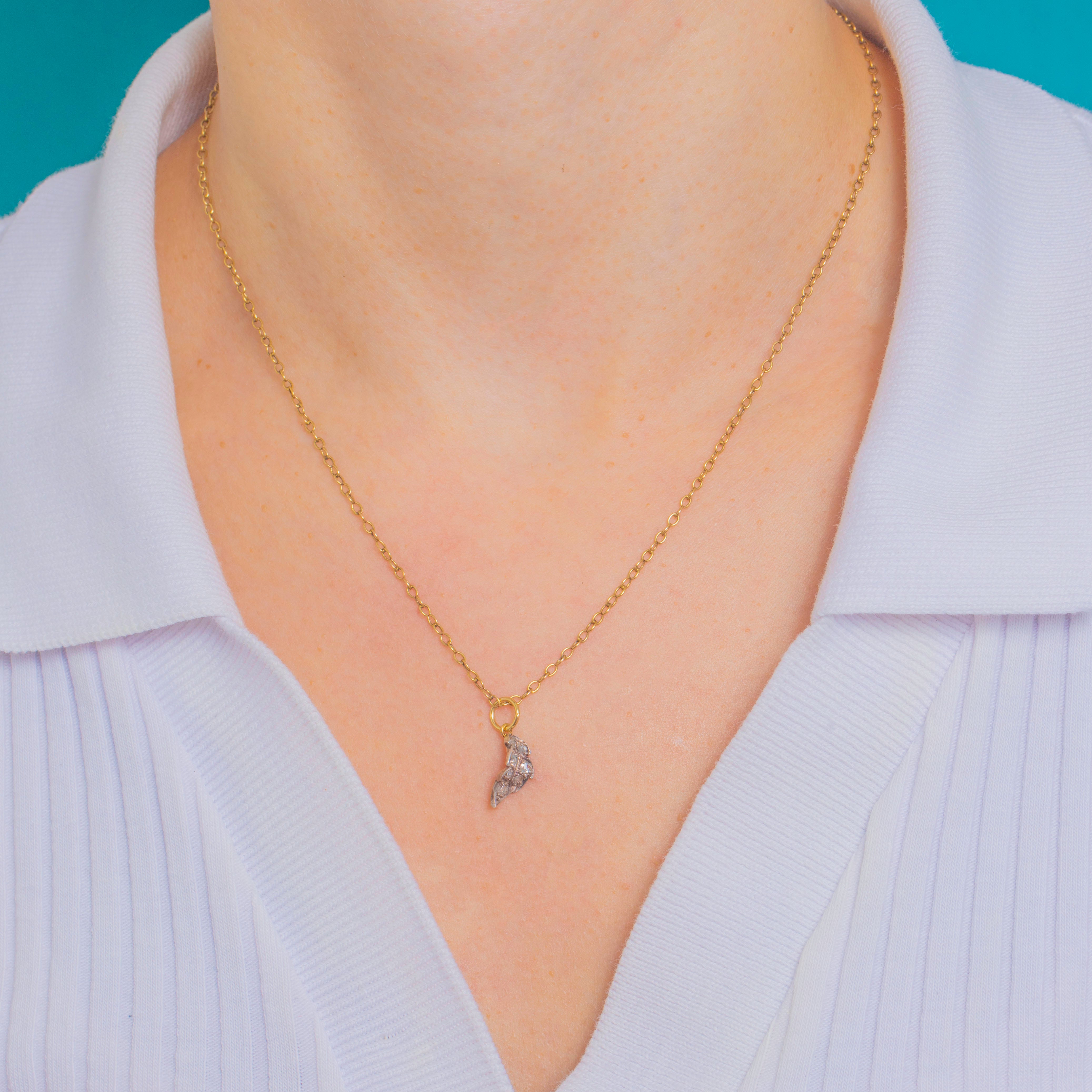 Delicately wrought in the Victorian era, this dainty foliate charm glimmers with rose-cut Diamonds in elegant grain settings. The leaf-spray motif is crisp and detailed, giving a subtle, antique sparkle that feels wonderfully refined and romantic.