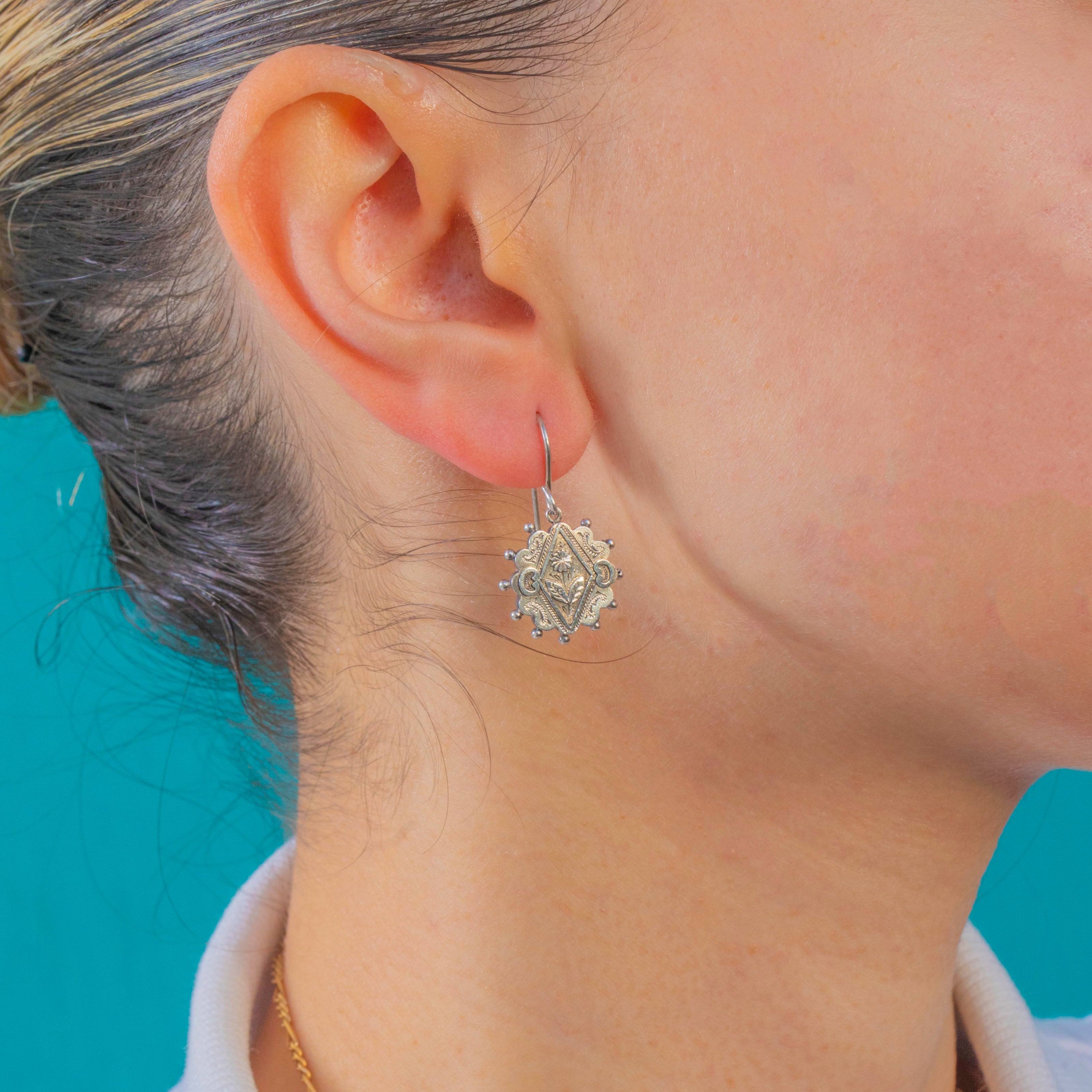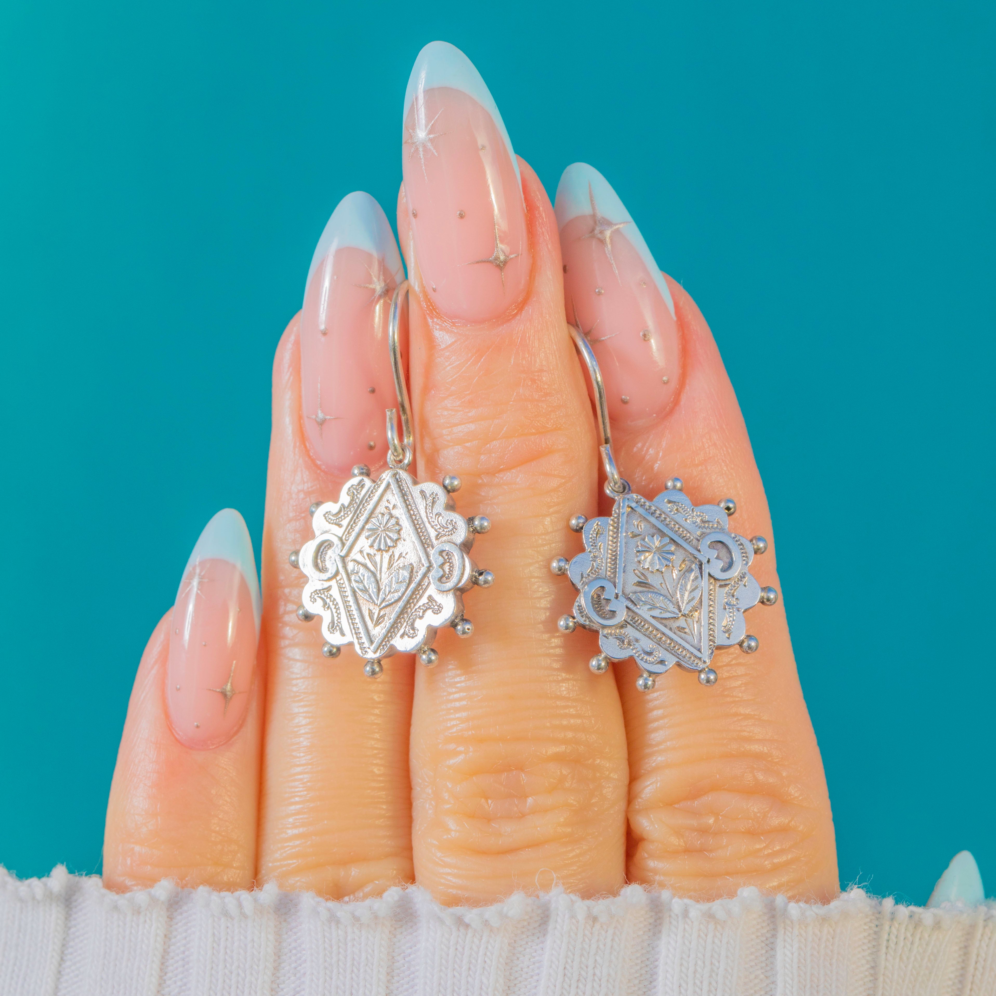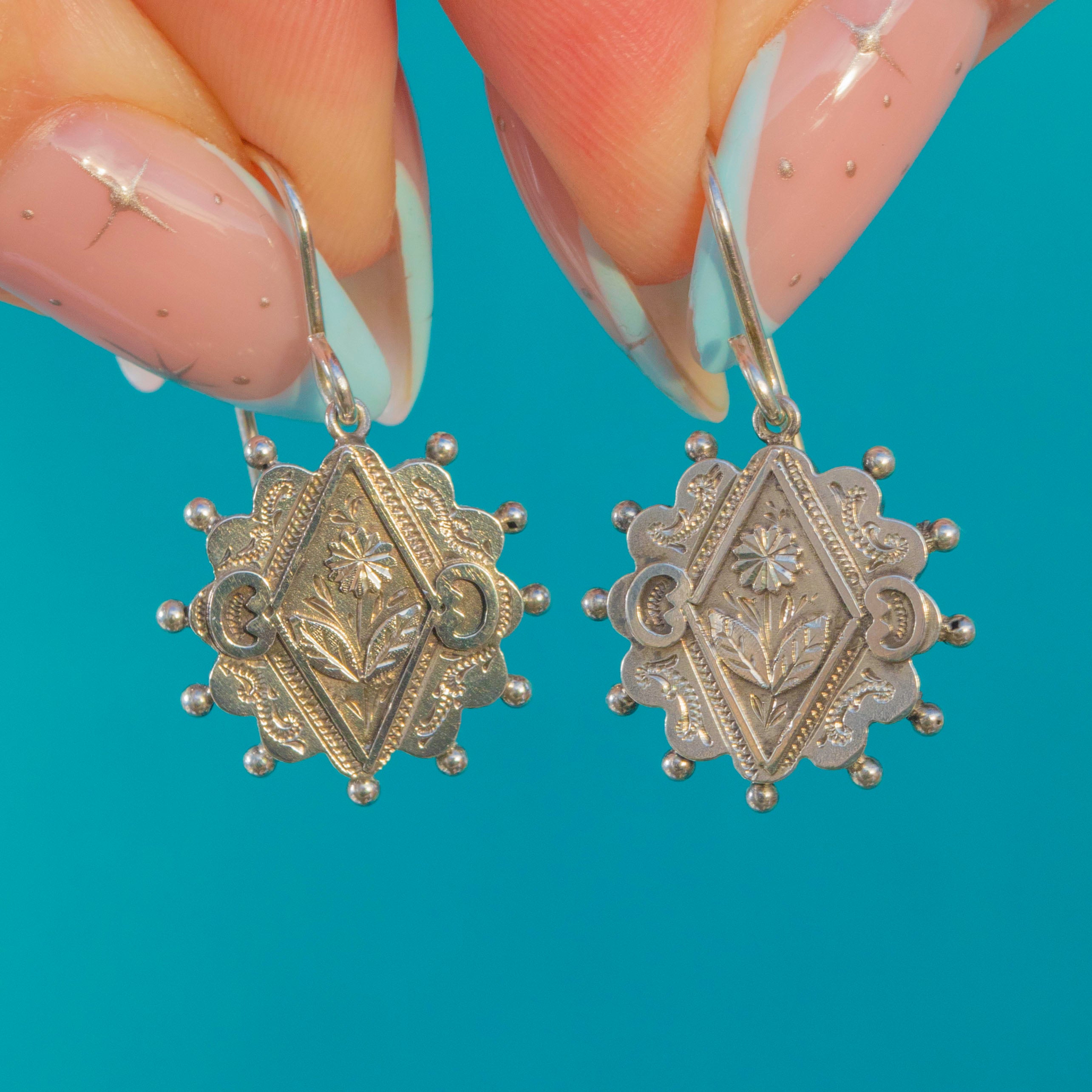 Delicately ornate and beautifully wearable, these Victorian Aesthetic Sterling Silver drop earrings showcase scalloped medallion plaques alive with crisp bright-cut engravings. A central lozenge cartouche is framed by fine foliate scrolls and a neat beaded border, lending texture and light to every movement.