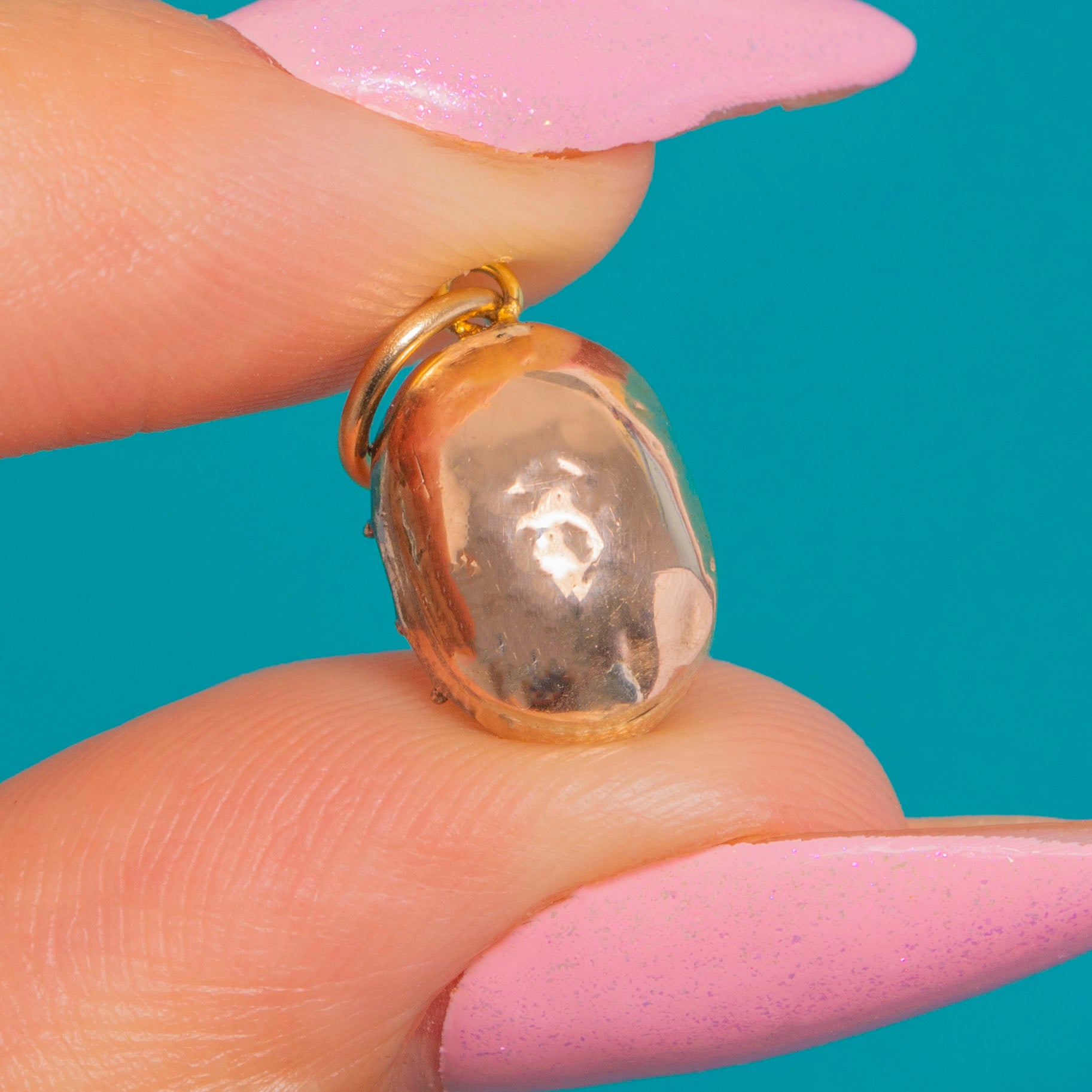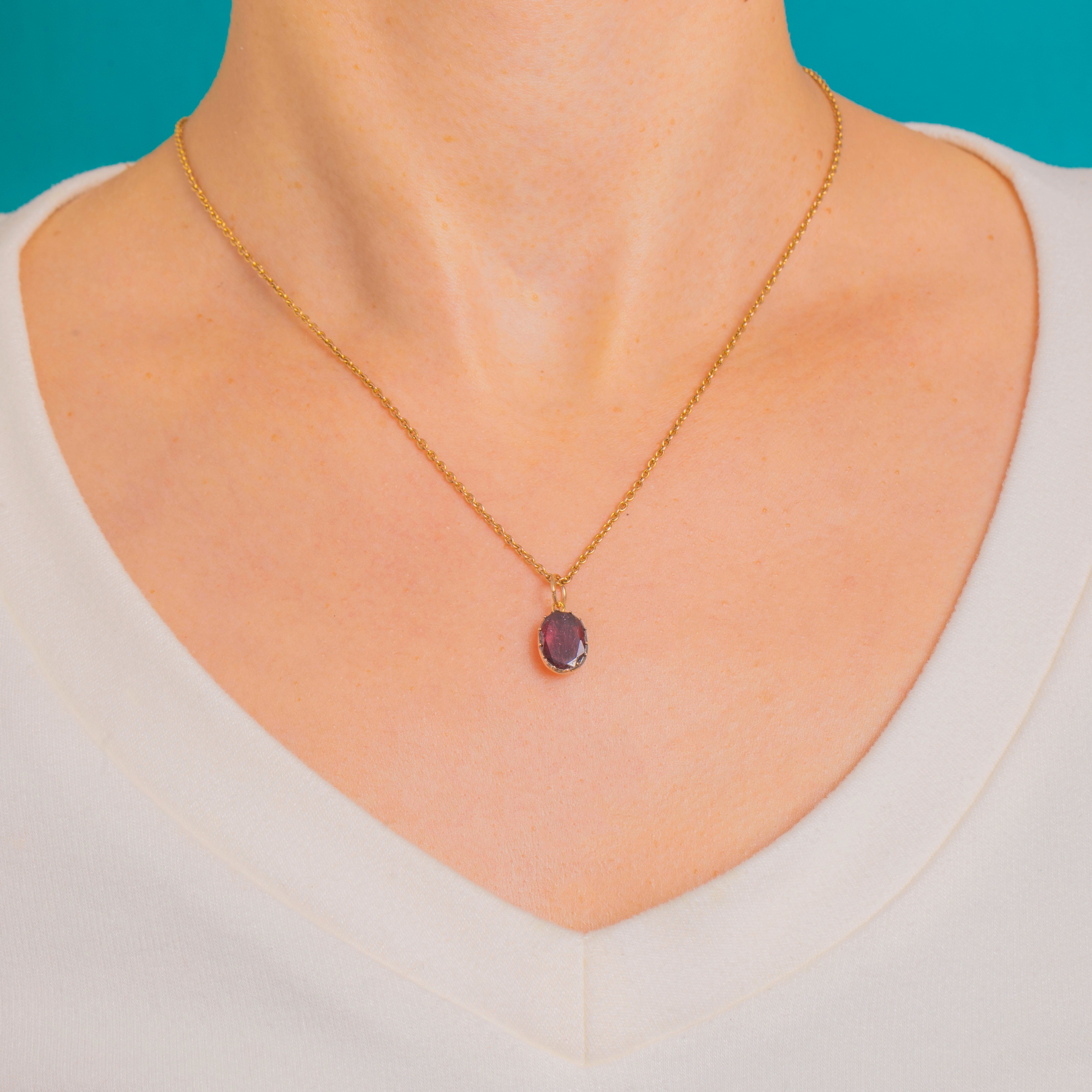 A petite Georgian Garnet charm, rich with early 19th-century character. The deep wine-red, hand-cut oval Garnet is set in a slender closed-back 9ct Gold collet with a simple jump-ring, giving a refined, minimal silhouette with artisanal warmth.
