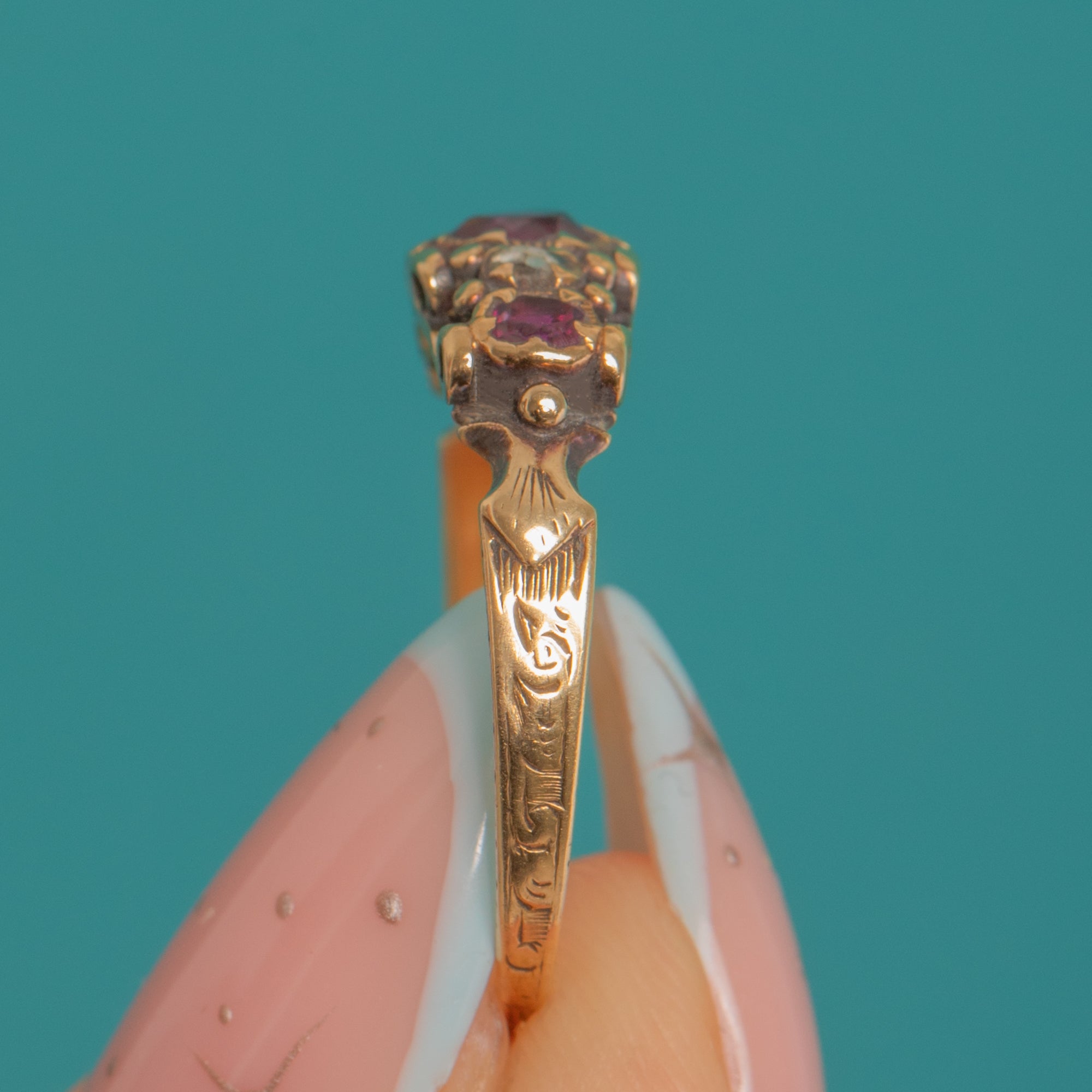 Romantic and exquisitely detailed, this early Victorian five-stone ring captures elegance in a low, boat-shaped cluster. A pear-shaped Ruby glows at the centre, flanked by cushion-cut Rubies and twinkling rose-cut Diamonds for a delicate sparkle. The head sits low and refined with cut-down, pie-crust style settings, while foliate-engraved shoulders and a beautifully pierced under-gallery add artisanal charm.