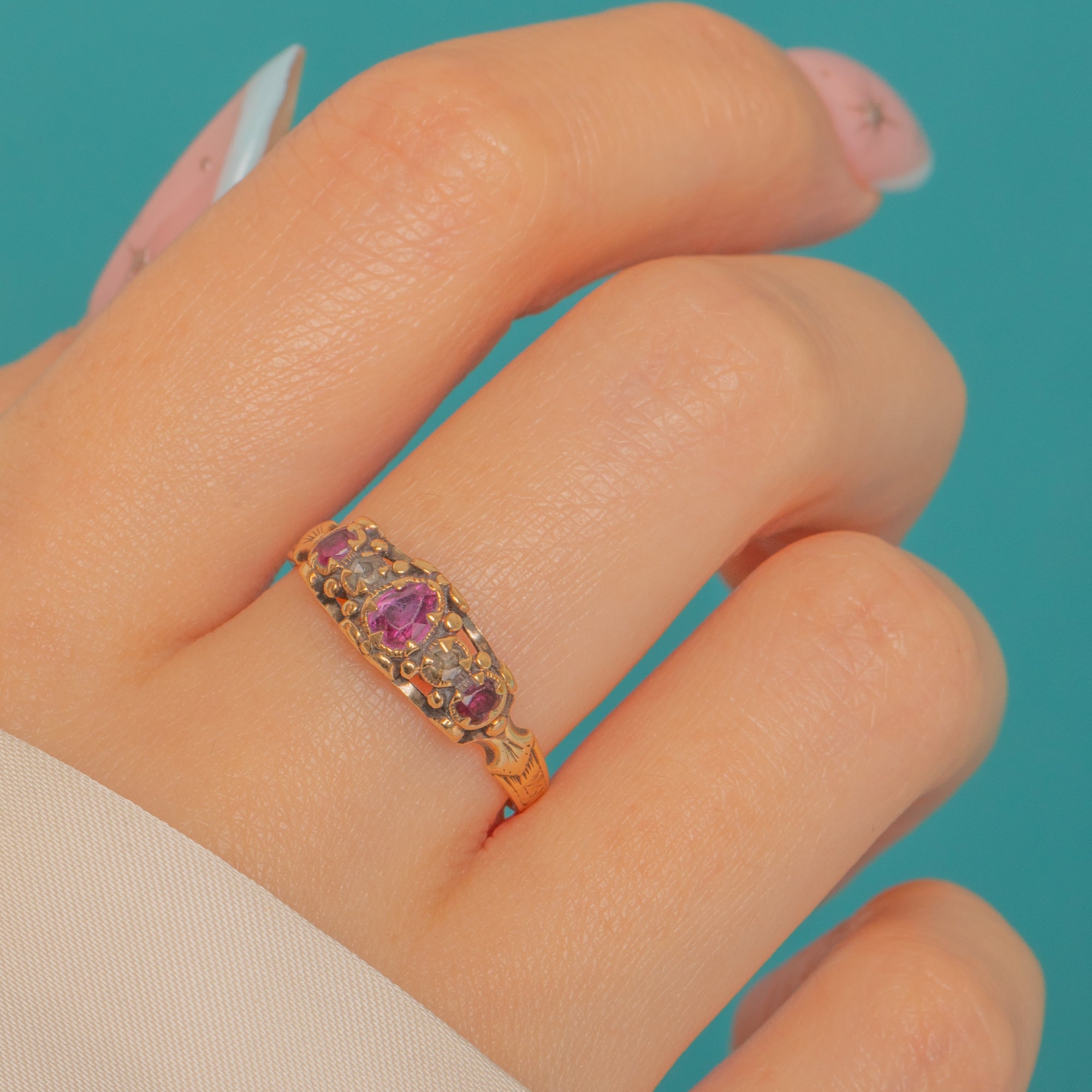 Early Victorian 18ct Gold Ruby Rose-Cut Diamond Five-Stone Ring- Engraved Shoulders Item added