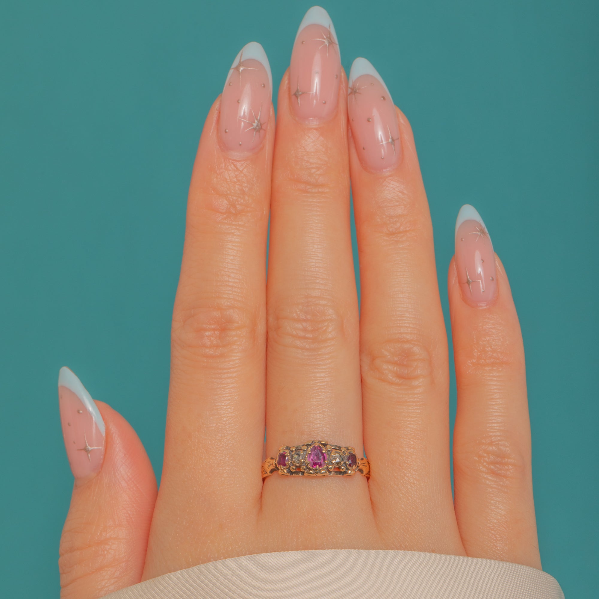 VERY GOOD: The gemstones are bright with light surface wear and minor facet-edge abrasions commensurate with age; all stones appear secure in their settings. The engraved shoulders and head retain lovely detail with gentle antique patina. The band is slender with a visible historic resizing line inside the shank; it should be worn with appropriate care.