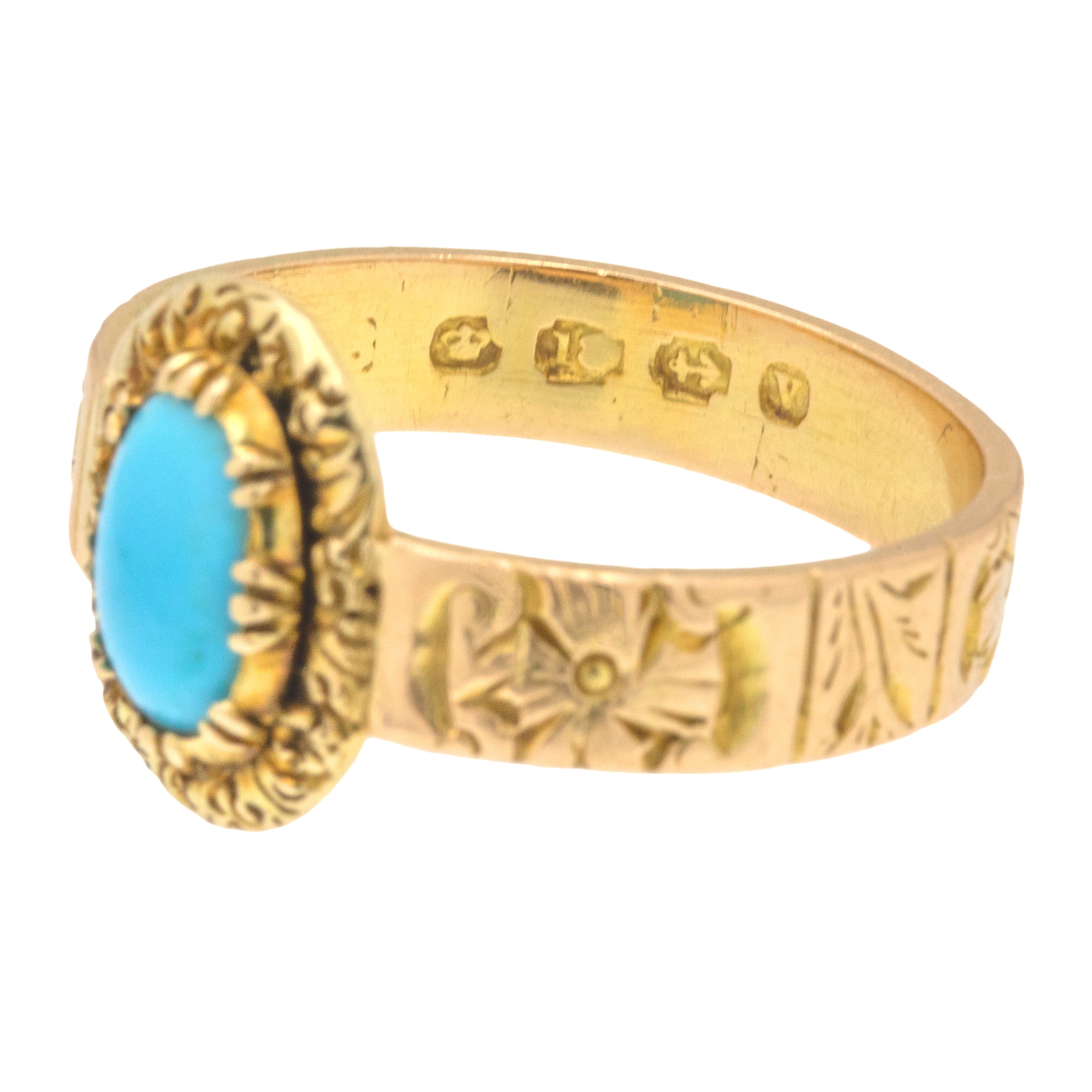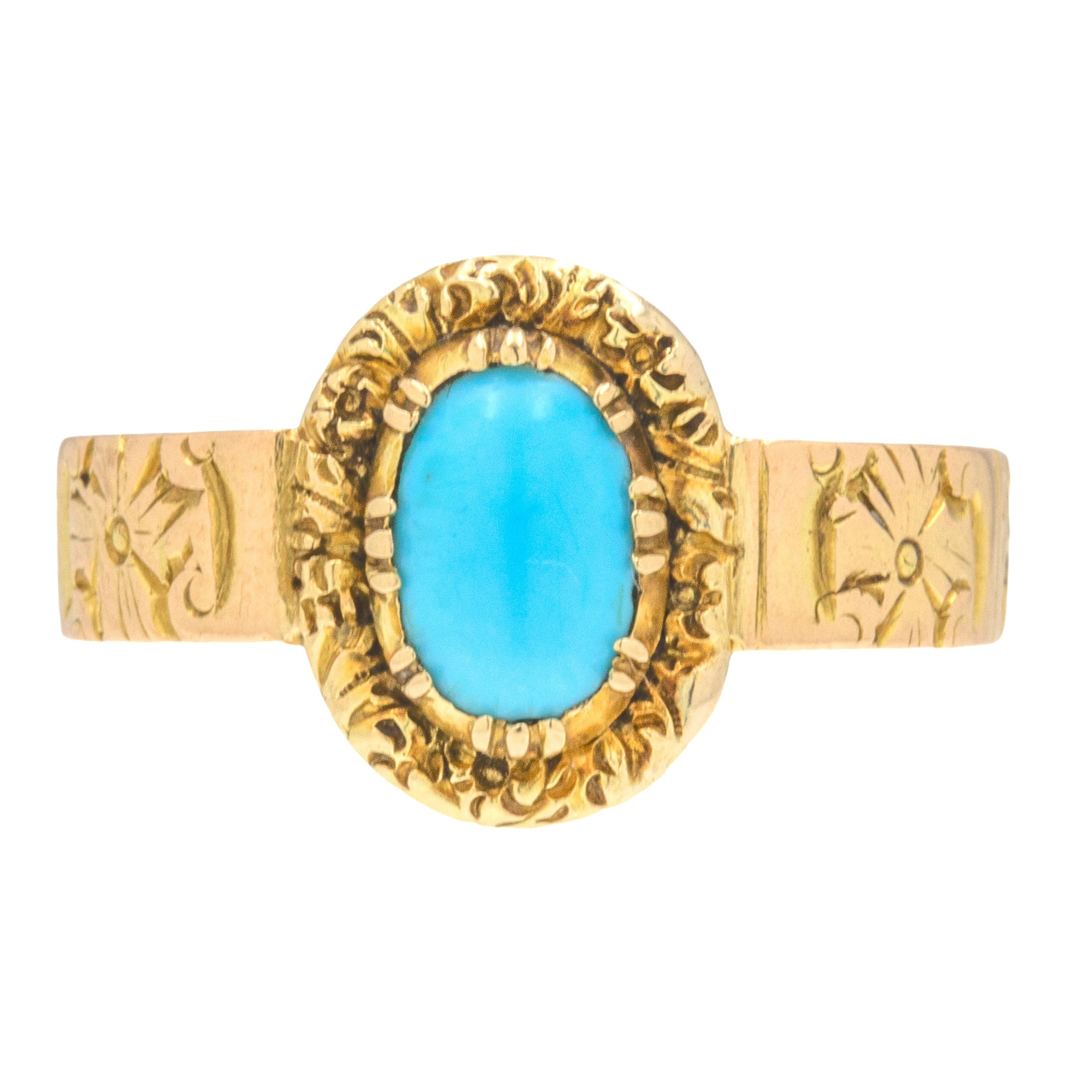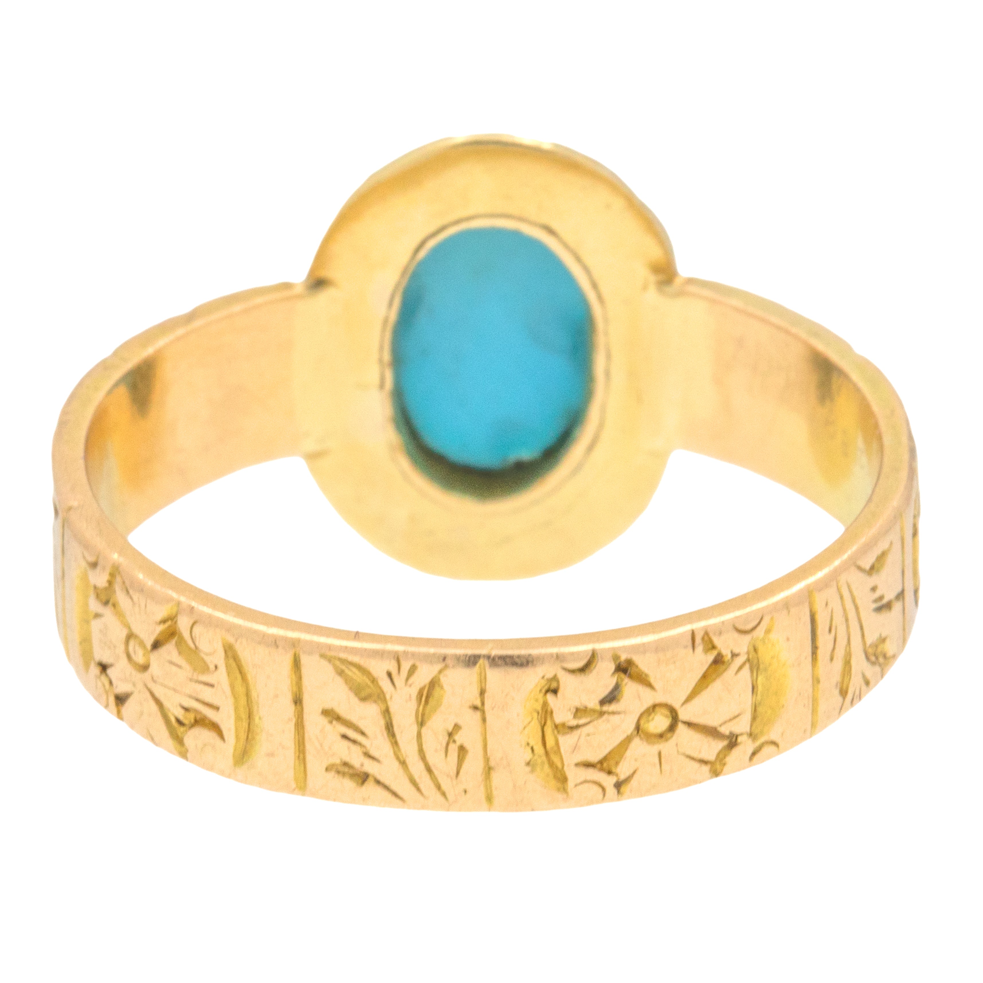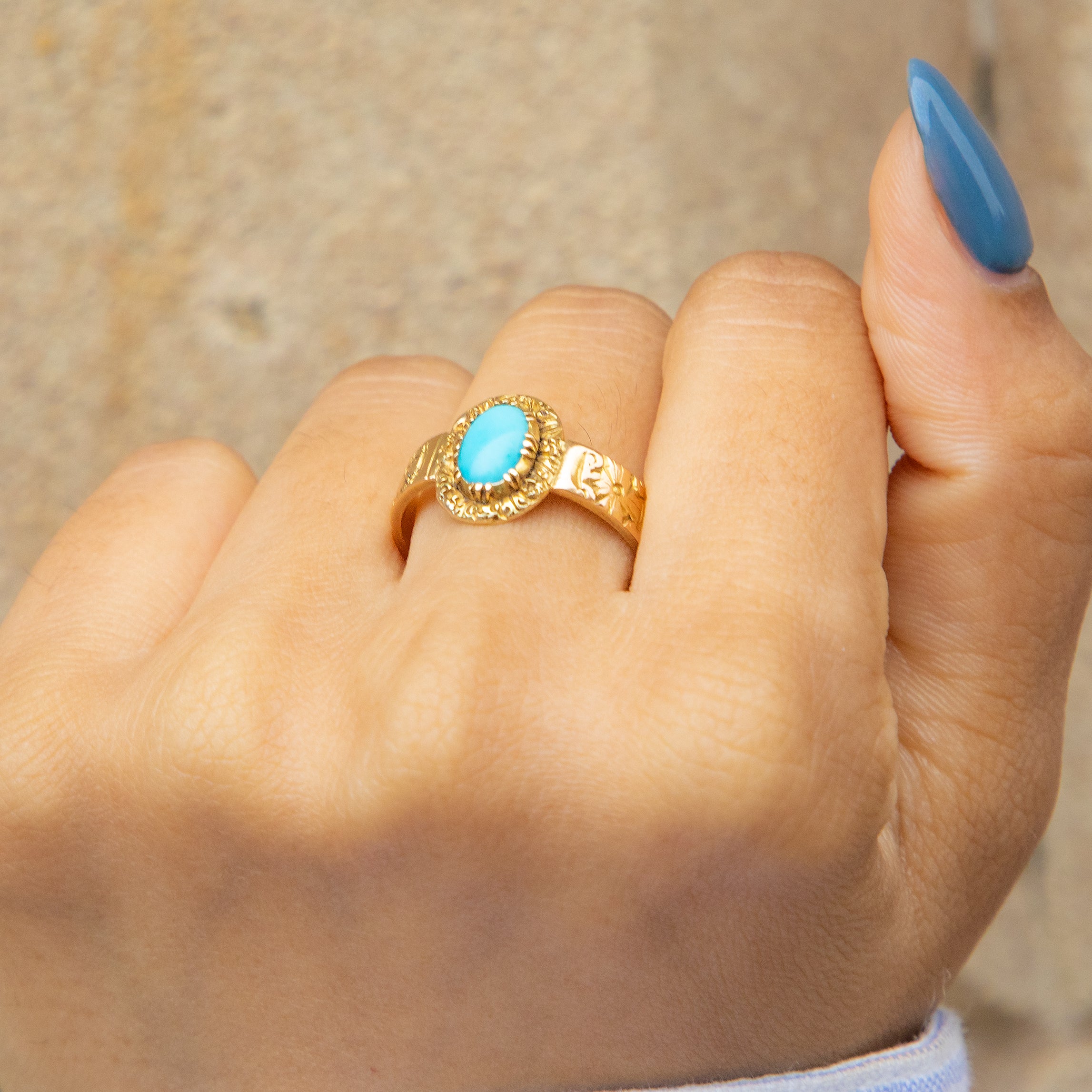 The solid 18ct Gold band has been skillfully engraved with delicate orange blossom motifs, symbolic of good health and fortune. The saturated tones of the Gold combined with the duck egg blue hue of the Turquoise creates a striking visual contrast. This ring is a testament to the craftsmanship and artistry of the Victorian era!
