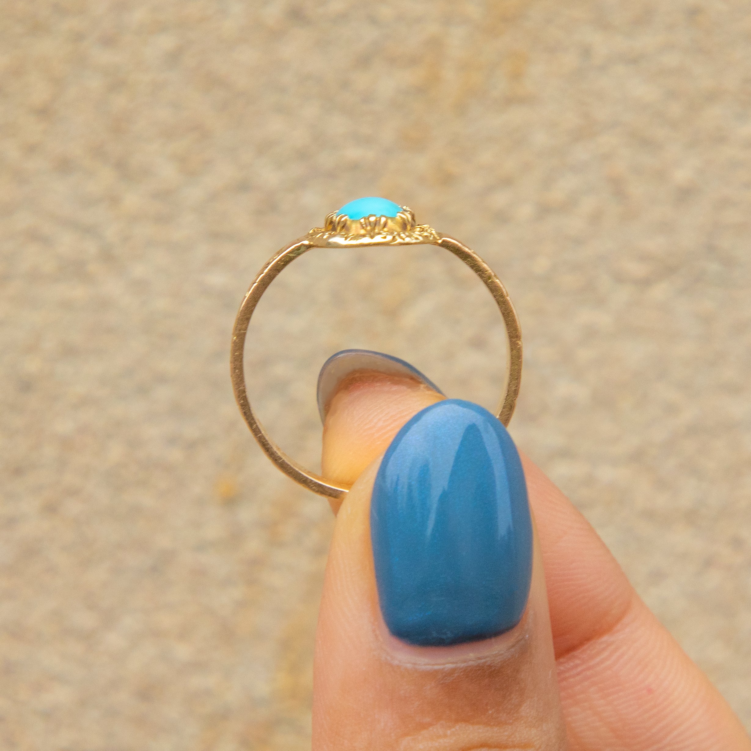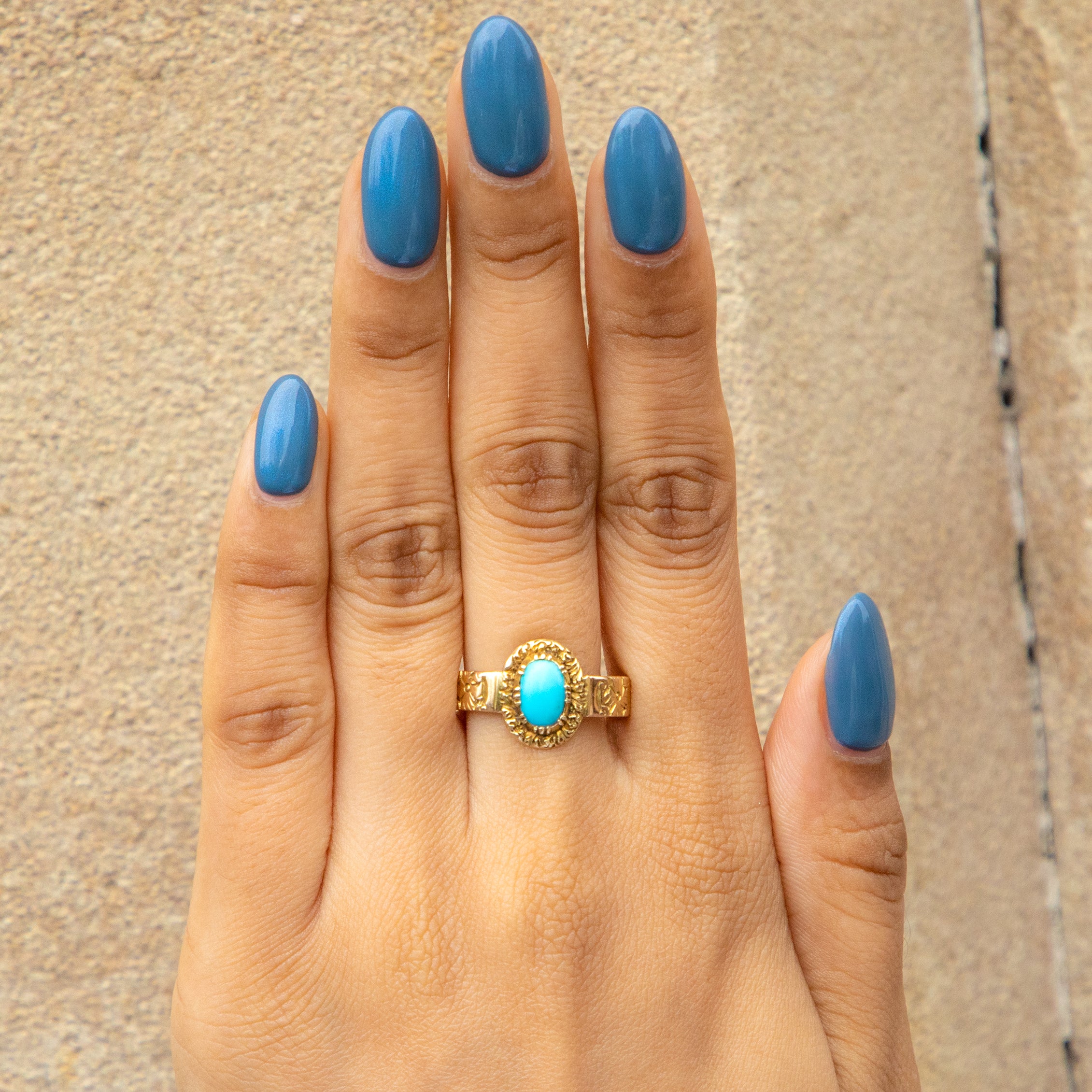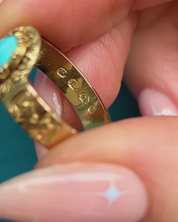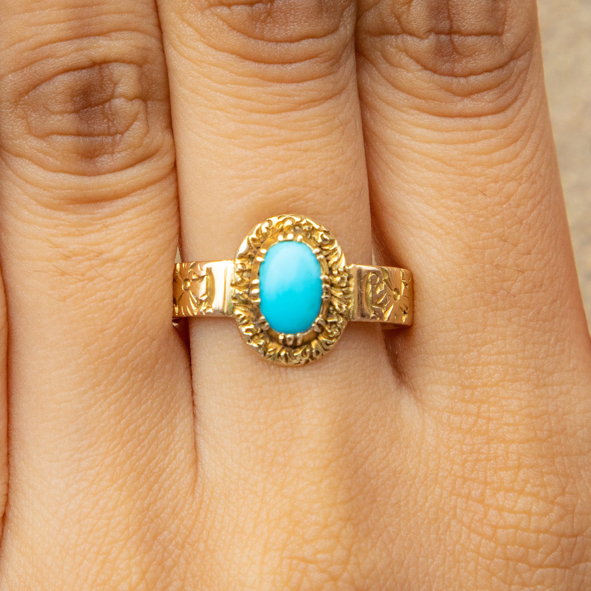 The solid 18ct Gold band has been skillfully engraved with delicate orange blossom motifs, symbolic of good health and fortune. The saturated tones of the Gold combined with the duck egg blue hue of the Turquoise creates a striking visual contrast. This ring is a testament to the craftsmanship and artistry of the Victorian era!