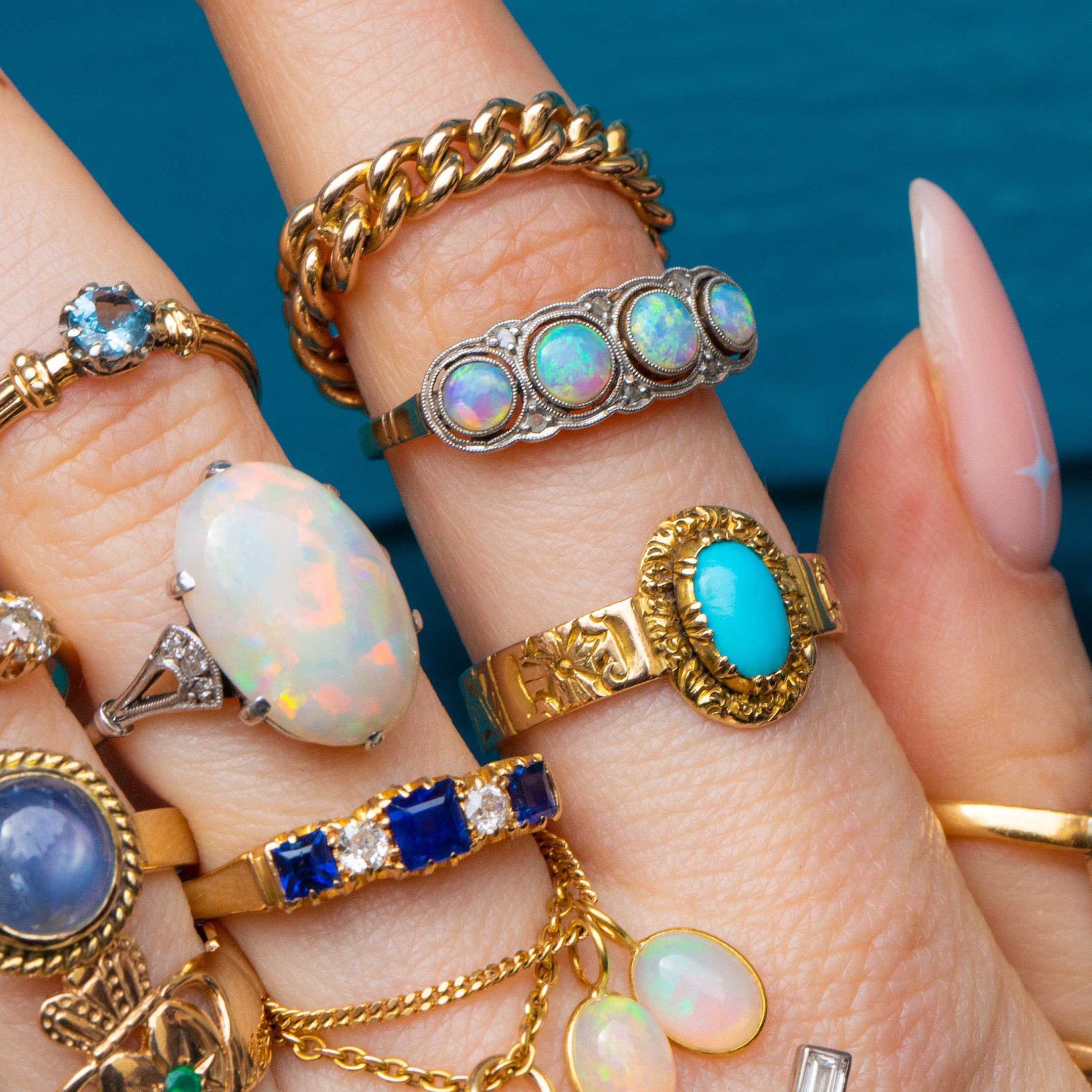 This exquisite early Victorian 18ct Gold Turquoise orange blossom ring boasts an enchanting combination of colours and intricate detailing. Crafted with meticulous attention to detail, this antique ring features a vibrant Turquoise at its centre, reminiscent of tranquil seas and boundless skies.
