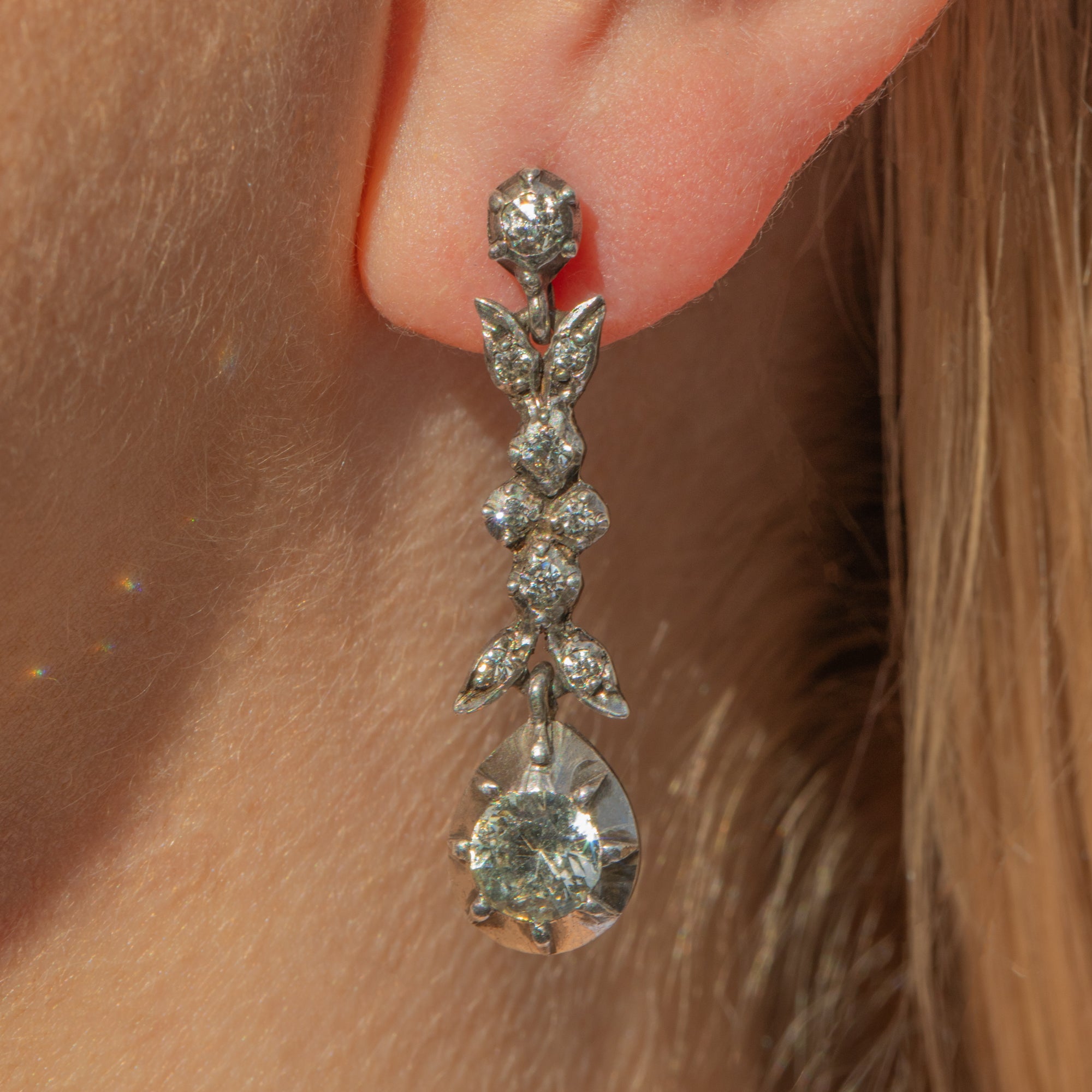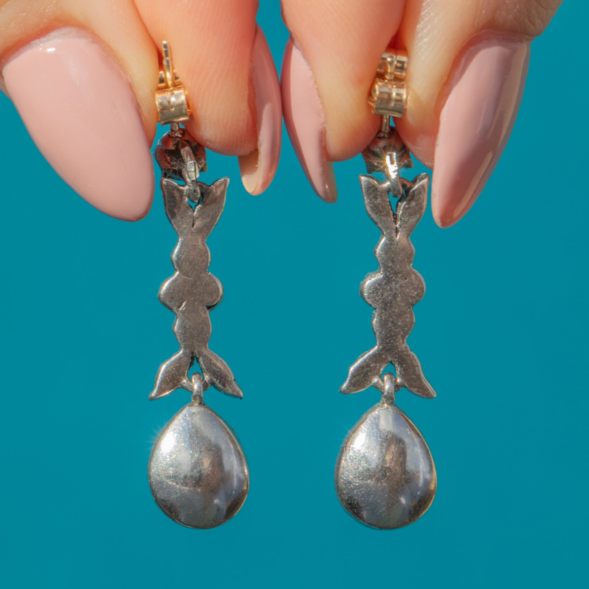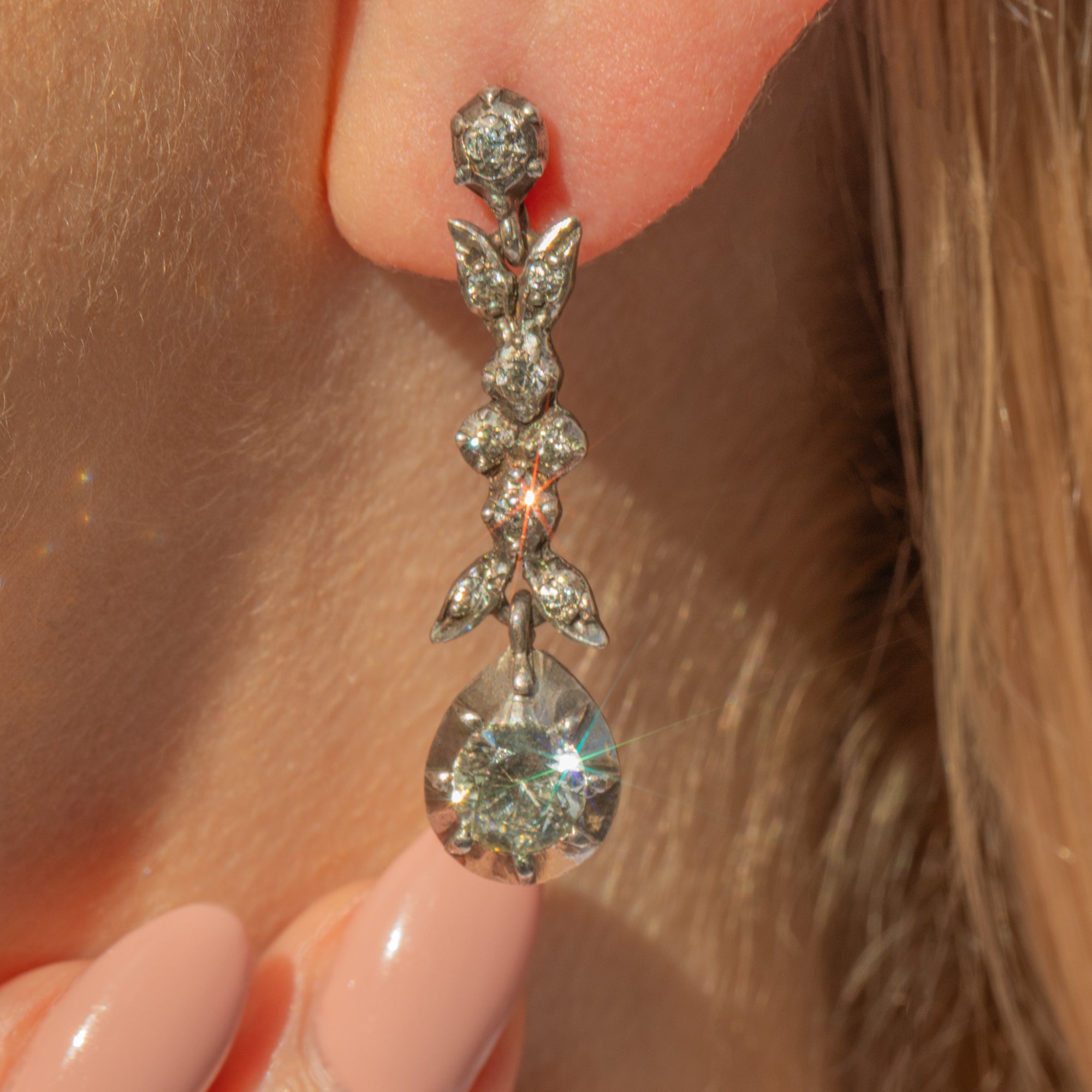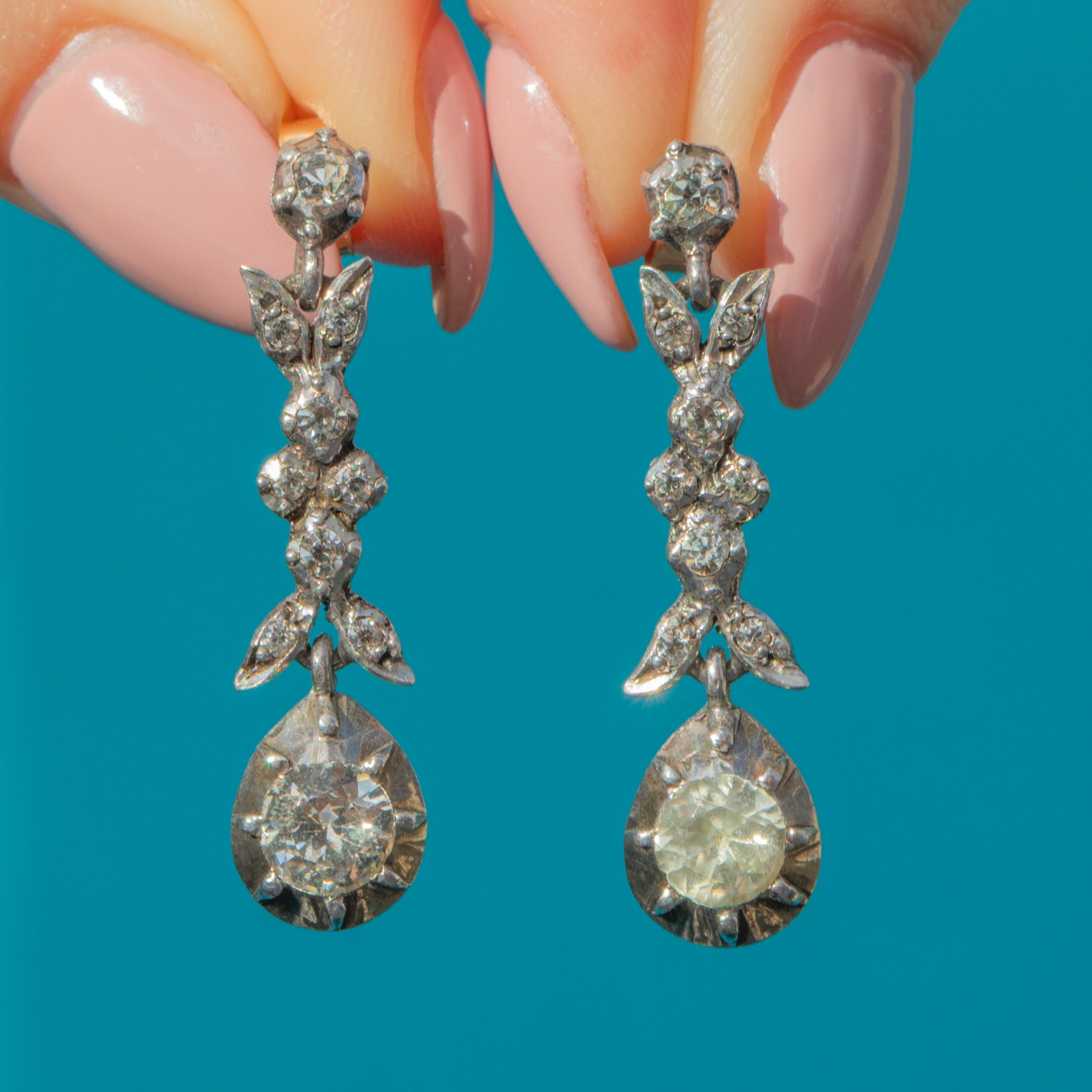 VERY GOOD-EXCELLENT. These early Victorian Silver Paste drop earrings are in wonderful antique condition! Each Paste is securely held in its setting, with no damage to note, providing the twinkle your ear stack has been looking for. The components are firmly connected and provide a lovely fluidity. The ear posts are securely soldered and with tight-fitting butterfly backs, you can wear them with confidence and style!
