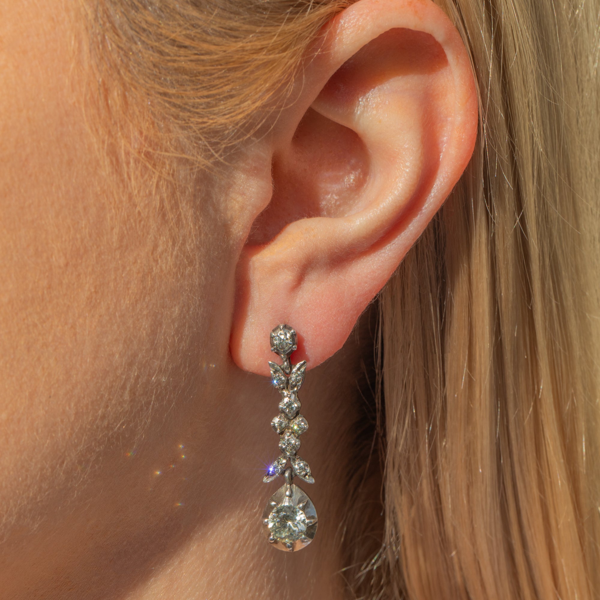 As these early Victorian Silver Paste drop earrings fall beside your cheeks like chandeliers, their Paste drops catch effortlessly beneath the light. Their foliate drops are also inlaid with twinkling Paste, making these Victorian earrings the perfect pair to accompany any formal attire.