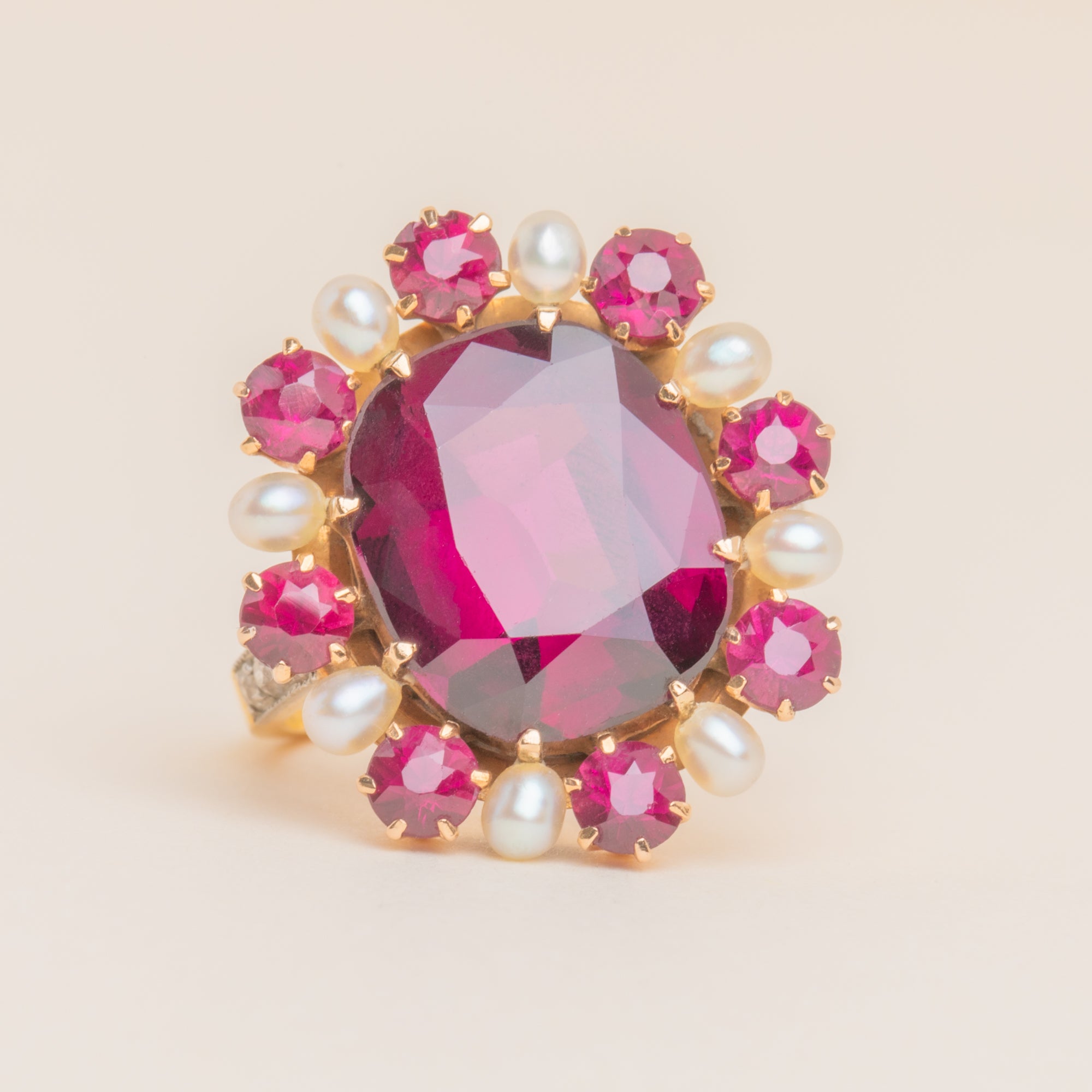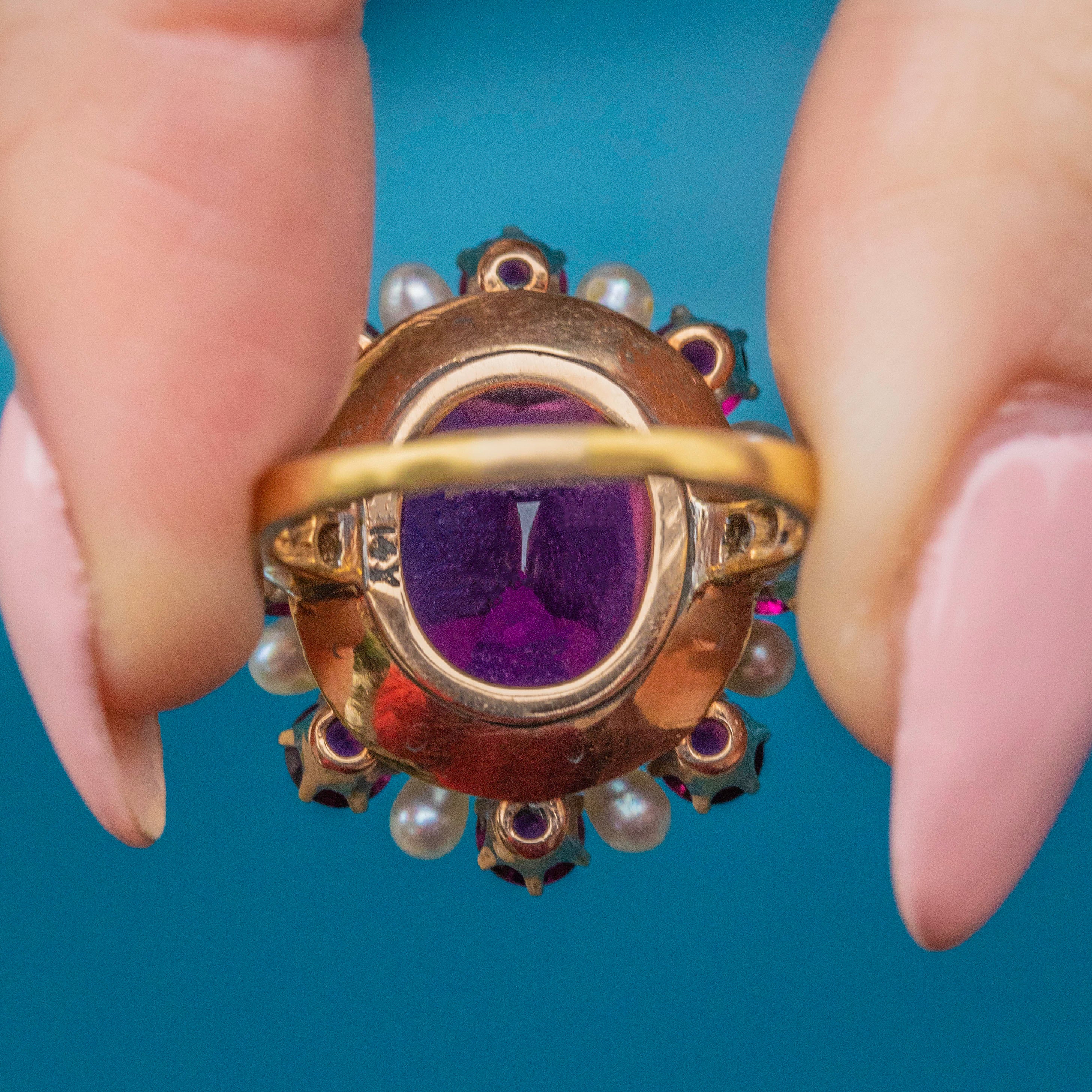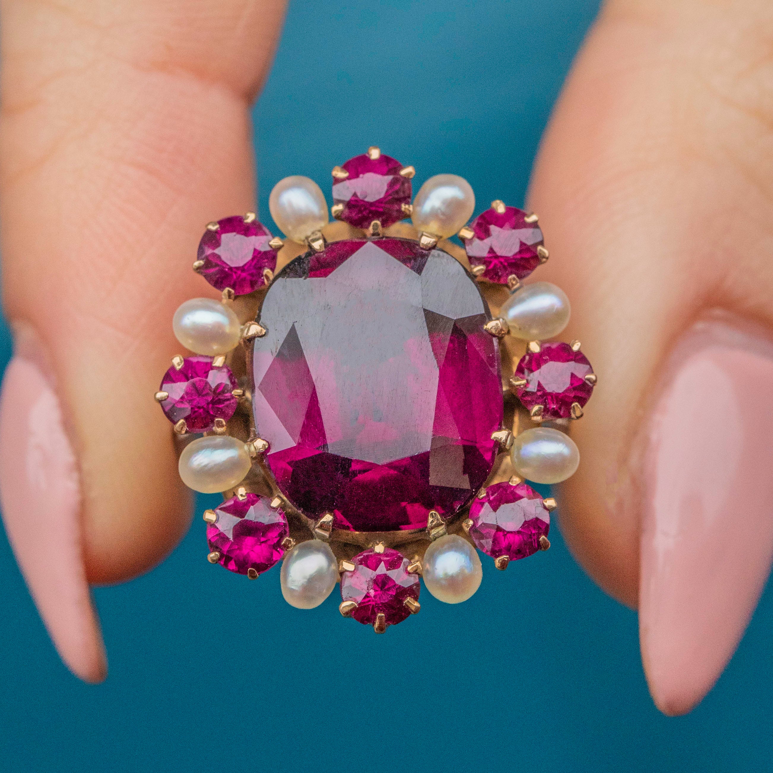 EXCELLENT. This Edwardian 14ct Gold Garnet Pearl cluster ring is in excellent condition. Her large oval Garnet is pristine, free from any scuffs or chips, as are her smaller surrounding Garnets whose facets sparkly brilliantly under the light. Her Pearls have an excellent sheen and have retained their lustre over the years. The Diamonds are all present and set securely into their 14ct Gold settings - scintillating wonderfully as you catch her sides. She's a beautiful statement ring fit for royality!