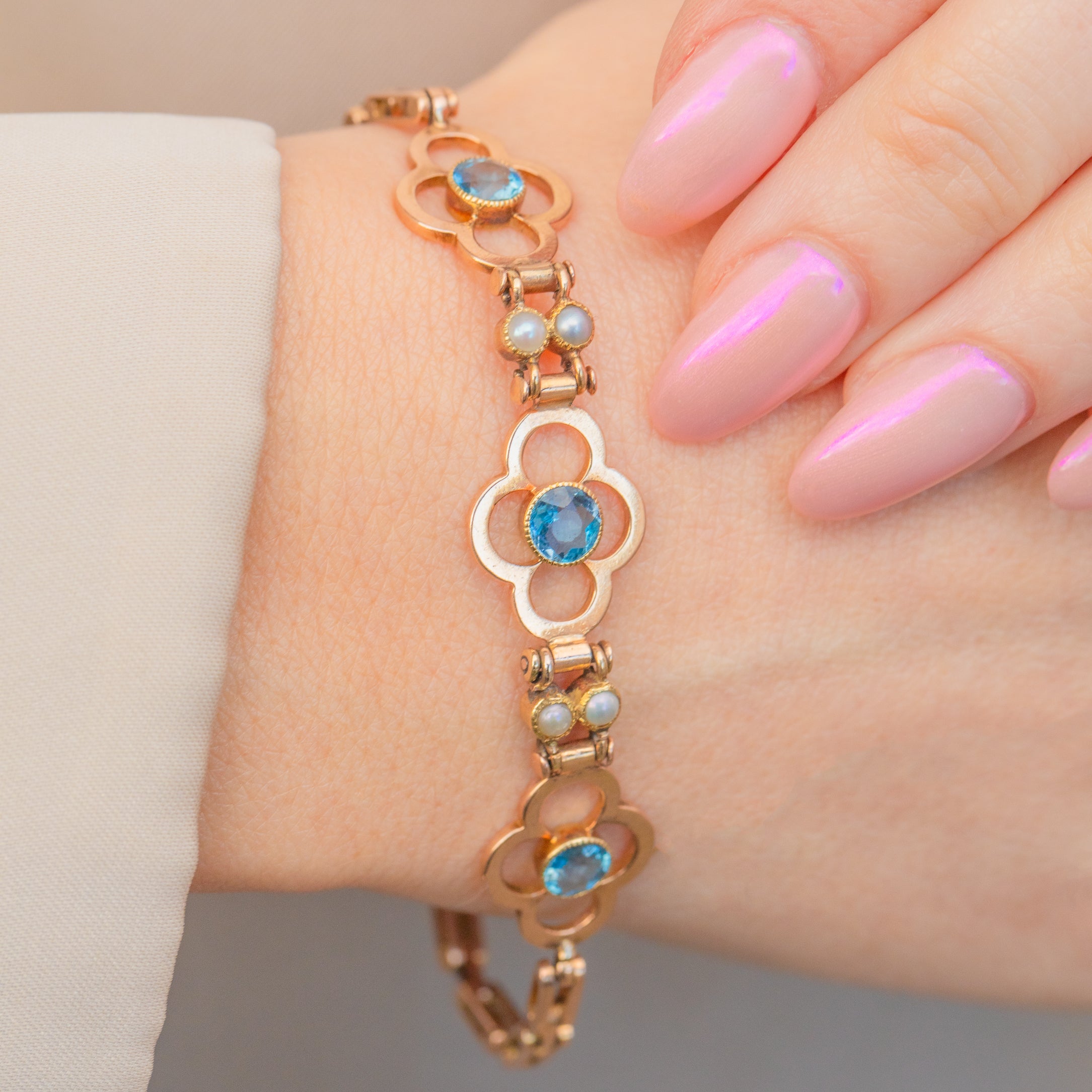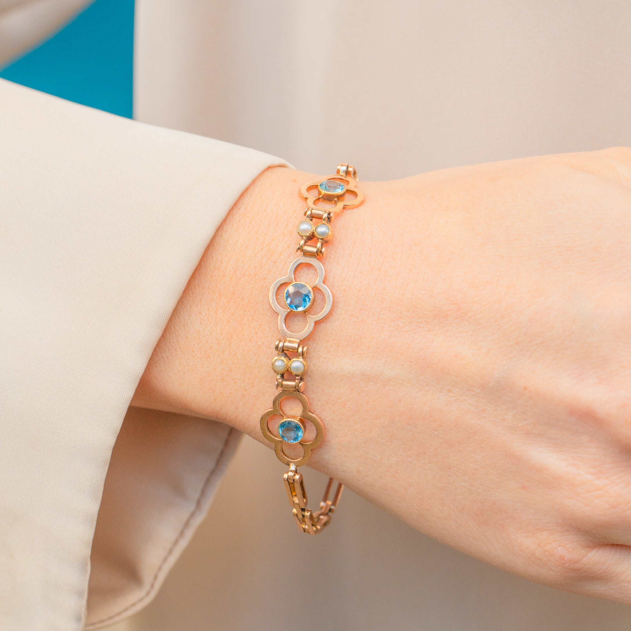This Edwardian Gold bracelet displays three radiant Aquamarines, capturing the light wonderfully and radiating serene sky-blue hues. She is accented by lustrous iridescent Pearls, their subtle brilliance perfectly complimenting the buttery 15ct Gold.