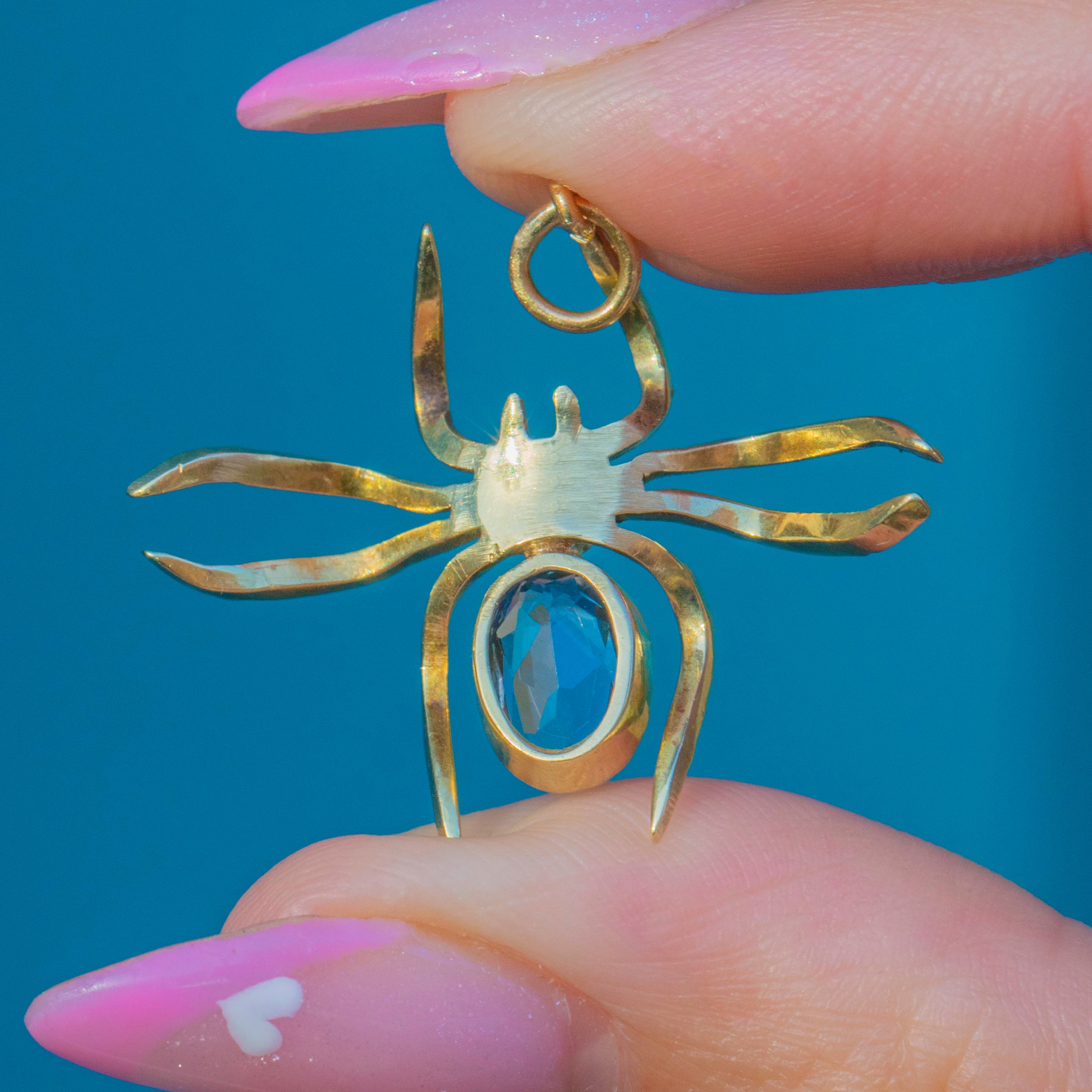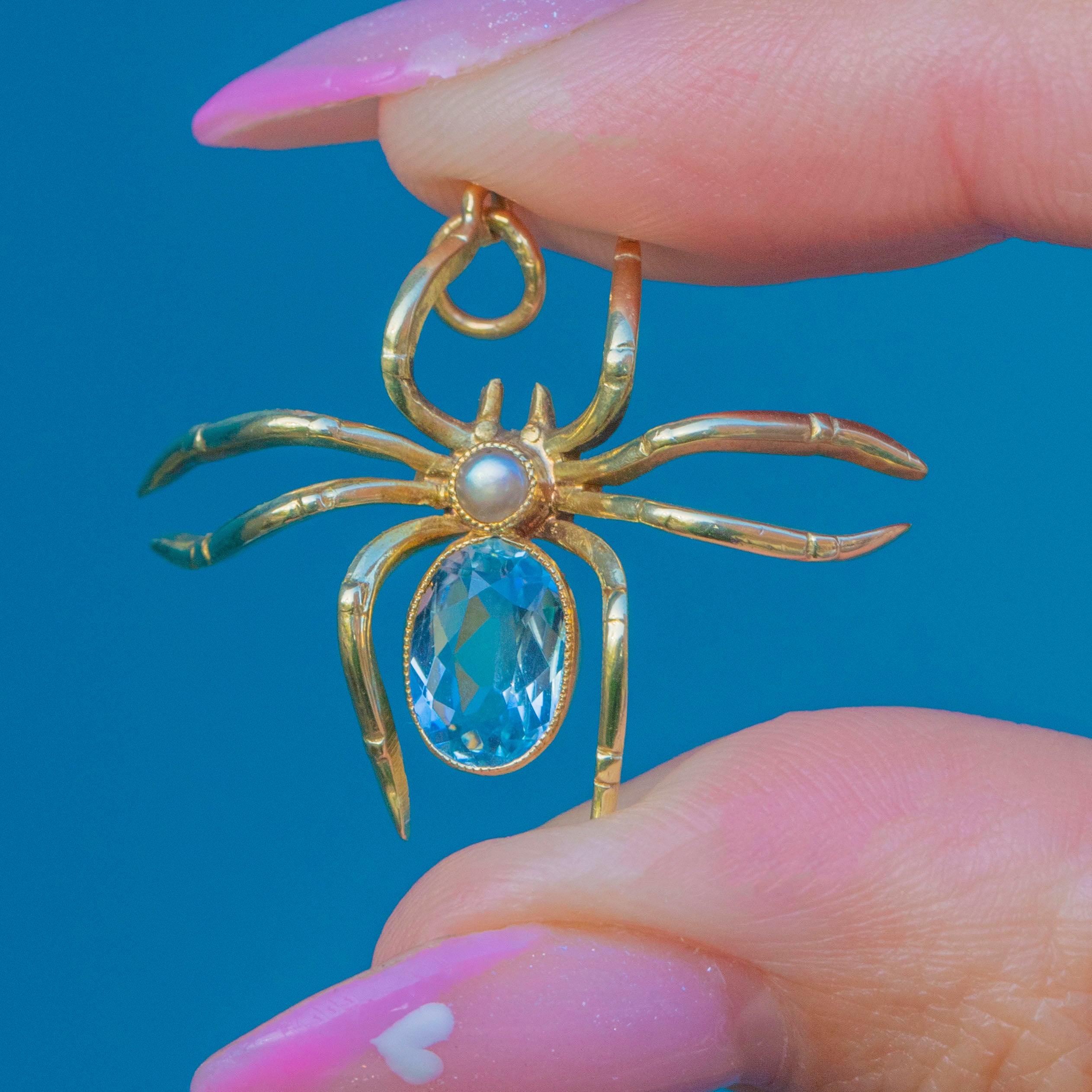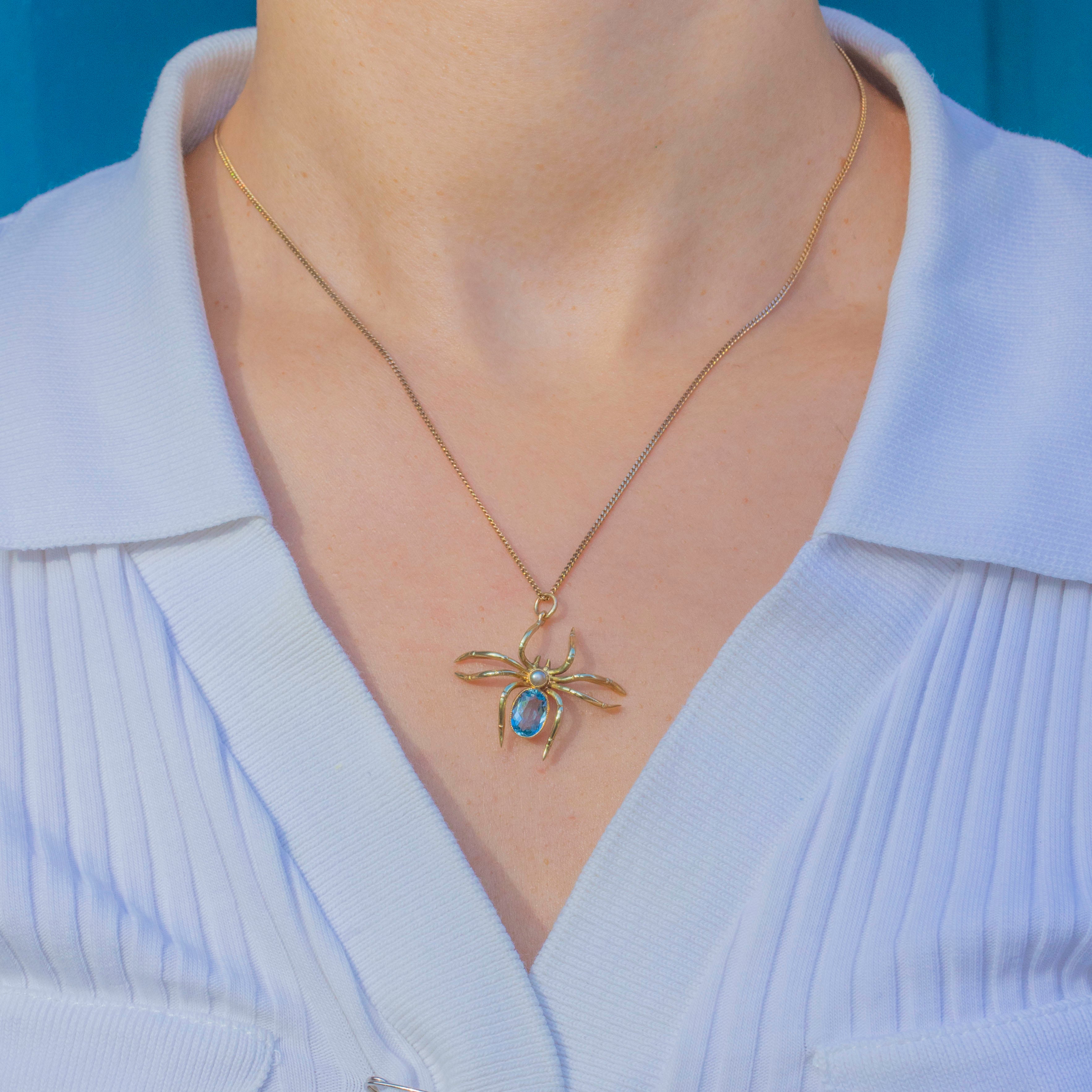 This charming Edwardian pendant is modelled as a spider, crafted in bright 15ct Yellow Gold with a glittering 0.75ct Aquamarine body and a delicate Seed Pearl head. The pastel blue of the Aquamarine sparkles beautifully against the warm Gold, giving this piece both elegance and whimsy.