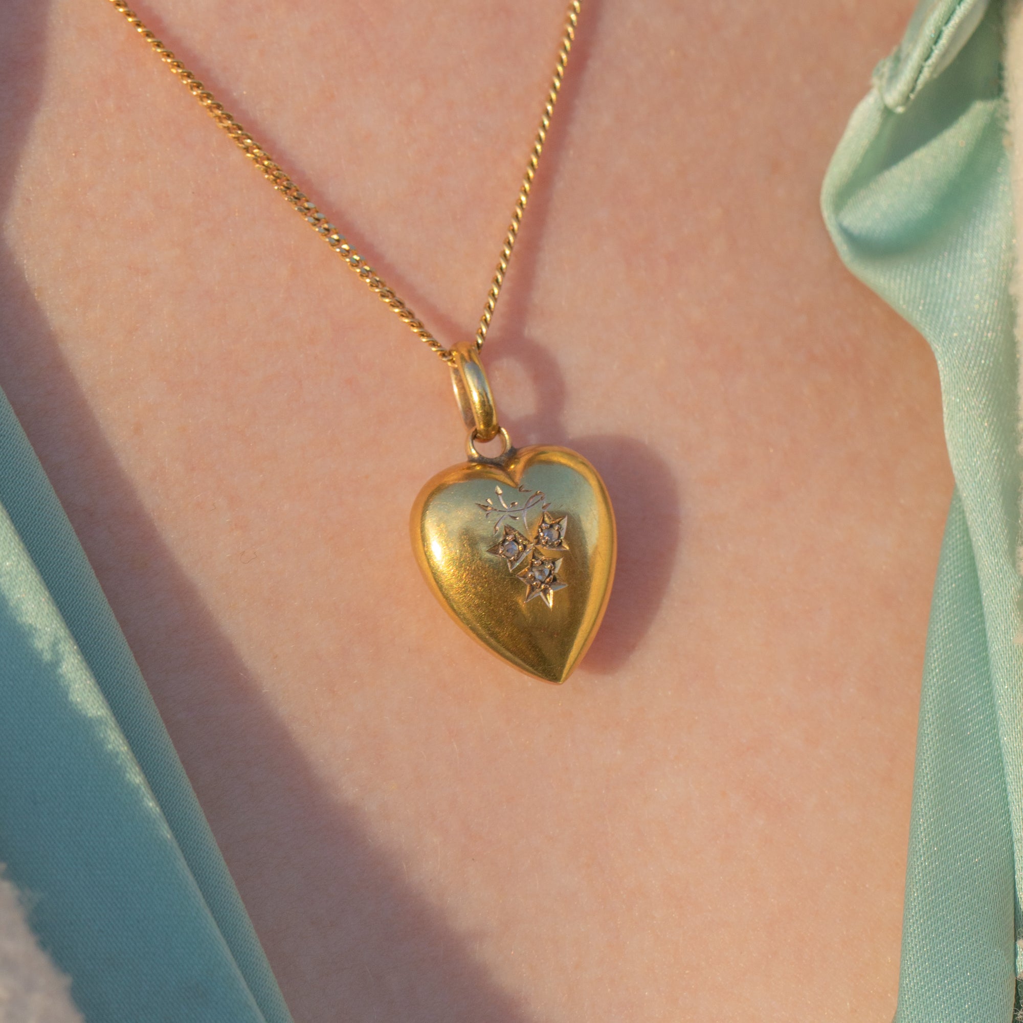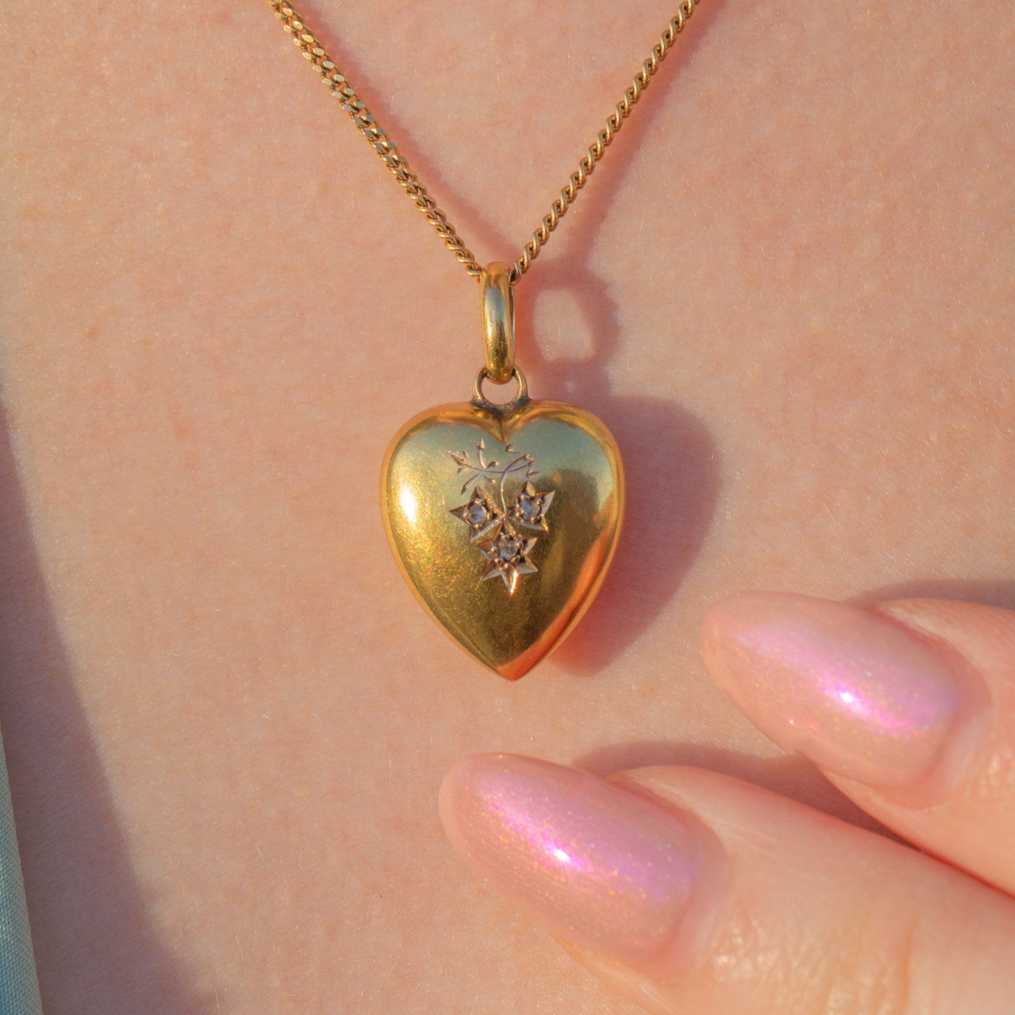 Crafted from lustrous 15ct yellow Gold, this puffy heart charm features three twinkling rose-cut Diamonds in her centre, set with gorgeous celestial star settings. Her trio of Diamonds are adorned by gorgeous ivy leaf engravings, with her natural motifs reminiscent of the romantic movement.