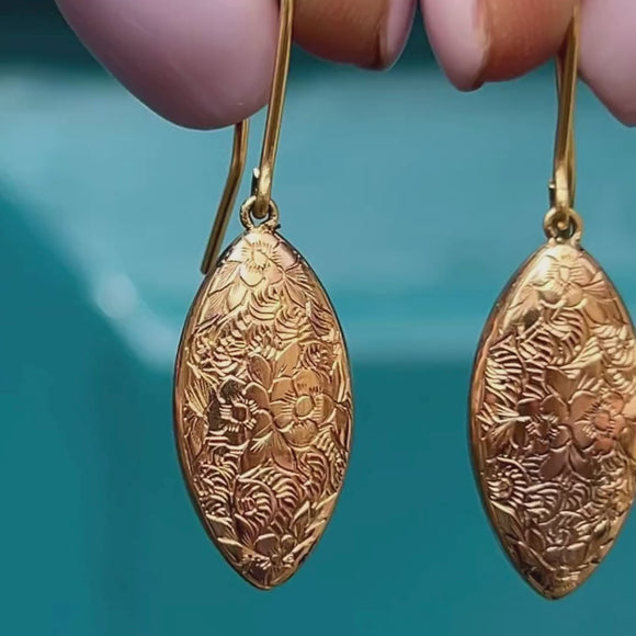 Watch as the light radiates off the smooth form of these Edwardian 15ct Gold engraved lozenge earrings! Their domed lozenge front is adorned with dainty forget-me-not engravings, a motif steeped in romantic symbolism that is often featured in antique jewellery.