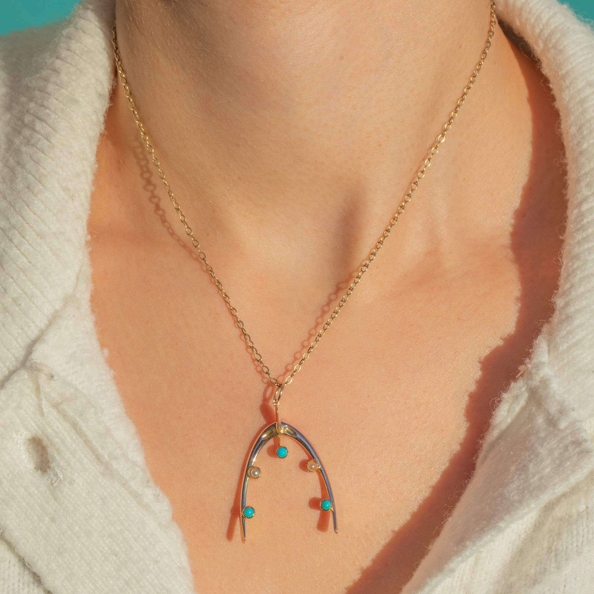 A charming Edwardian wishbone pendant crafted in rich 15ct Gold, set with petite Turquoise and a creamy Pearl along the inner arc. The open-frame silhouette feels airy and refined, adding a touch of luxury to every outfit.