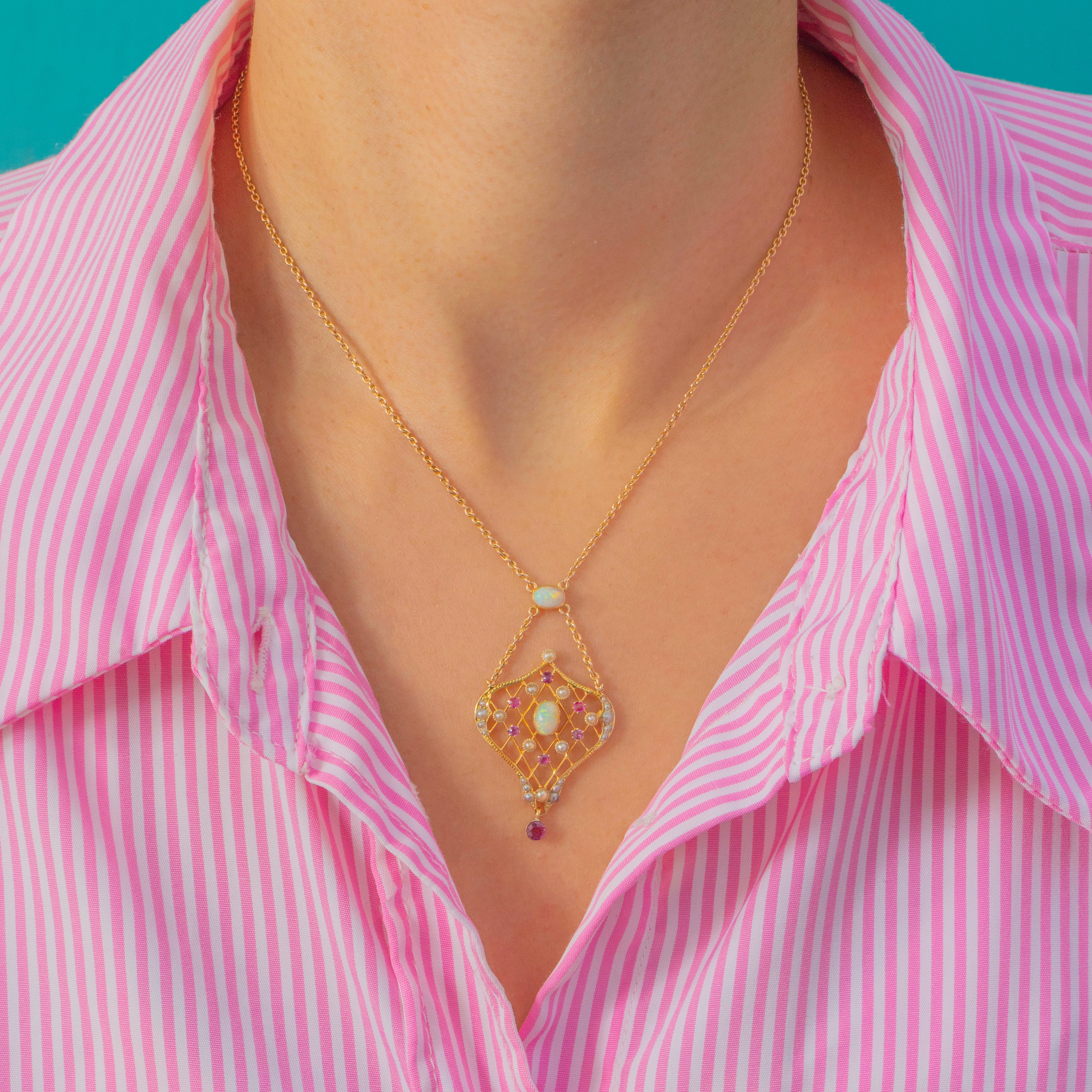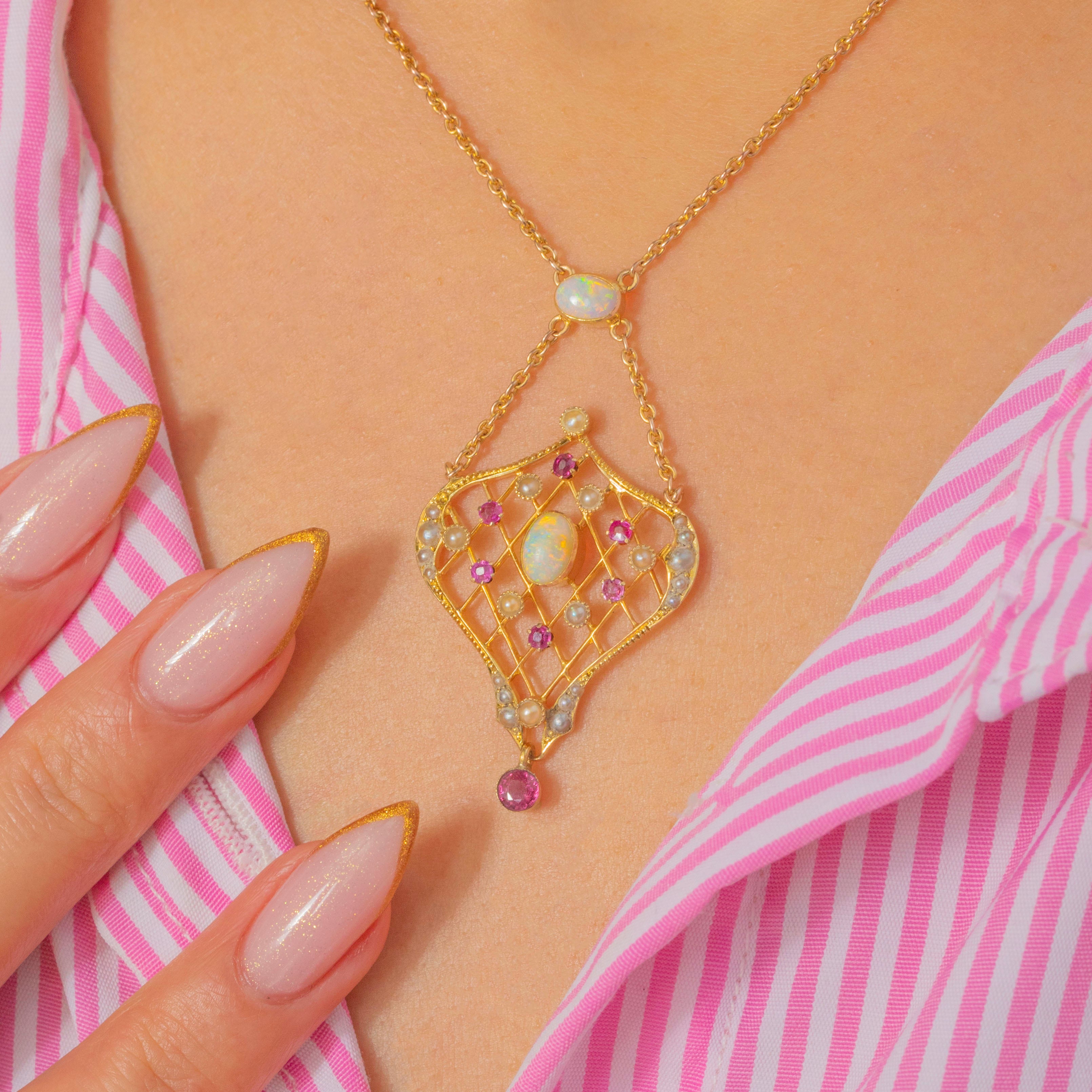 EXCELLENT: This Edwardian necklace is in superb condition with all gemstones original and securely set. The Gold retains its lovely antique hue, and the chain and clasp are strong and secure. The Opals display bright play-of-colour, the Rubies rich tone, and the Pearls excellent lustre. A wonderful and wearable example of Edwardian elegance.