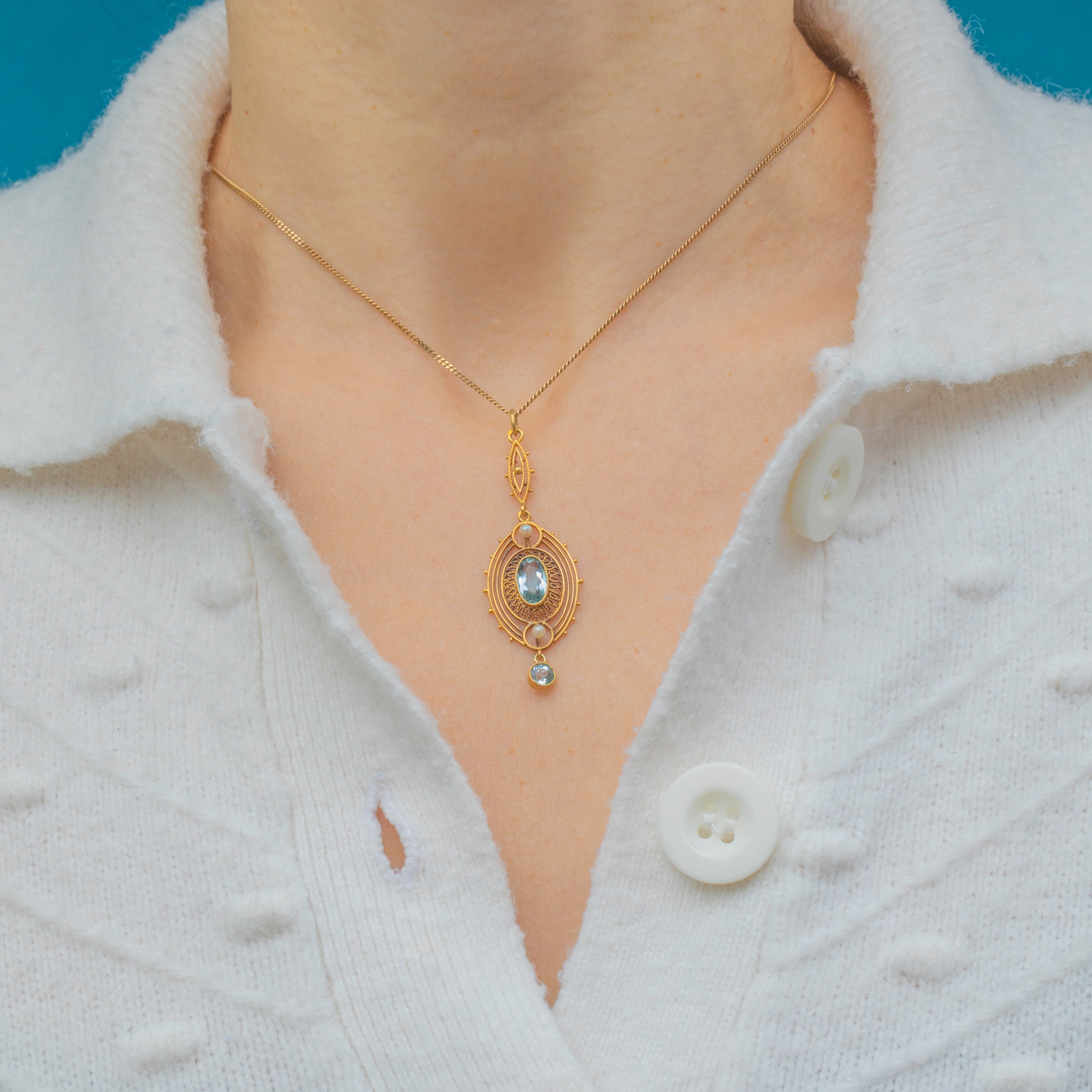 A graceful Edwardian pendant crafted in finely detailed 18ct Gold filigree, set with natural Aquamarines and Pearls. The icy blue hues of the Aquamarines shimmer beautifully against the warm Gold, their soft sparkle enhanced by the creamy lustre of the Pearls.