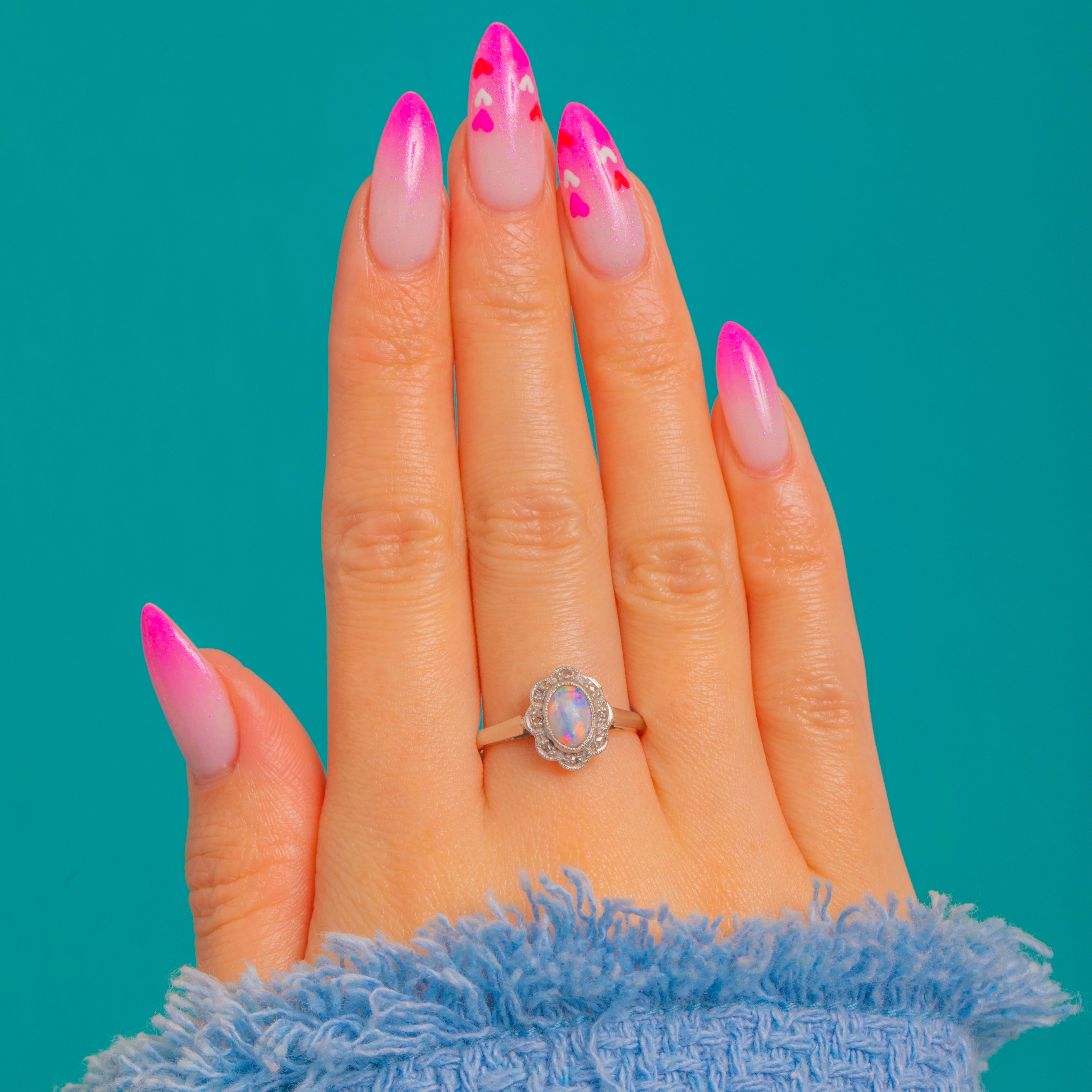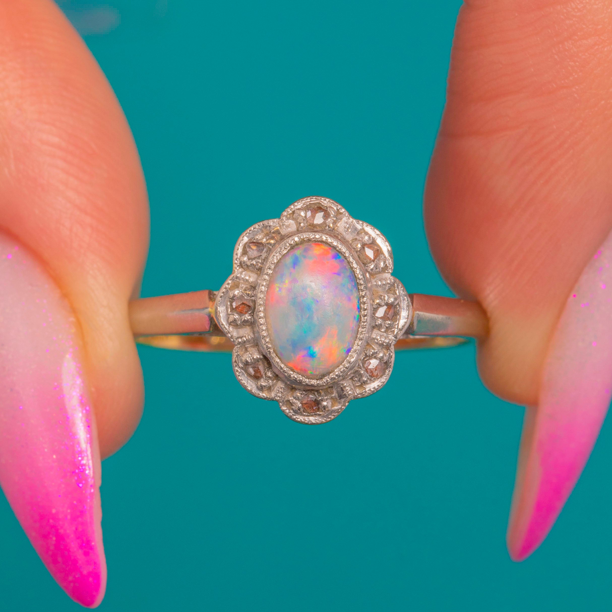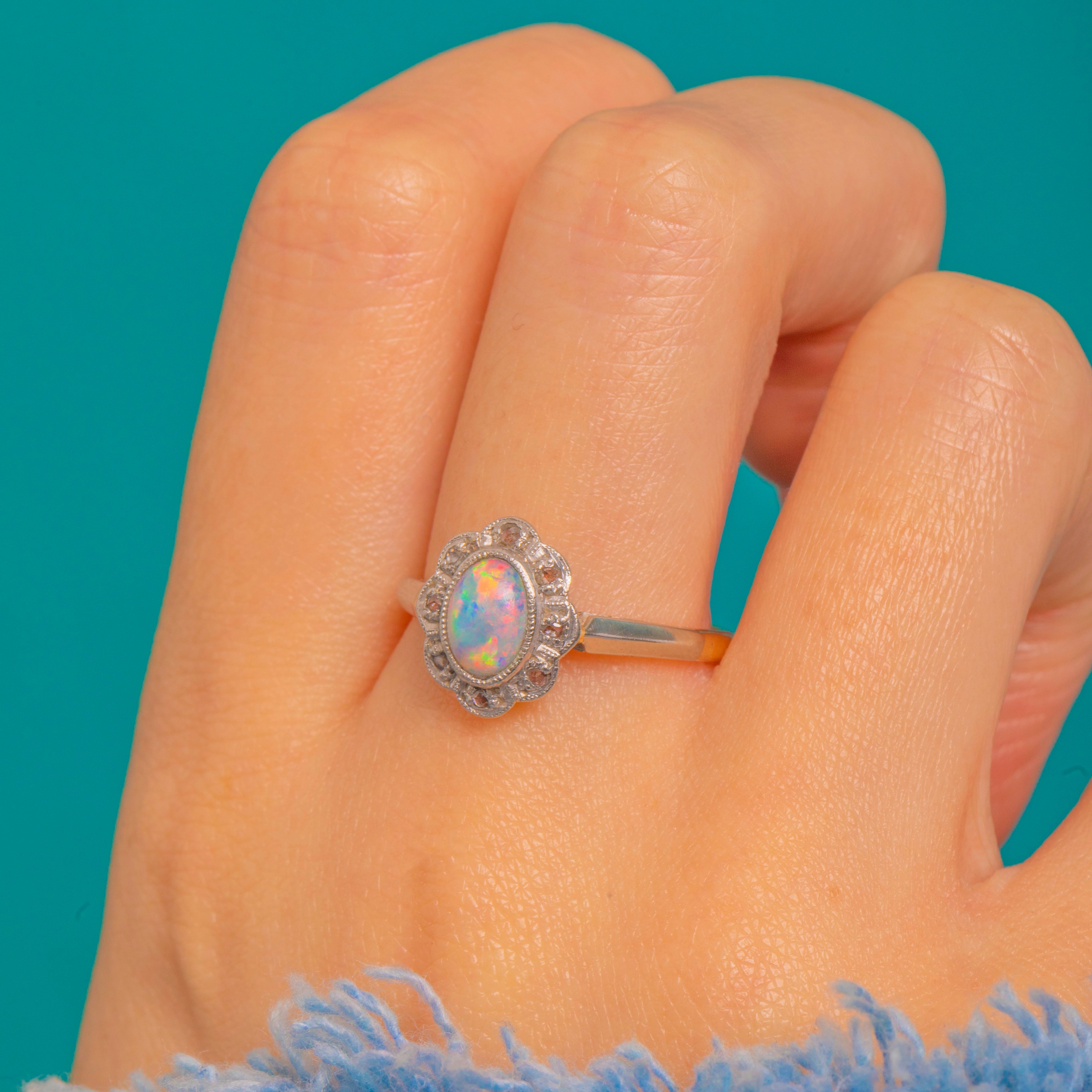 A dreamy Edwardian flower cluster ring that pairs the luminous magic of Opal with the sparkle of rose-cut Diamonds. The oval Opal cabochon (approximately 0.45ct) shimmers with vivid play-of-colour, encircled by a delicate scalloped halo of bright rose-cuts for a romantic, petal-like silhouette. Fine milgrain accents and the low, dainty profile enhance its refined elegance.