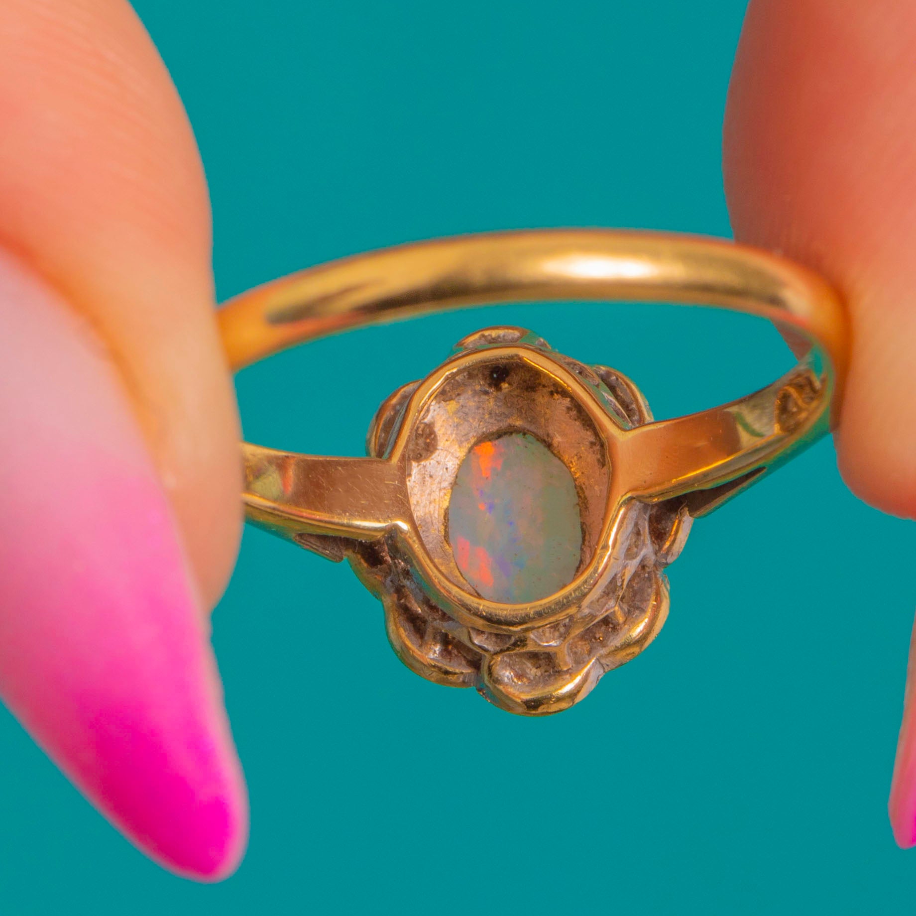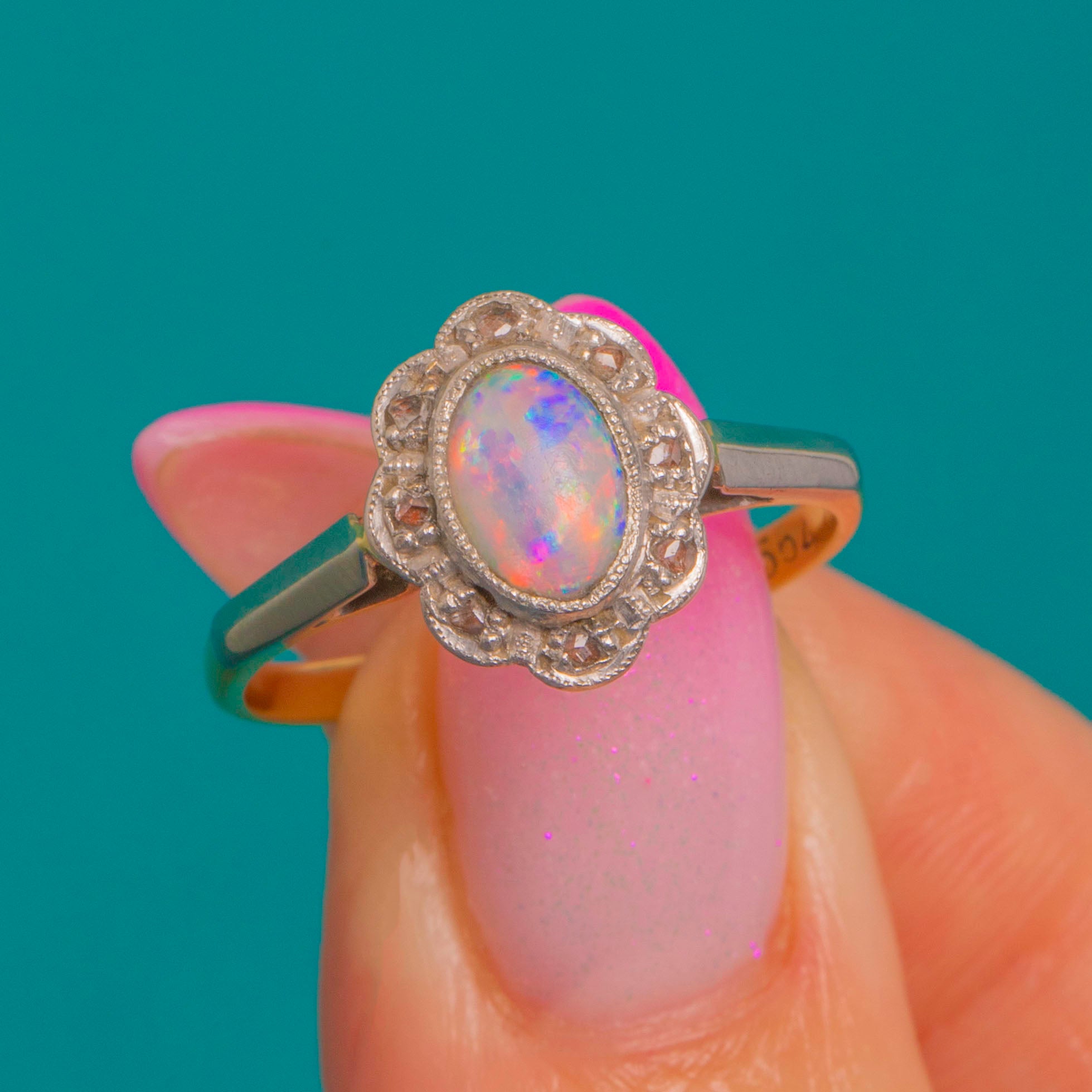 EXCELLENT: The Opal is bright with strong play-of-colour and no obvious chips or abrasions visible; the rose-cut Diamonds are lively and well-matched. The settings are secure with crisp milgrain, and the shank shows only light surface wear consistent with age with subtle patina in recessed areas. No visible repairs or resizing.
