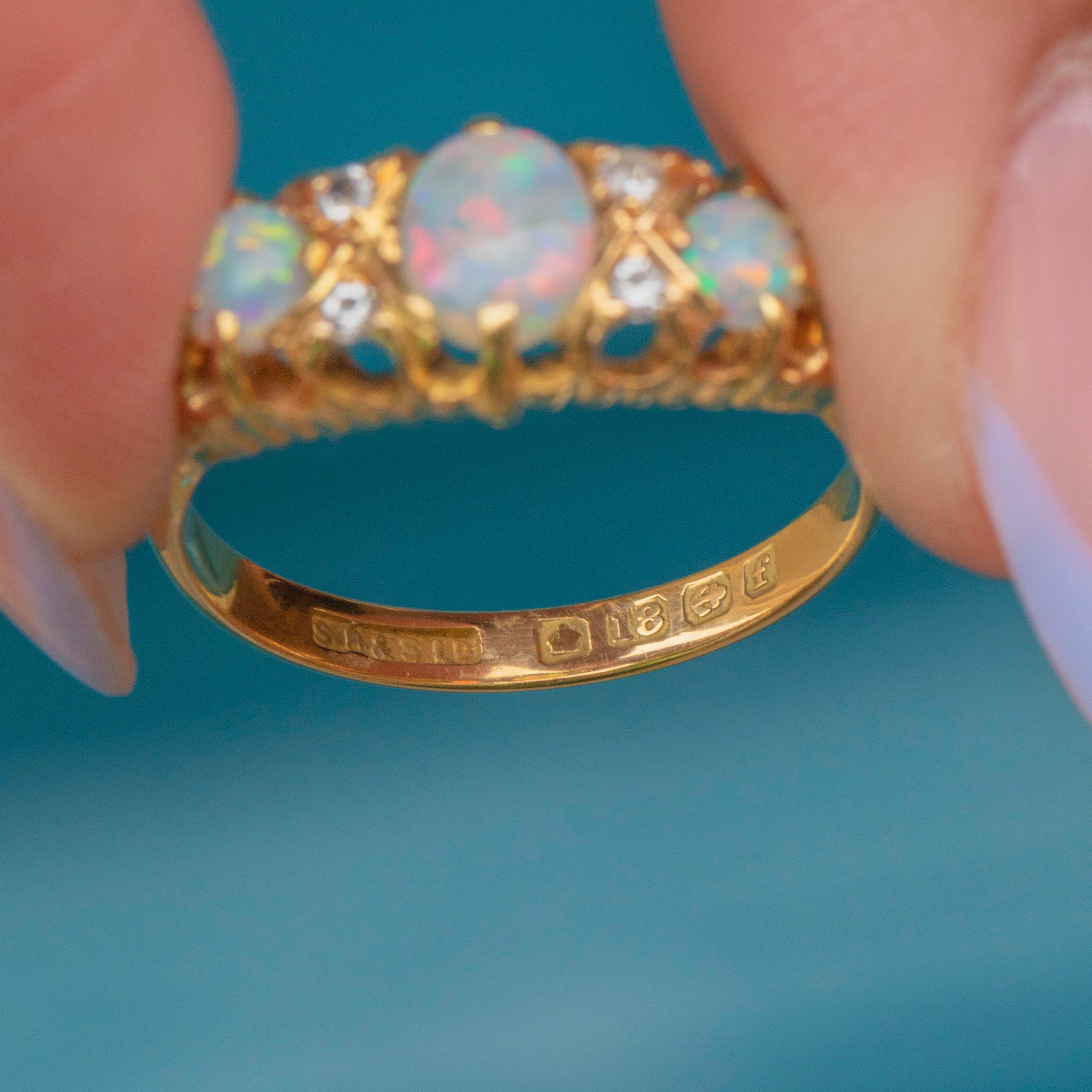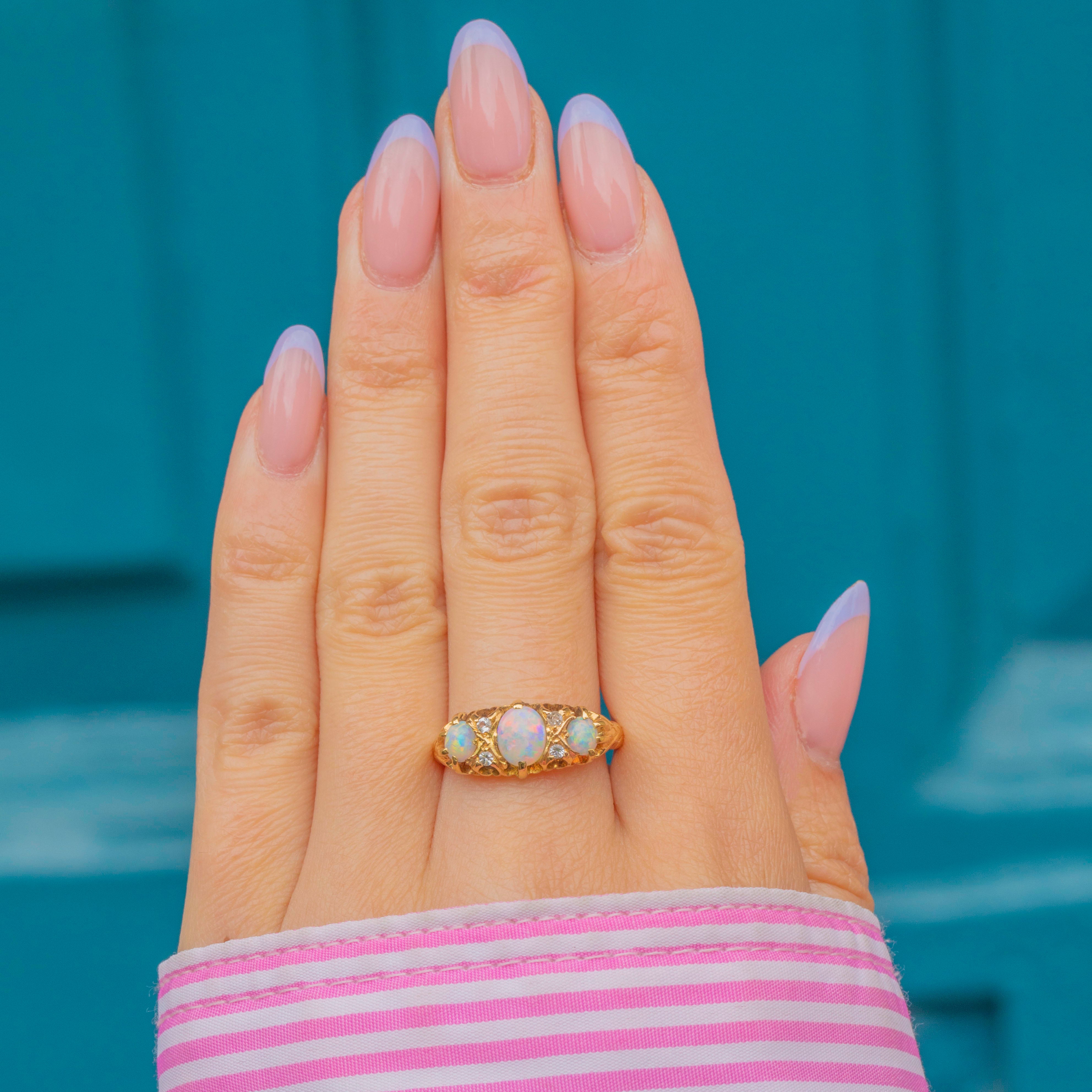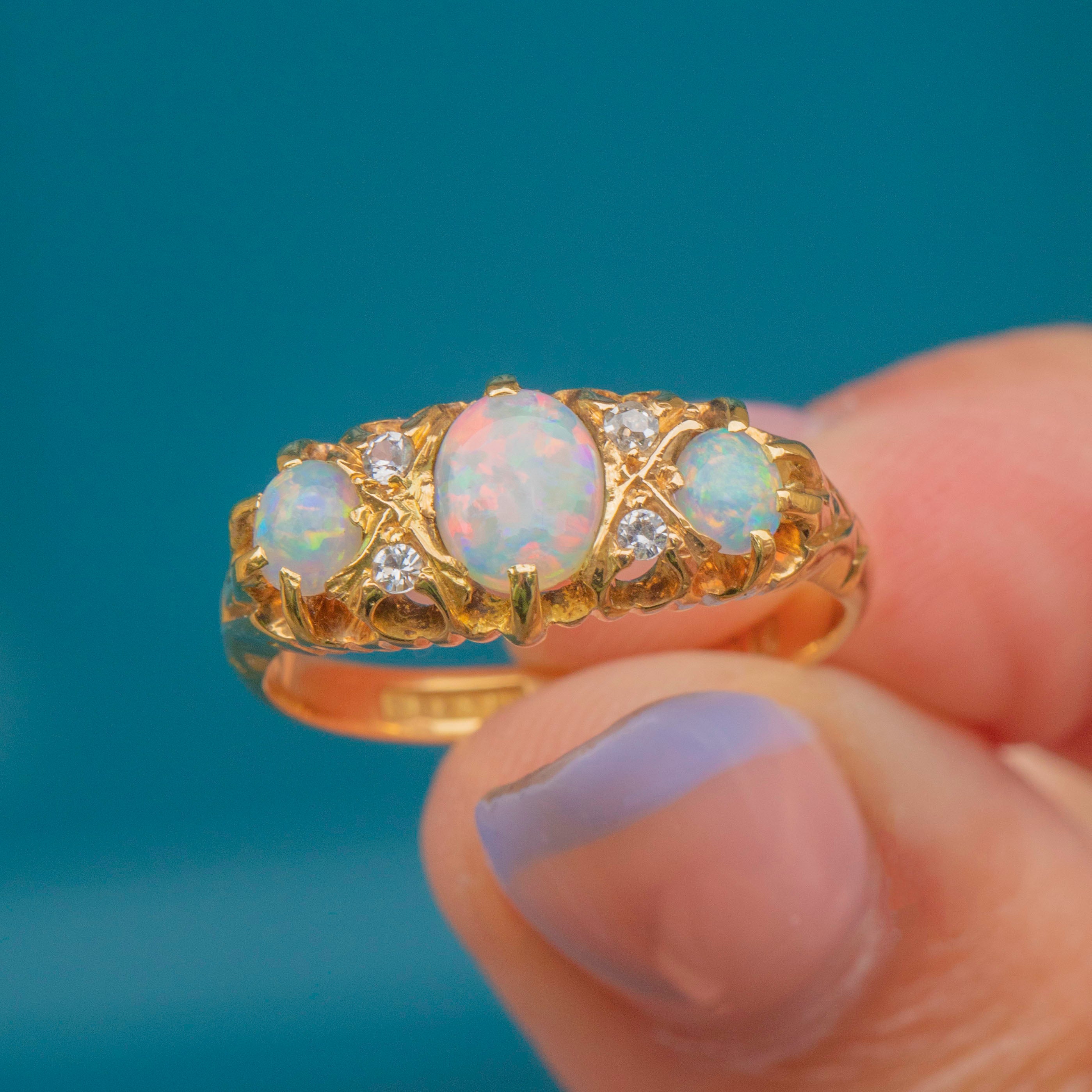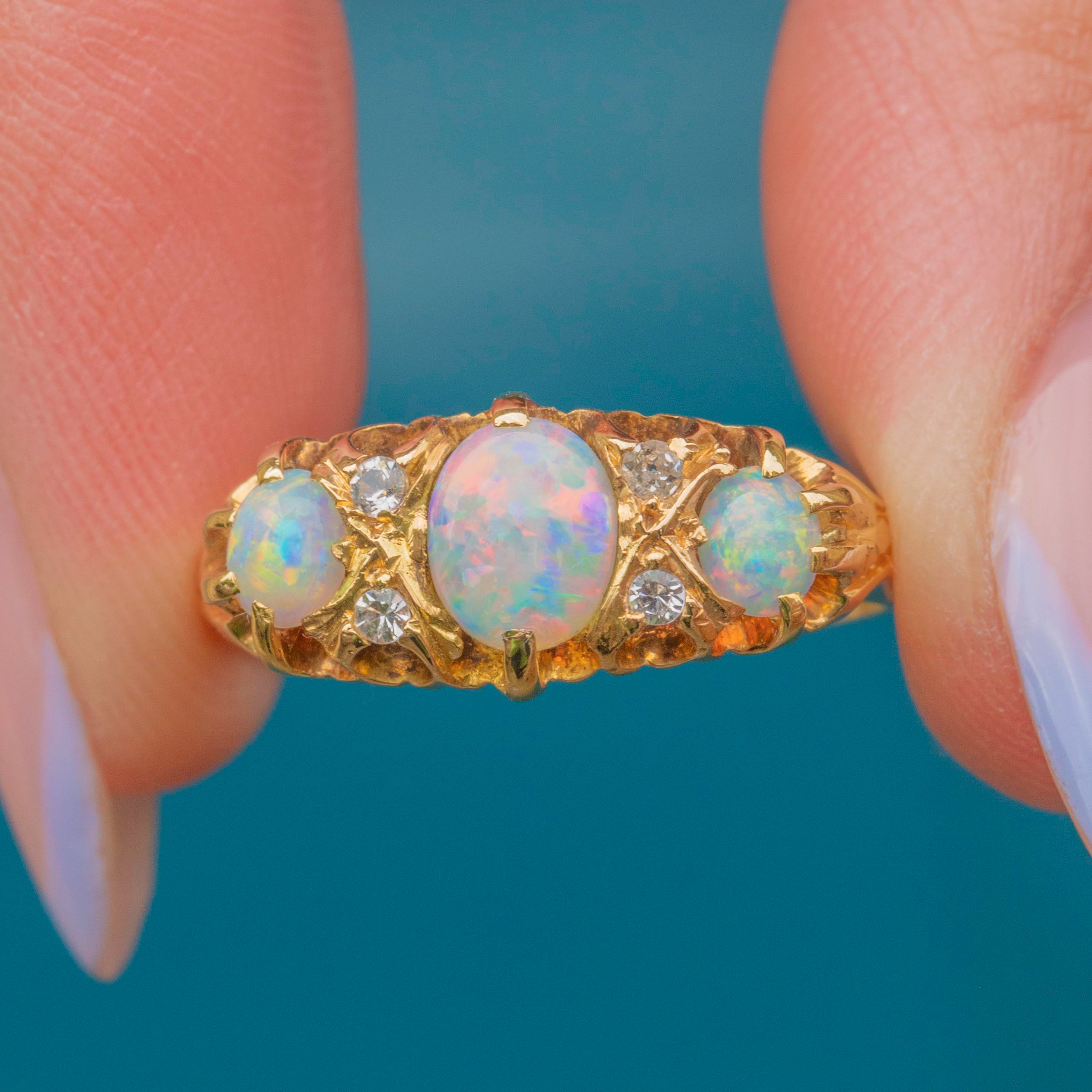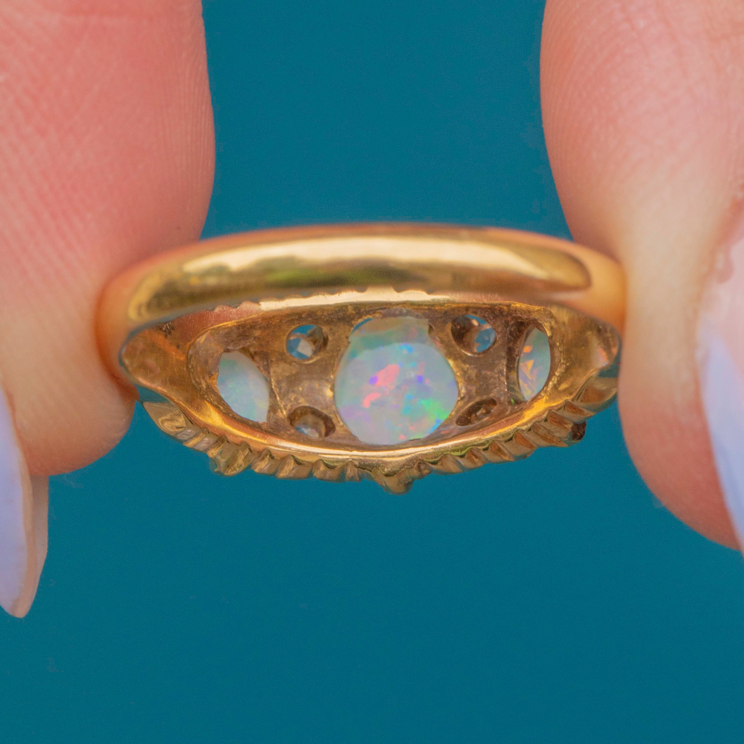 EXCELLENT: This Edwardian 18ct Gold Opal Diamond ring is in excellent condition. Each gemstone is in fabulous condition and secure within its settings. There is some very minor surface wear to the inner band commensurate with age, though this cannot be seen when wearing. With little else to note, she is in brilliant condition!