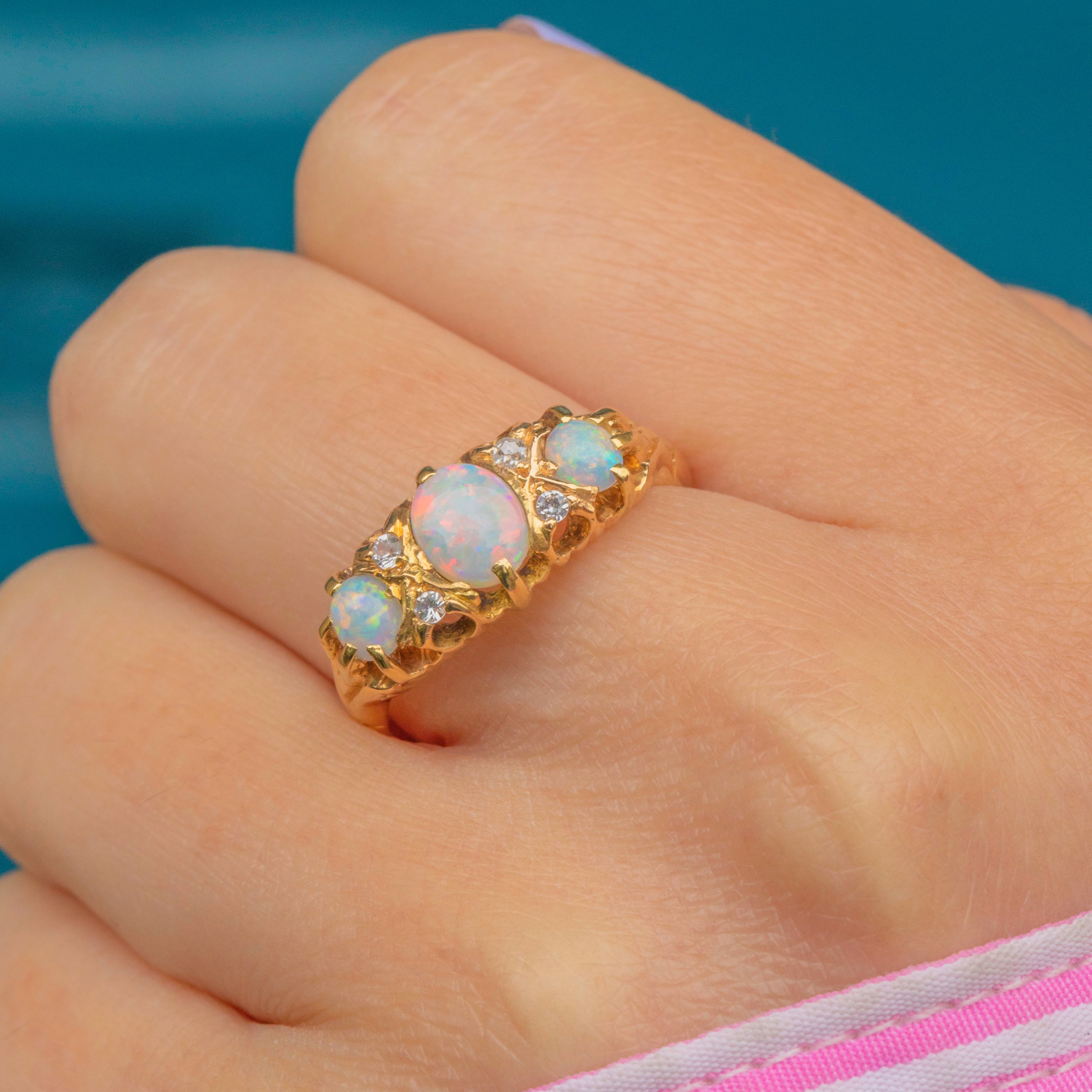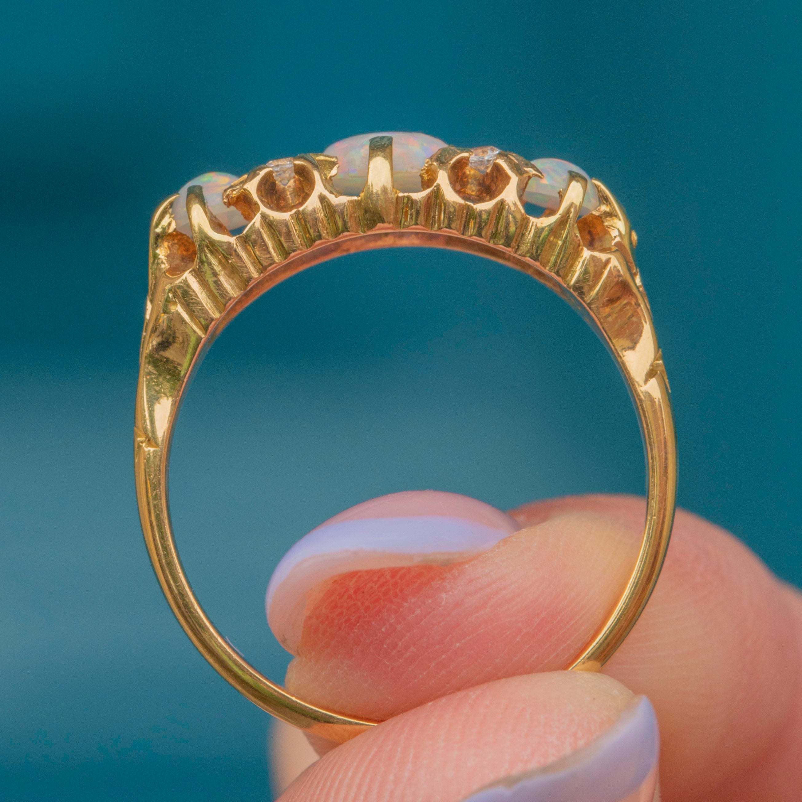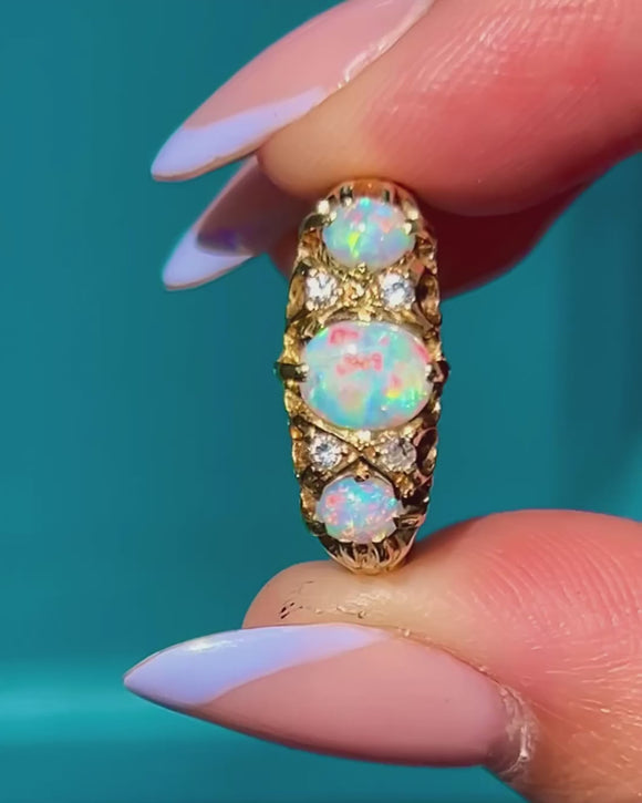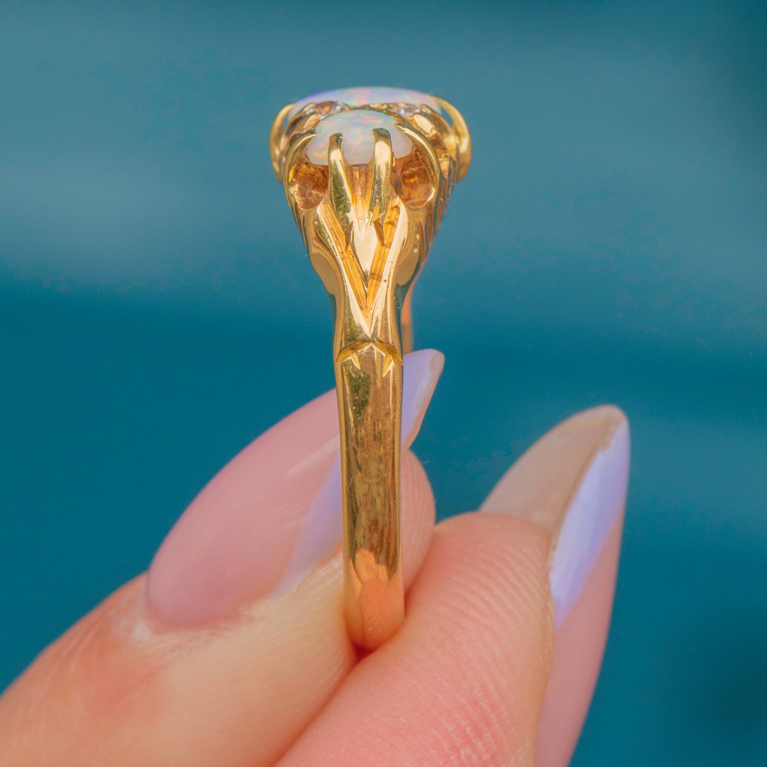 This exquisite Edwardian 18ct Gold Opal Diamond ring is a mesmerising example of Edwardian craftsmanship.