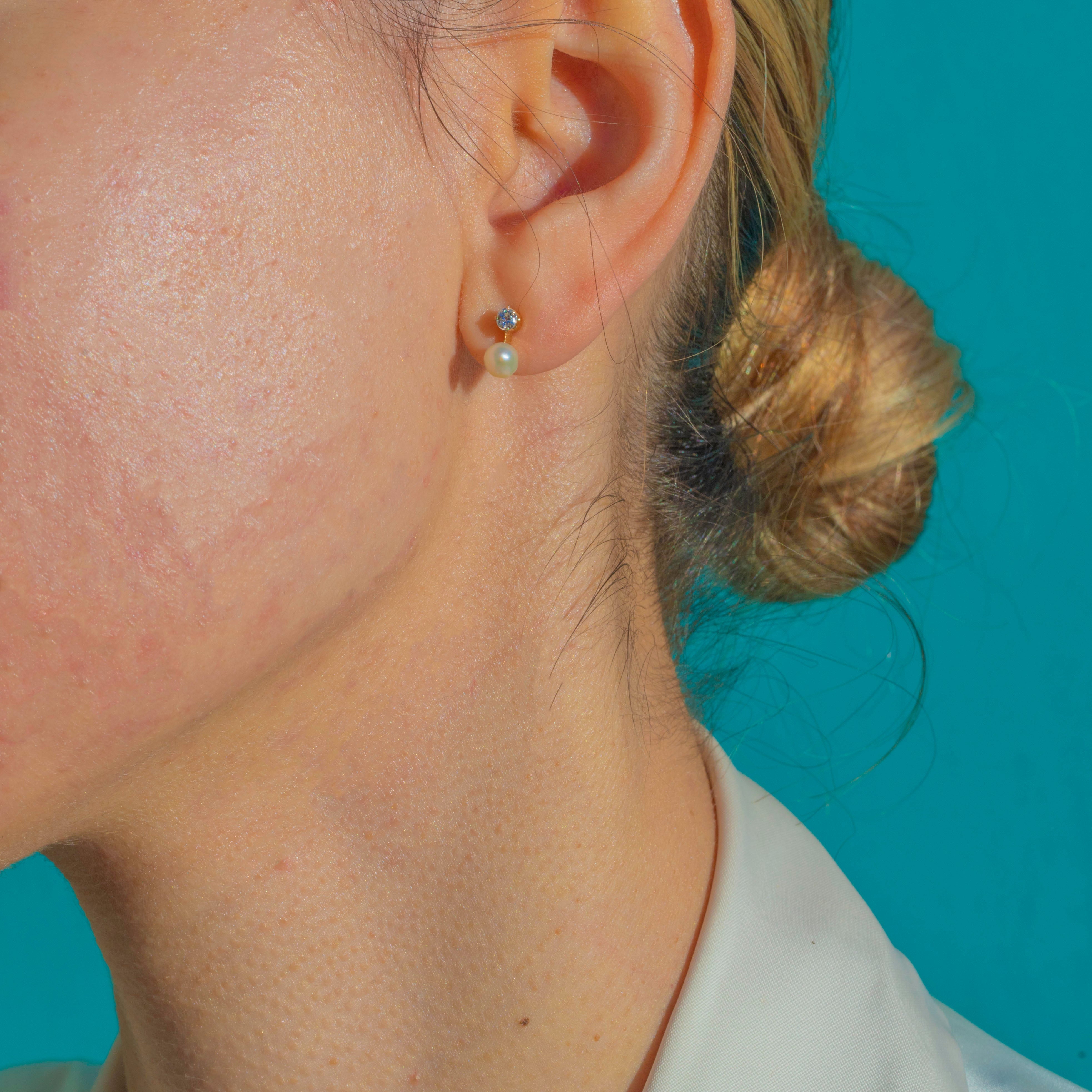 These Edwardian 18ct Gold Pearl and Diamond studs are an elegant and timeless antique pair. Each earring features a lustrous 5mm Pearl accented by a bright Diamond, adding a delicate sparkle that sits beautifully on the ear.