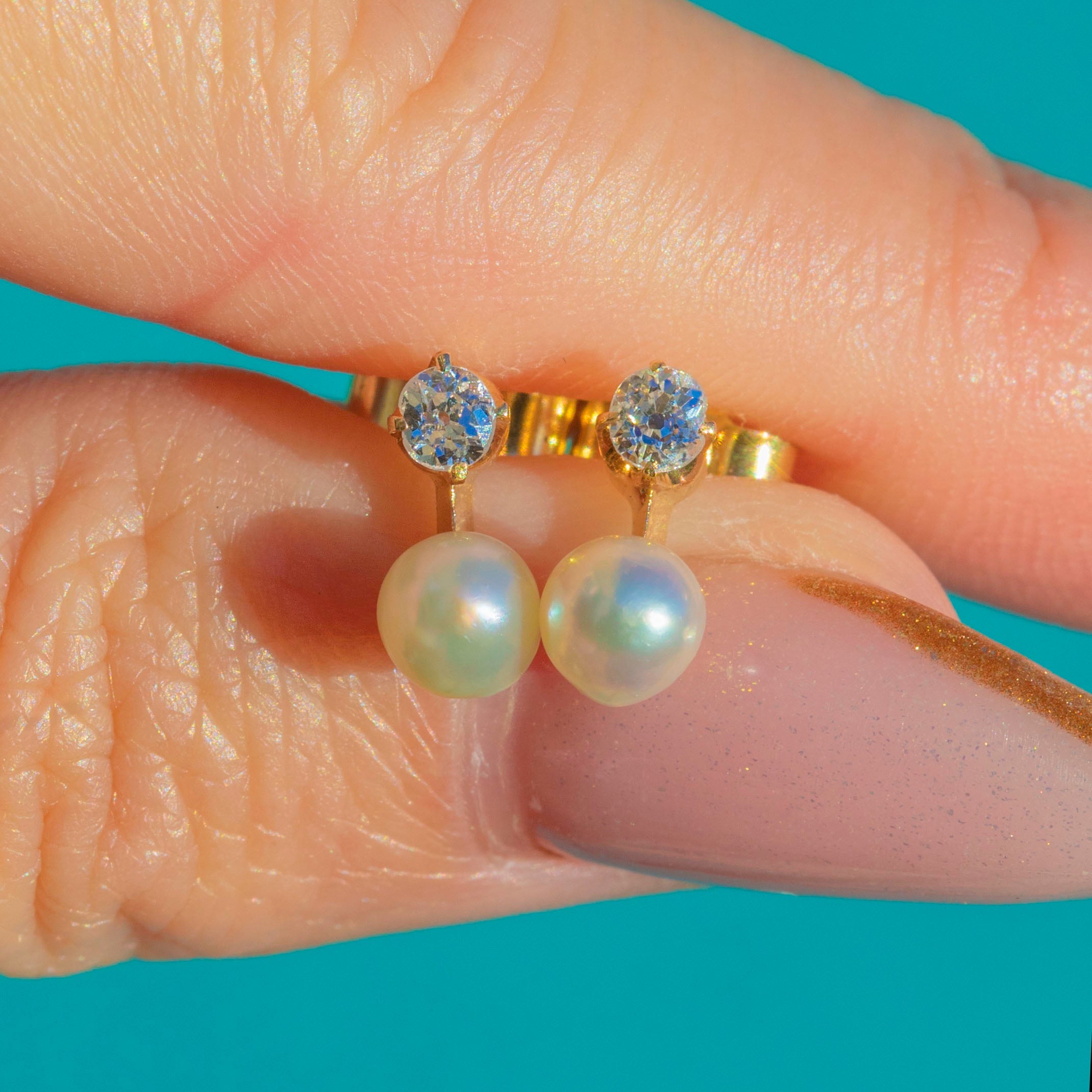EXCELLENT: Pearls are lustrous and well-matched with no chips or cracks. Diamonds are bright and securely set with no significant wear. Gold settings show only minimal surface wear in keeping with age. A beautifully preserved Edwardian pair.