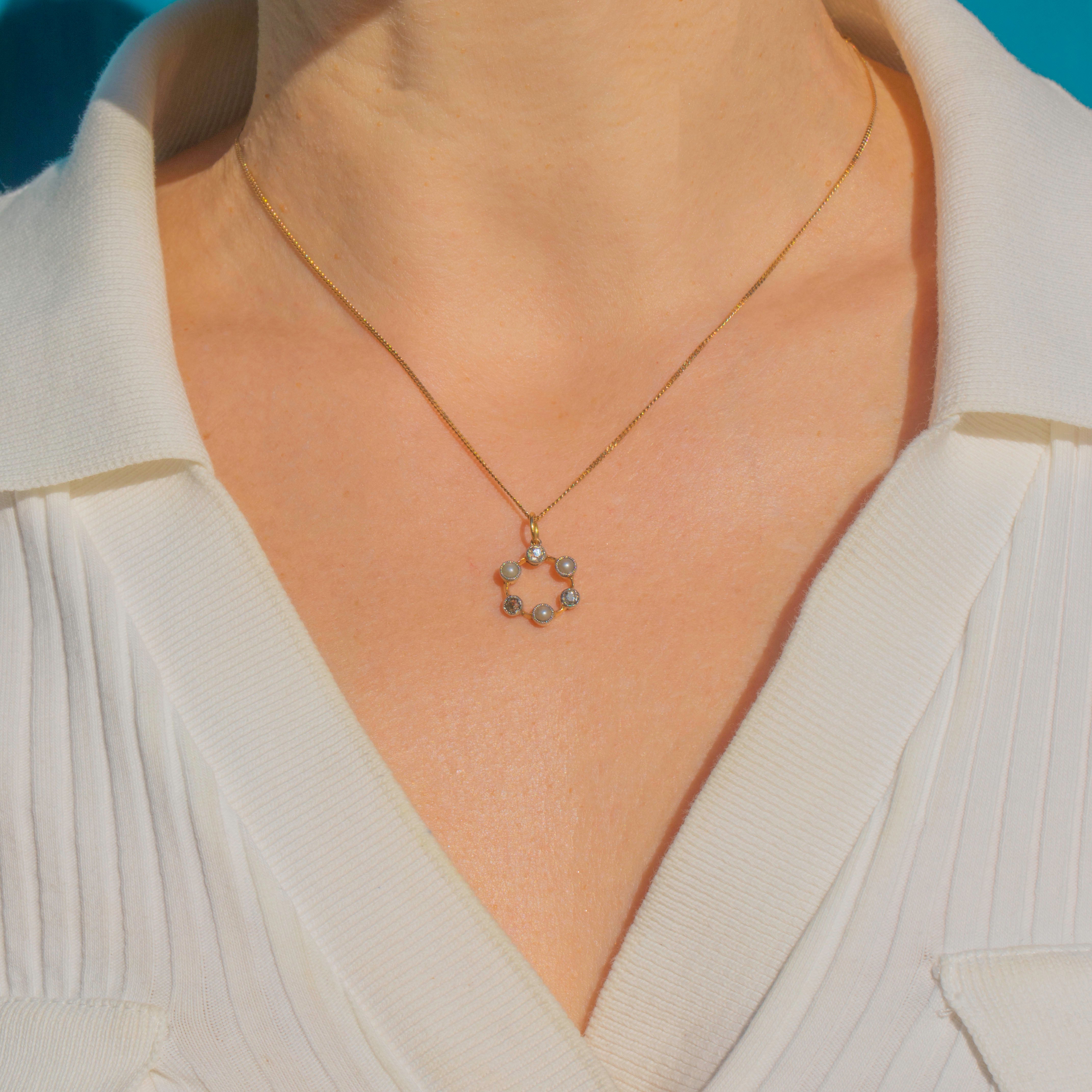 The combination of luminous Pearls and glittering old mine-cut Diamonds is timeless, and the roundel form was a popular motif around 1900–1910, embodying grace and refinement. This versatile little charm would be equally beautiful worn alone on a chain or as part of a curated charm collection.