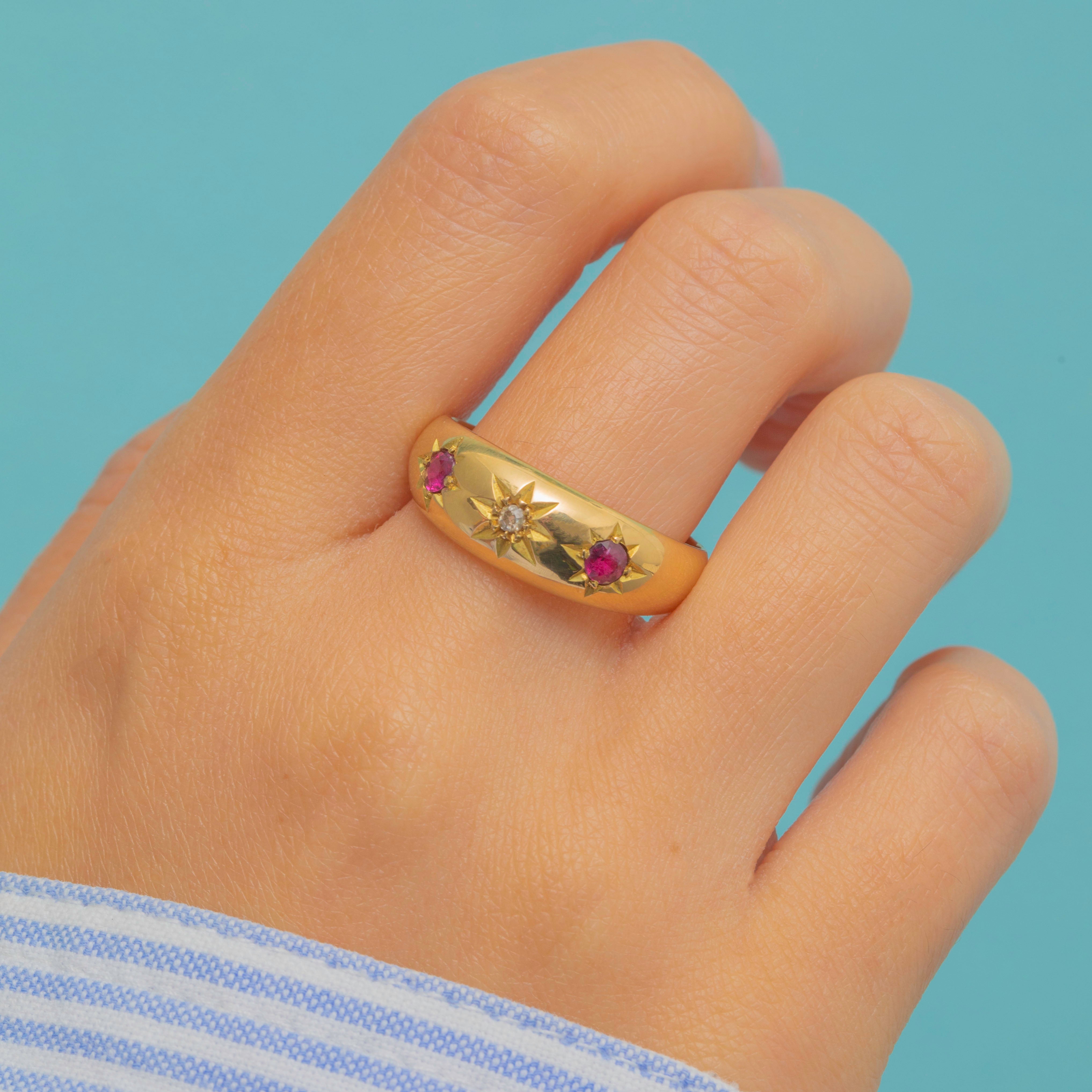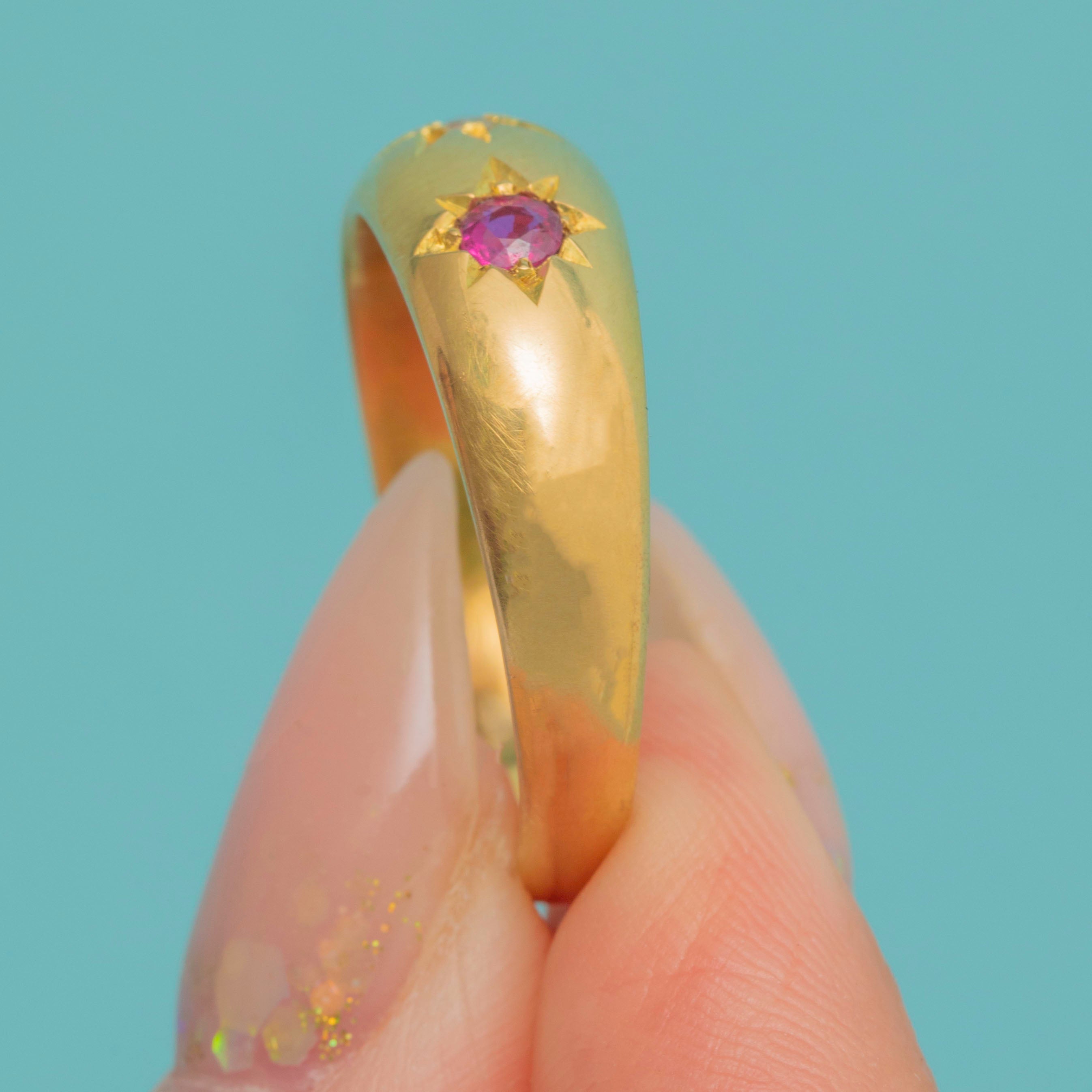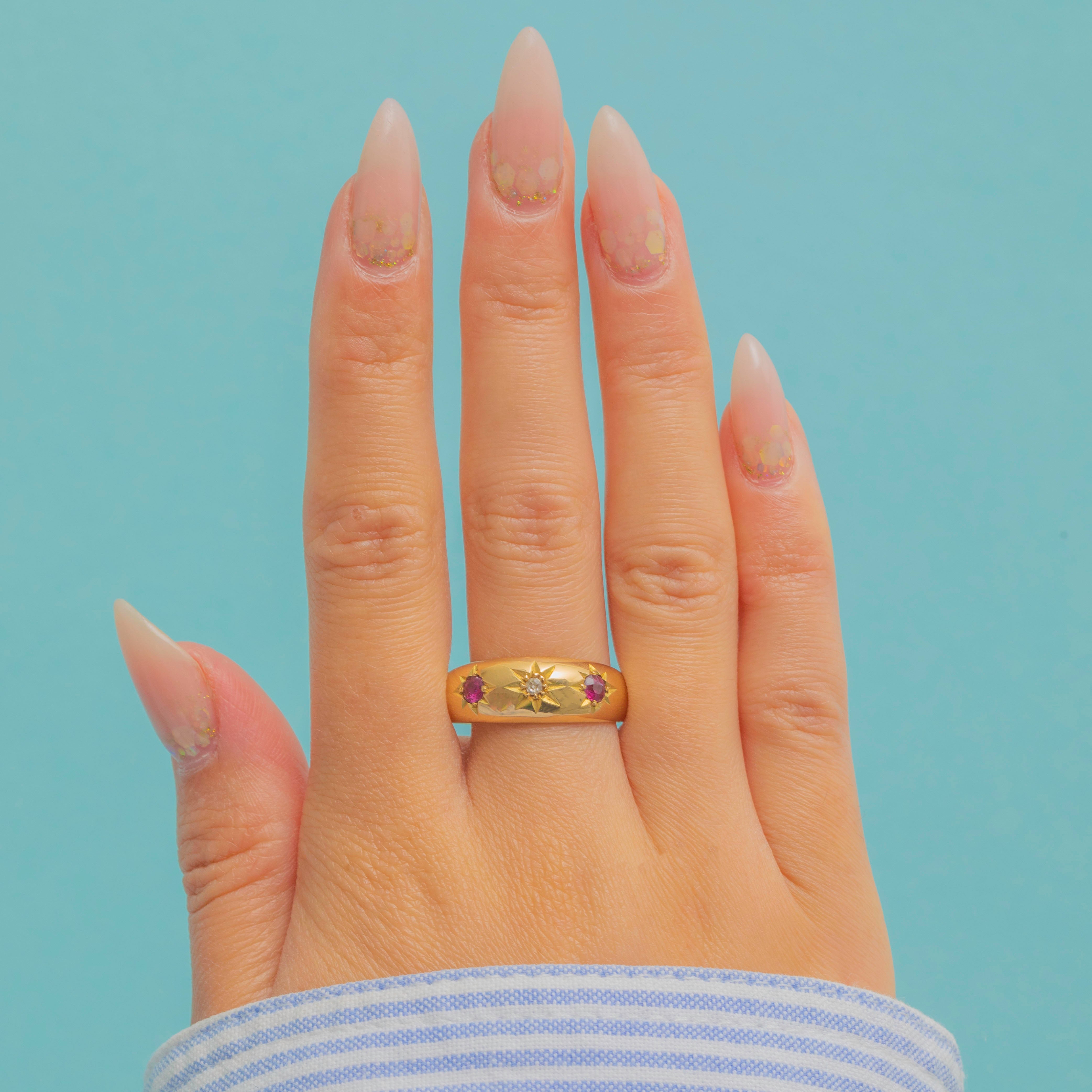 This Antique Gypsy ring is a wonderful Chester-made treasure from 1918. Crafted in solid 18ct Gold, the band is flush-set with vibrant natural Rubies and a sparkling Rose-cut Diamond, creating a striking yet wearable design perfect for stacking or wearing solo.