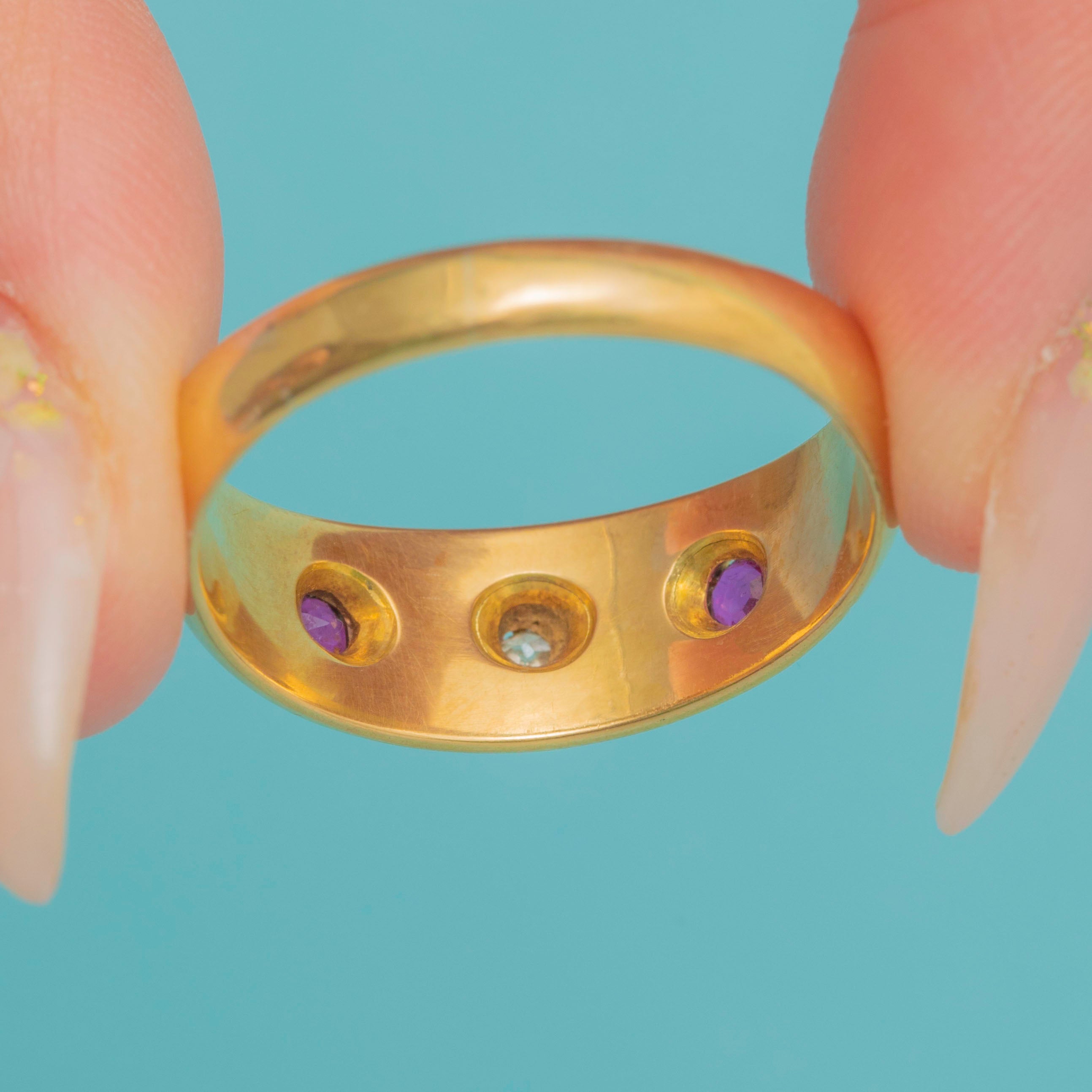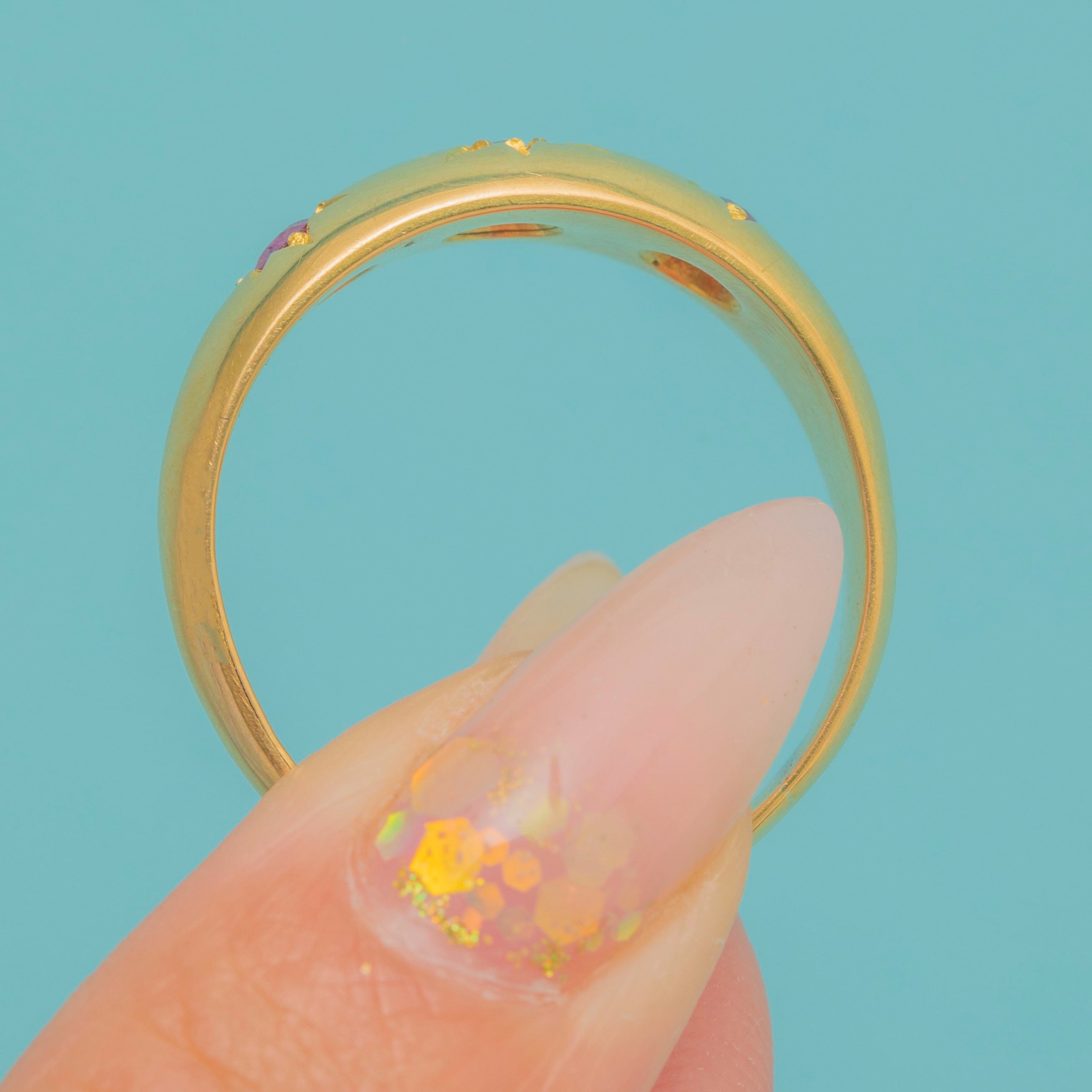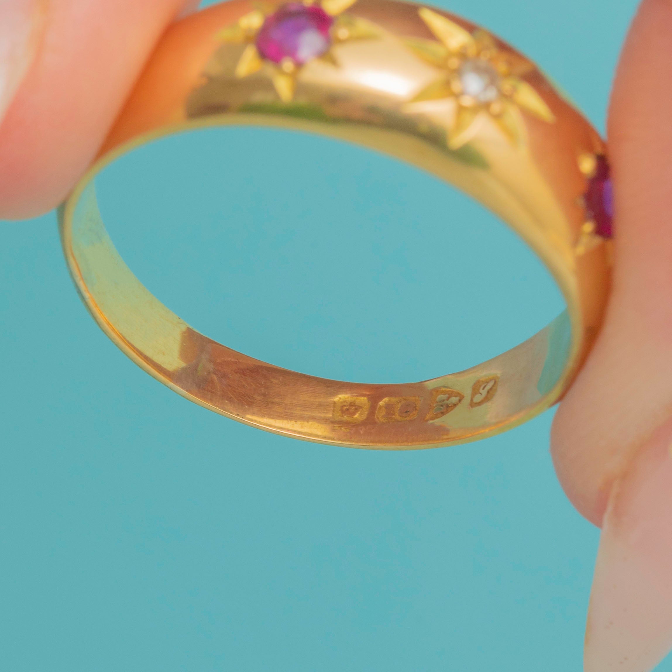 This Antique Gypsy ring is a wonderful Chester-made treasure from 1918. Crafted in solid 18ct Gold, the band is flush-set with vibrant natural Rubies and a sparkling Rose-cut Diamond, creating a striking yet wearable design perfect for stacking or wearing solo.