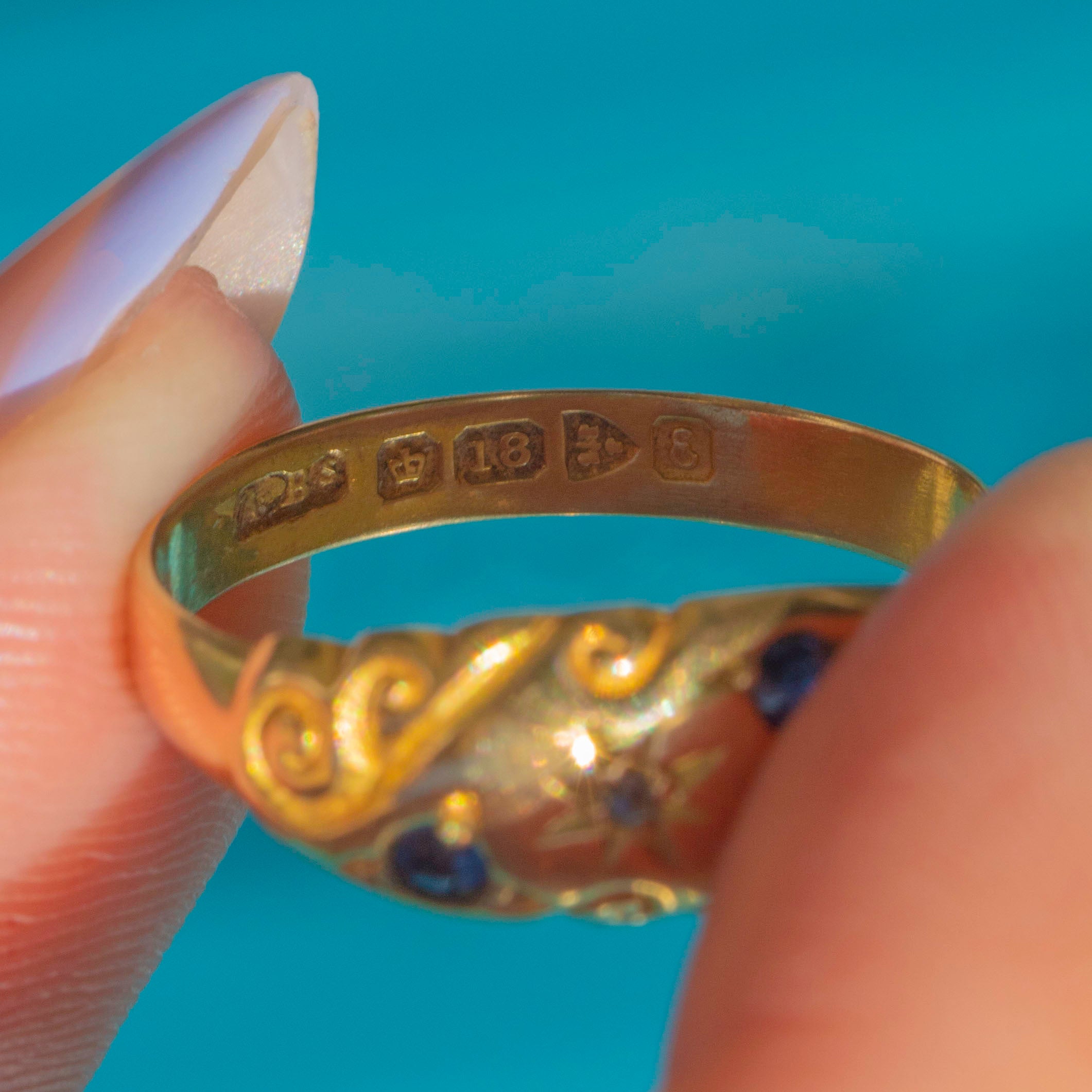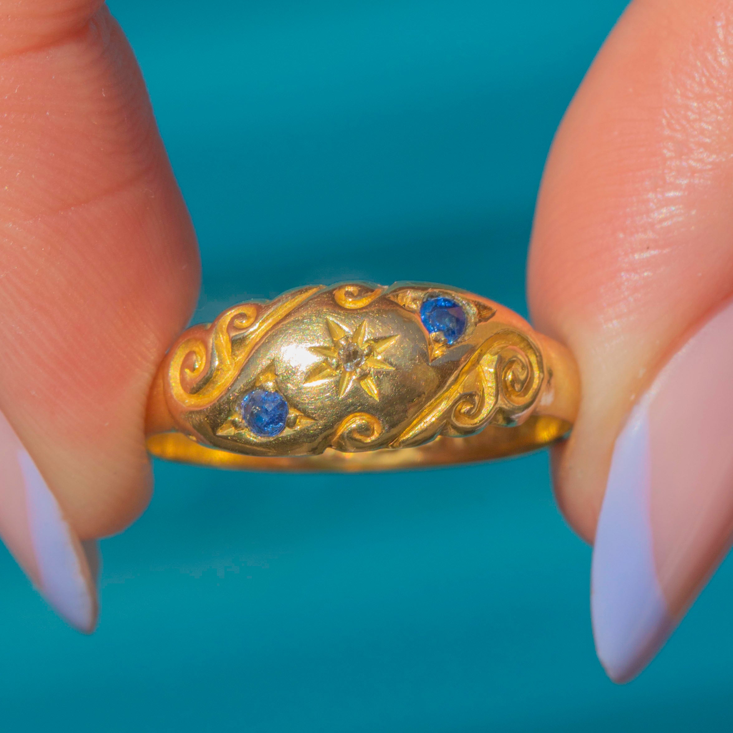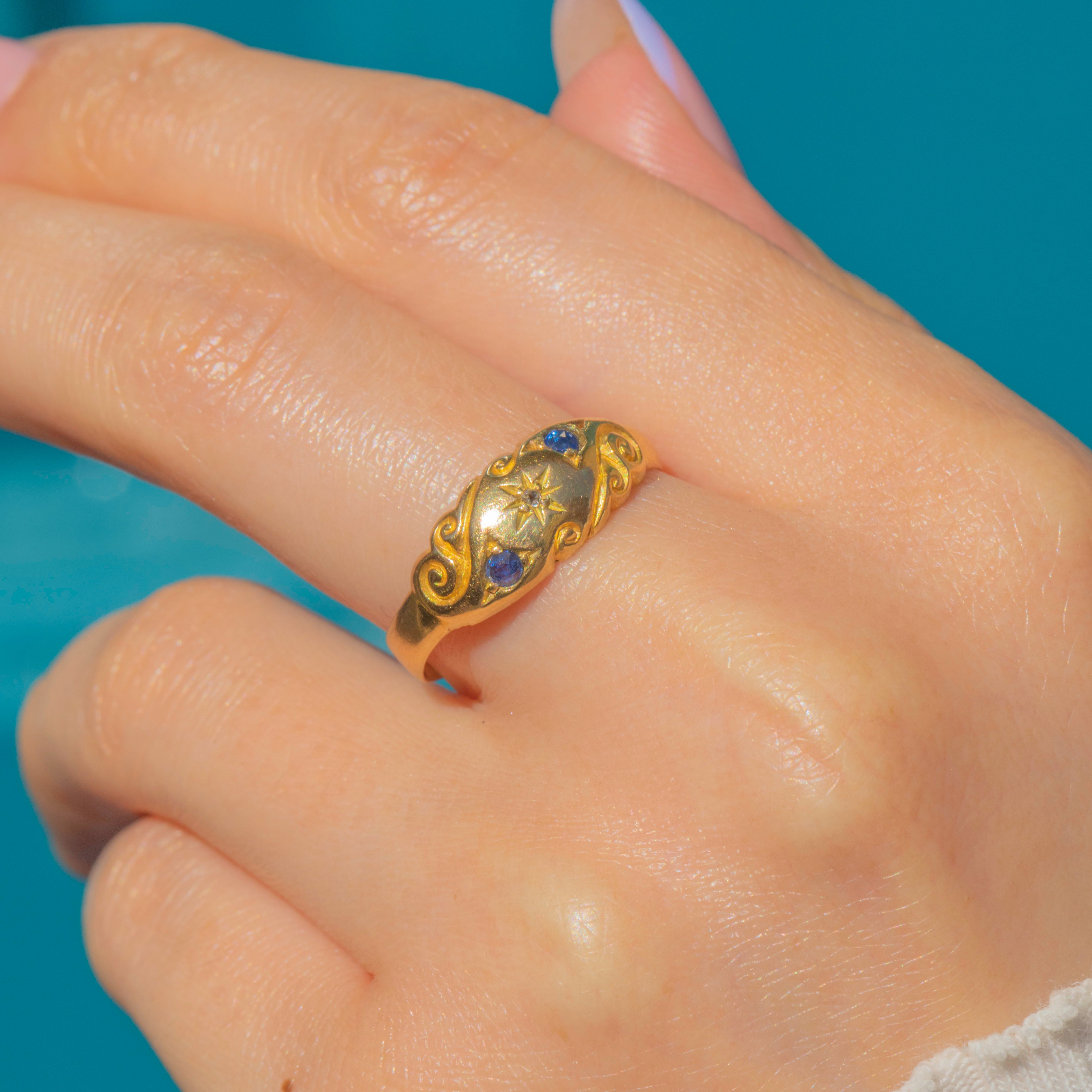 This Edwardian 18ct Gold Sapphire Diamond gypsy ring is a celestial dream! The gemstones are flush-set in distinct star settings, with whimsical engraved details curving around the trilogy to create an undeniably enchanting piece.