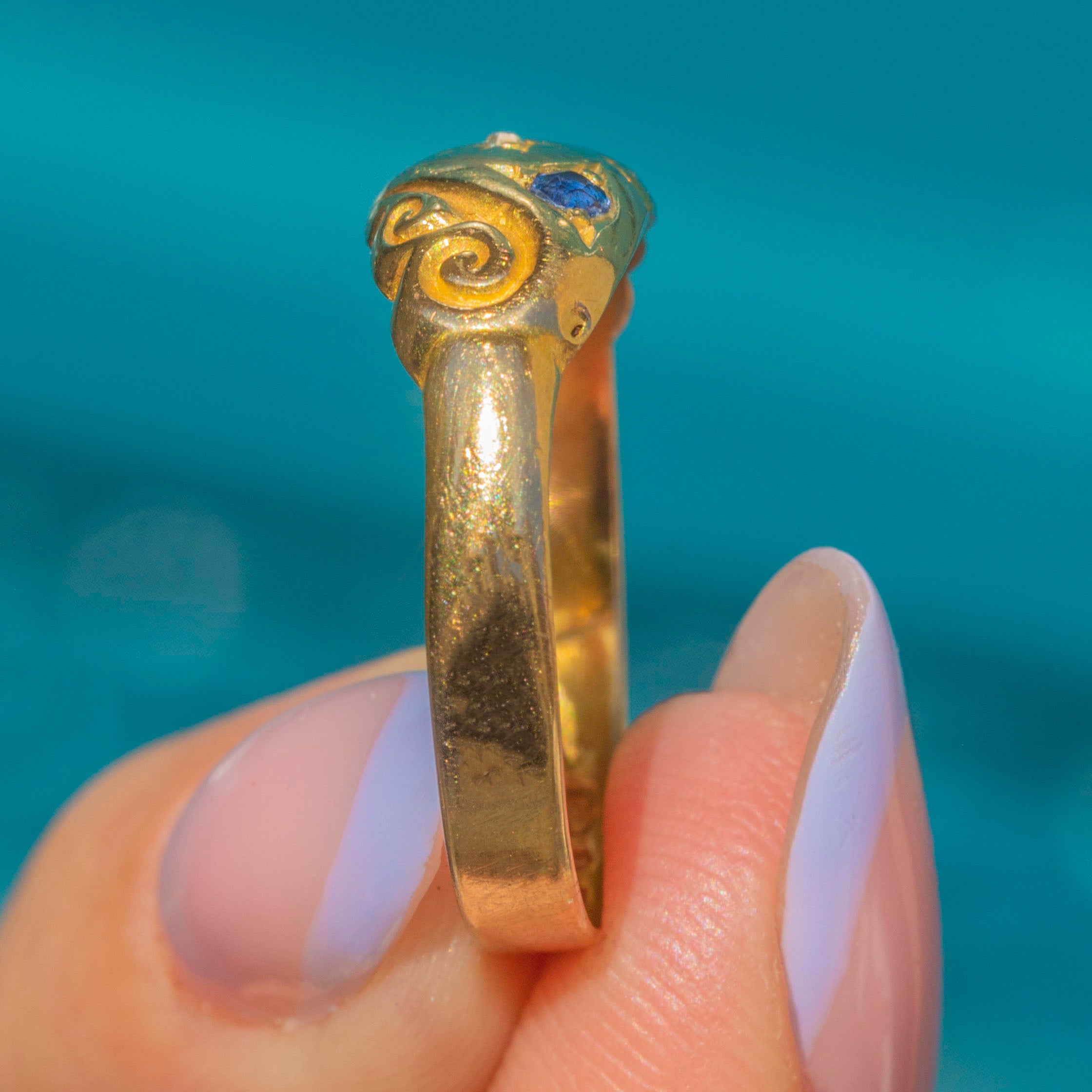 Crafted from solid 18ct Gold, the chubby ring band feels luxurious as it caresses the finger, with its low profile making it perfect for everyday wear. The inside of the band is fully hallmarked, including the rare Chester Assay stamp, dating this Edwardian gypsy ring to 1905, making it a highly coveted antique treasure!